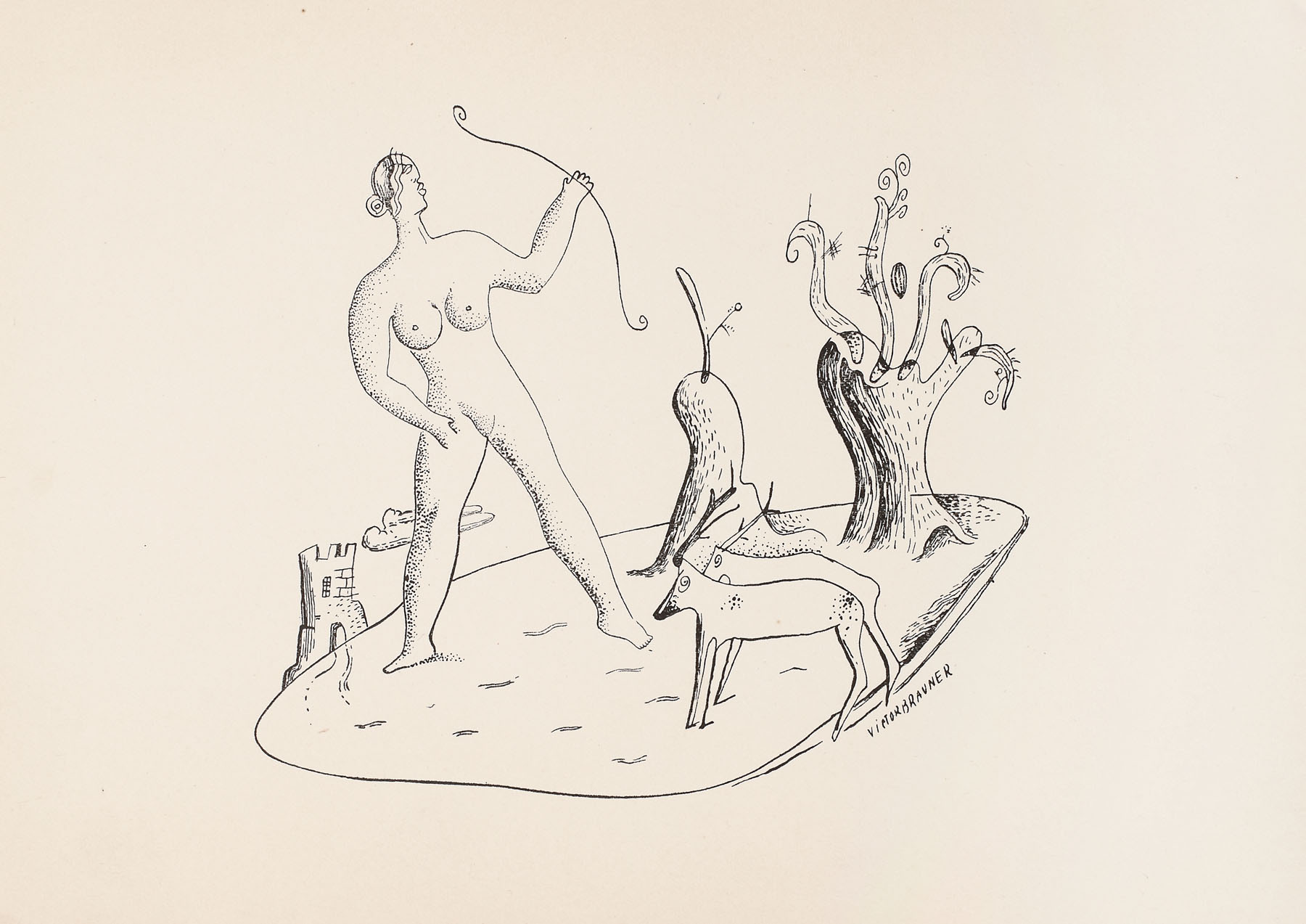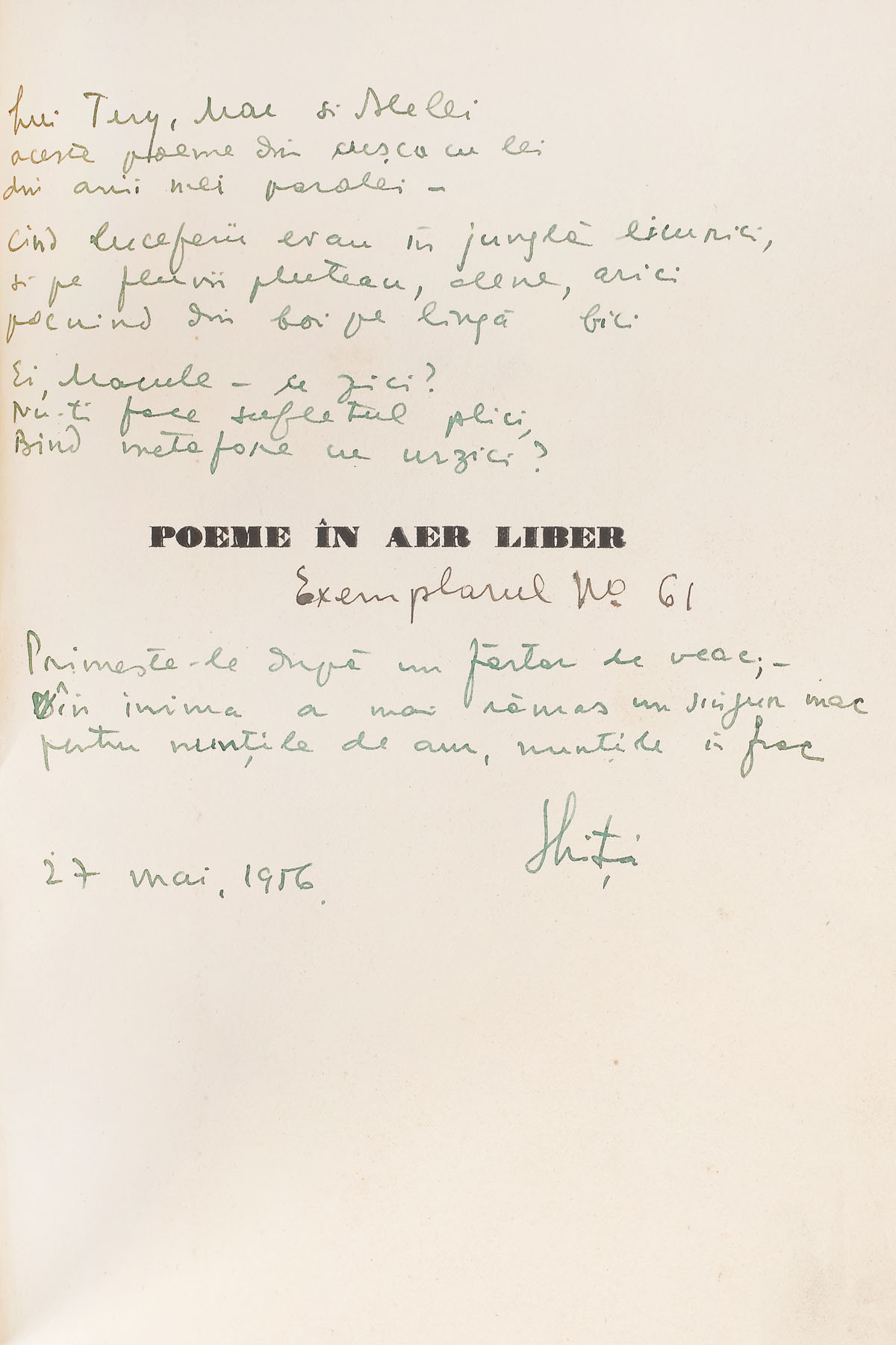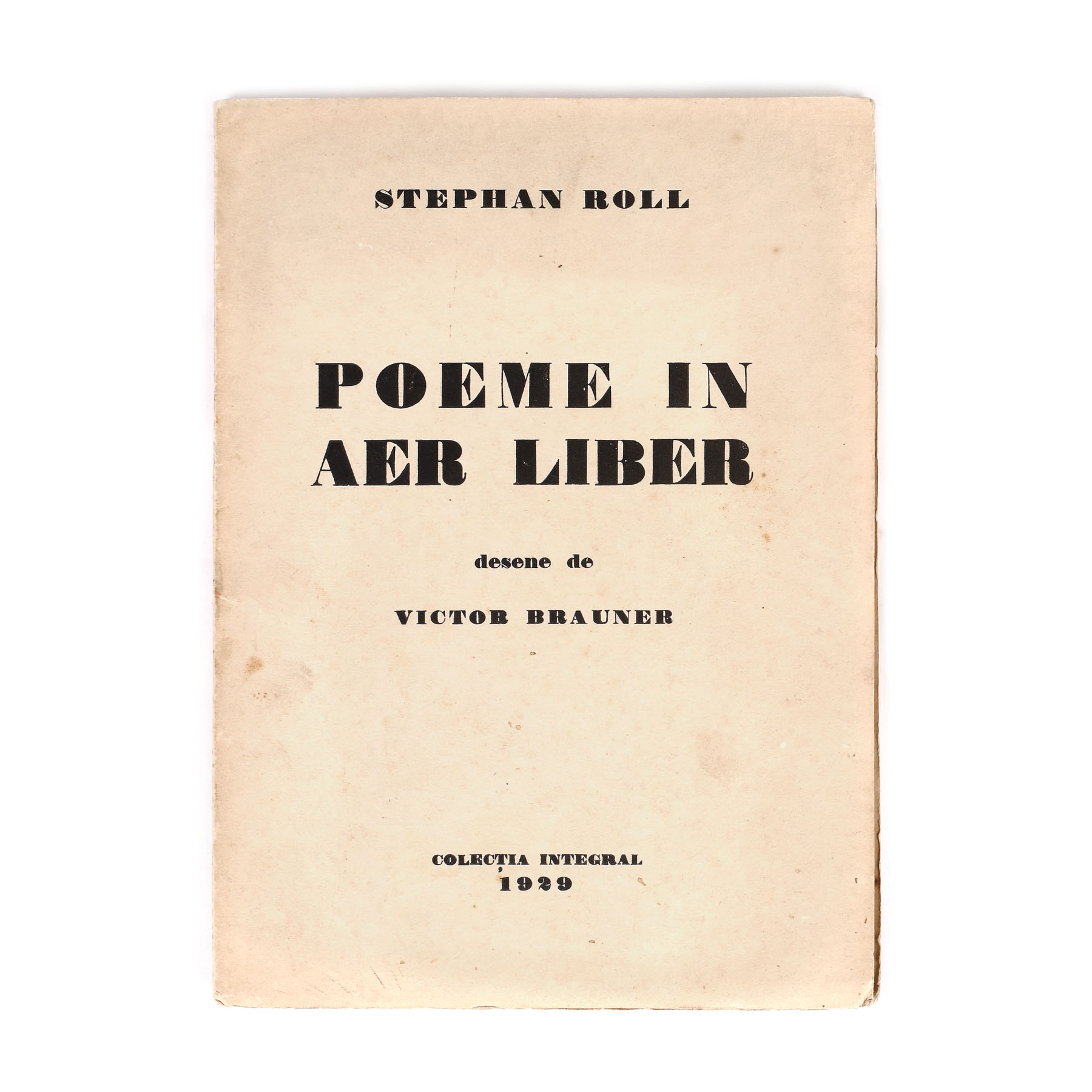 44. ”Poeme în aer liber”, de Stephan Roll, București, 1929, cu desene de Victor Brauner, dedicația și semnătura olografă a autorului către familia Macovescu, provine din colecţia fostului ministru de externe George Macovescu