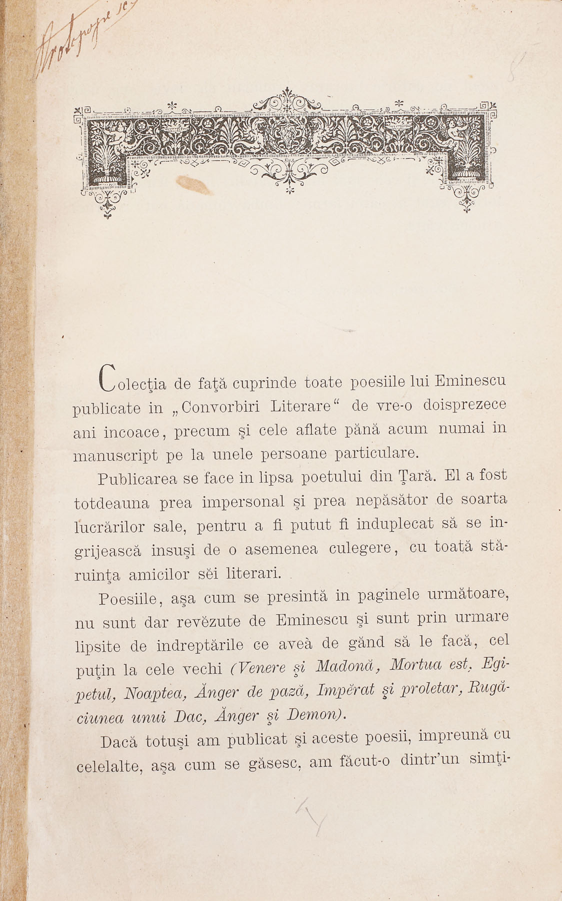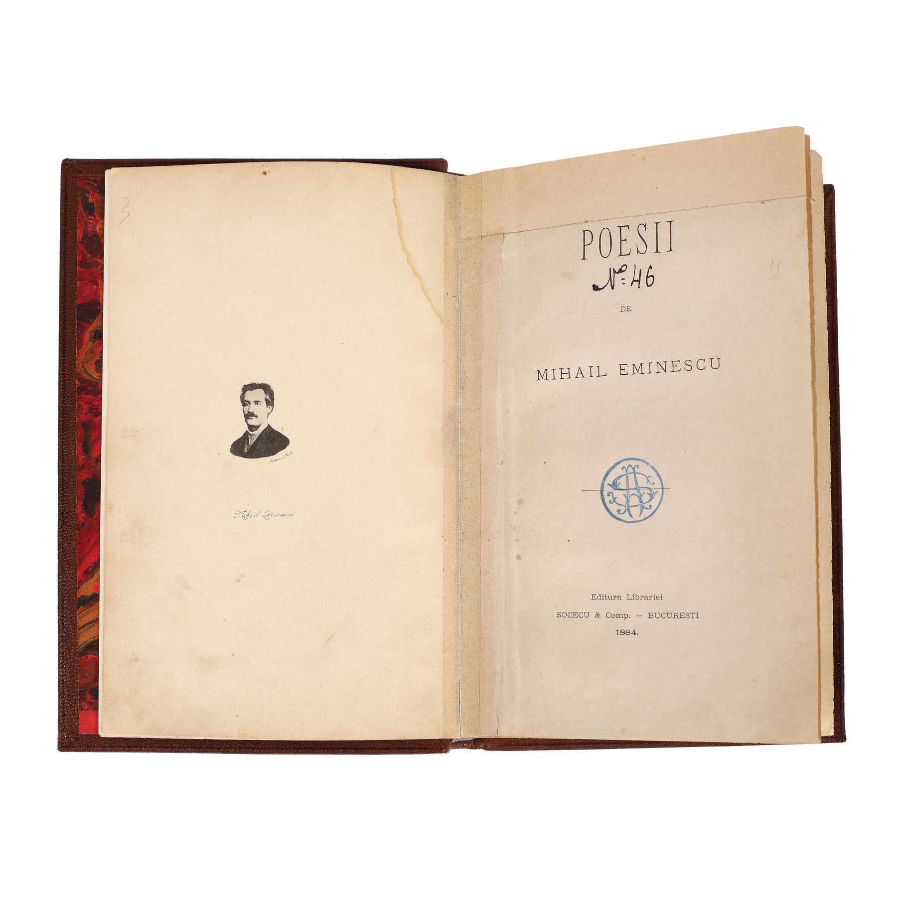 La 21 decembrie 1883 apare, la editura Socec, volumul „Poesii ” de Mihai Eminescu, sub redacţia lui Titu Maiorescu. Acest volum este primul şi singurul volum de poezii eminesciene tipărit în timpul vieţii poetului. Volumul conţine o selecţie de poezii eminesciene realizată de Titu Maiorescu, selecţie care cuprinde 61 de poezii, în principal antume, dintre care 26 în primă apariţie. Format in 4°, cu VI pagini și alte 306 pagini. Volumul prezintă o prefață semnată de Titu Maiorescu și 61 de poezii, unele cu variante publicate în Convorbiri Literare. Ca elemente grafice la începutul cărții găsim portretul peotului (fotografia în care apare cu mustață), semnătura sa, frontispicii și vignete finale, bogat decorate cu elemente florale, mascheron, putti, etc.. Legătura recentă din piele maron, pe carton, având cotorul cu sașe registre menționând autorul, titlul și anul apariției cărții. Prezintă ex-libris ștampilă "A.S.", însemnări pe text, cu creionul și câteva rânduri pe versoul paginii 307: ”Se bate miezul nopții (filozofică). Idee: echilibrul între viață și moarte. Nu vrea să moară căci ii e frică de necunoscut; nu vrea nici viața căci a suferit prea mult”.