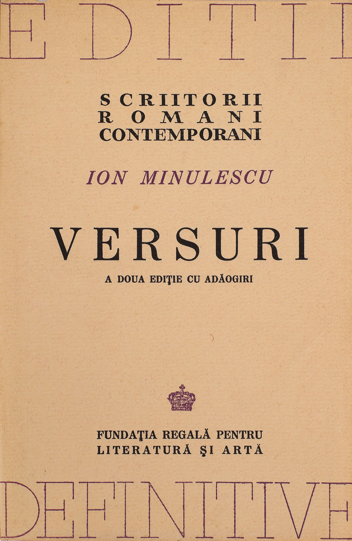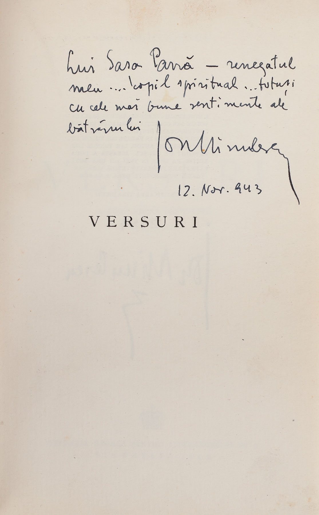26. ”Versuri”, de Ion Minulescu, București, 1943, cu dedicația și semnătura olografă a autorului către Sașa Pană, provine din colecția poetului avangardist Sașa Pană