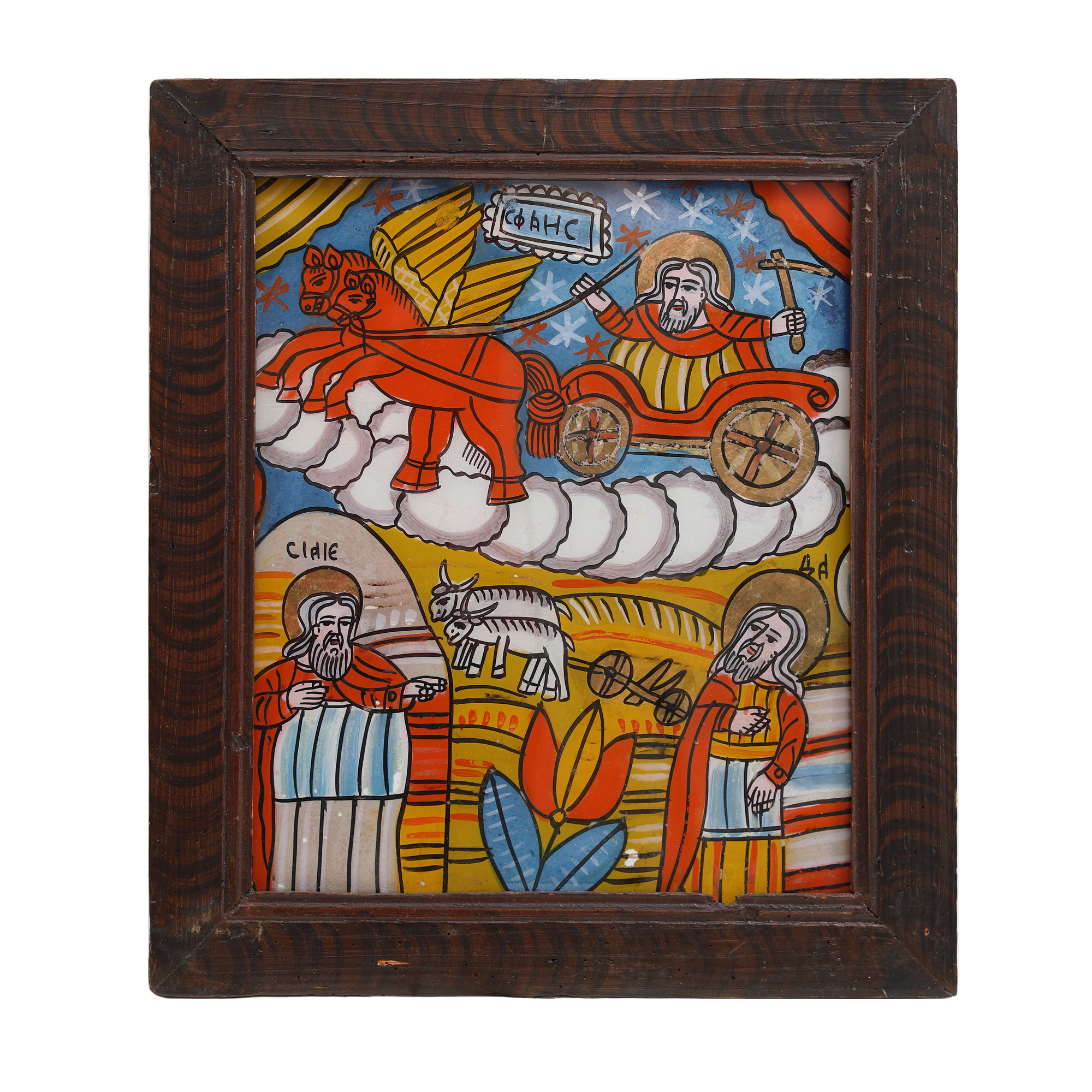 51. Icoană pe glajă, ”Înălțarea la cer a Sfântului Prooroc Ilie și scene din viața lui”, atelier din Șcheii Brașovului, a doua jumătate a sec. XIX