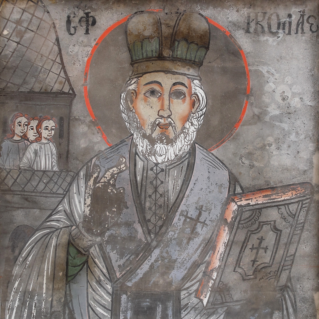 11. Icoană pe glajă, ”Sfântul Ierarh Nicolae, făcătorul de minuni”, atribuit zugrav Ioan Pop, Făgăraș, prima jumătate a sec. XIX, piesă rară, de colecție