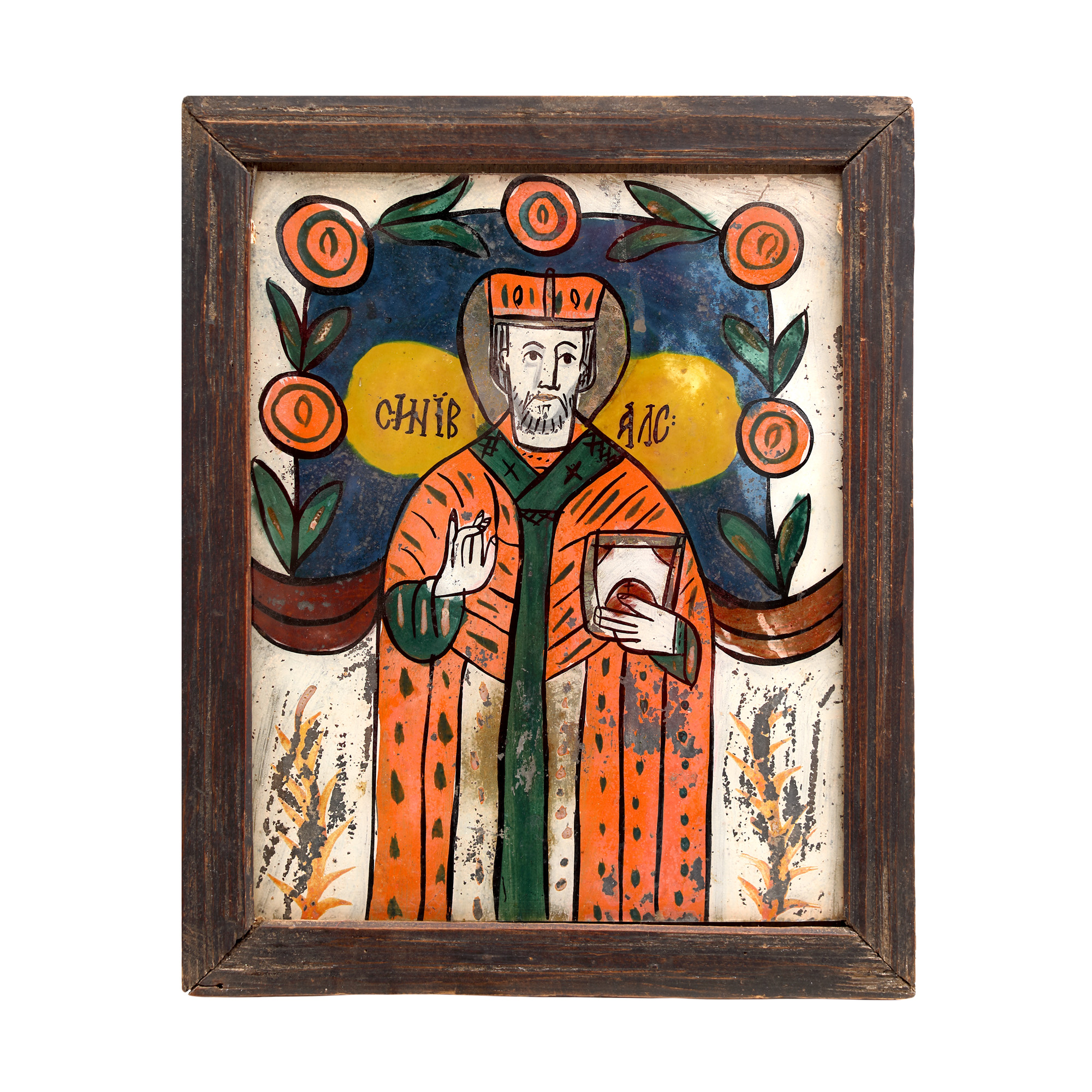 55. Icoană pe glajă, ”Sfântul Nicolae”, atelier din Nicula, sfârșitul sec. XIX