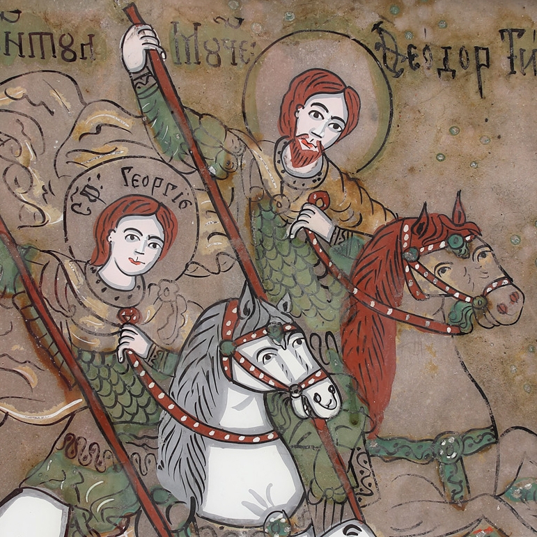 10. Icoană pe glajă, ”Sfinții Militari Gheorghe și Teodor Tiron”, atribuit zugrav Nicolae Oancea din Vale, Mărginimea Sibiului, a doua jumătate a sec. XIX