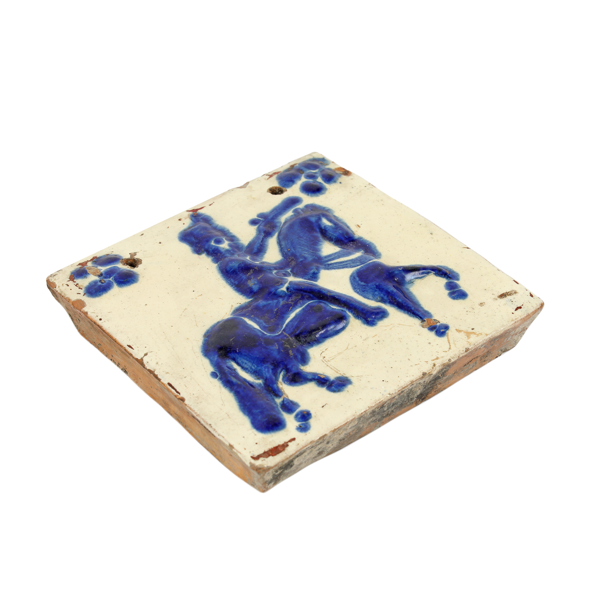 26. Cahlă transilvăneană din lut smălțuit, decorată cu soldat călare în galop, Bistrița, începutul sec. XIX