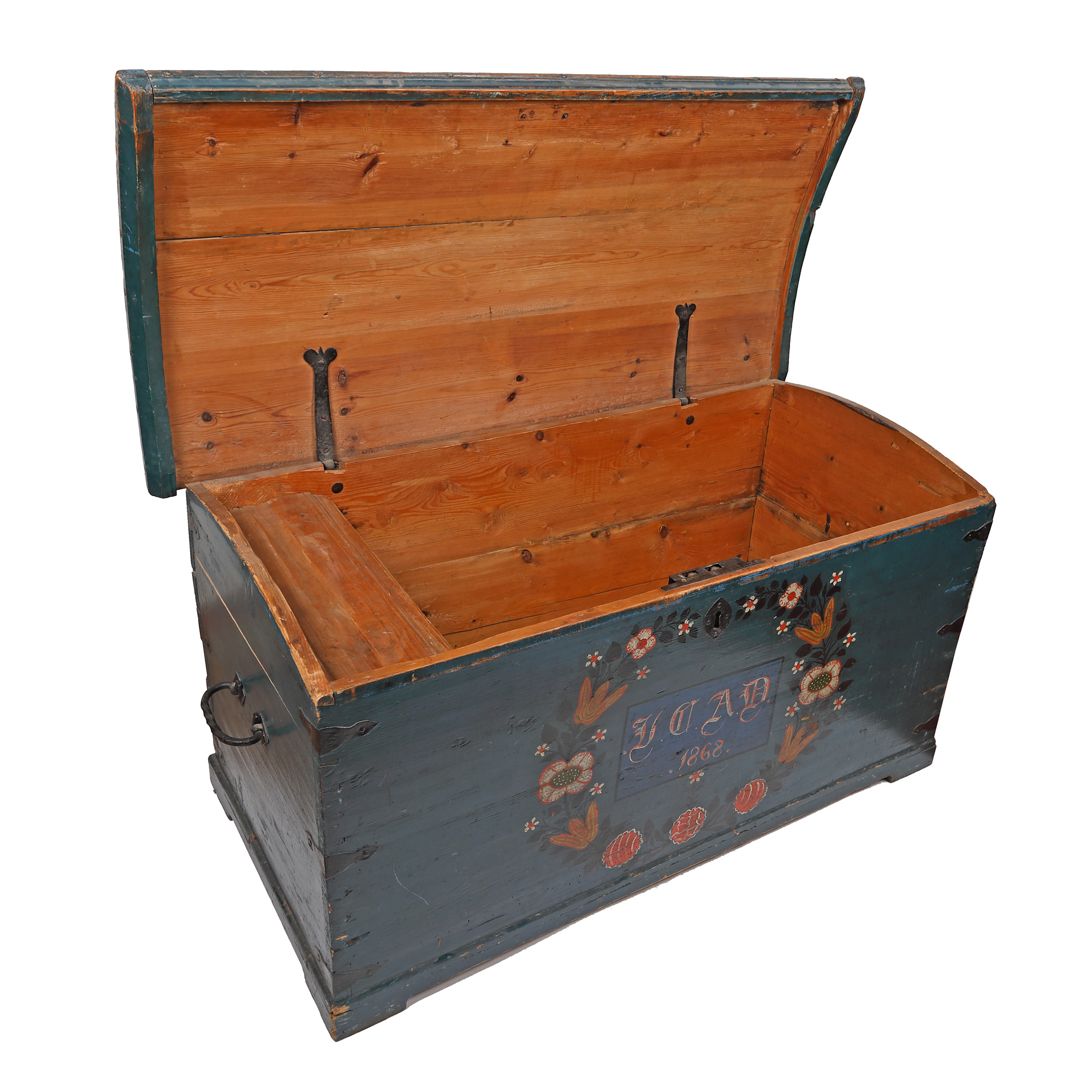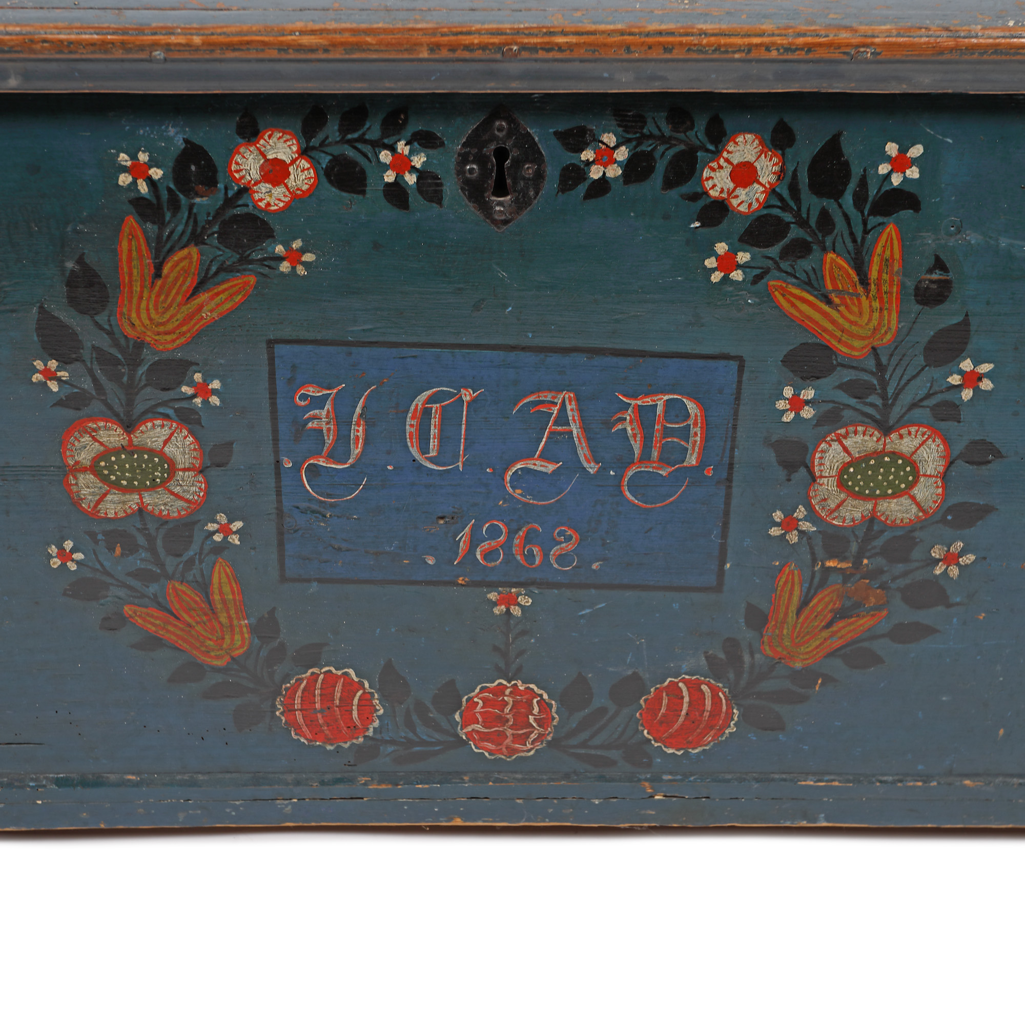 33. Ladă de zestre svăbească, din lemn pictat cu bujori și lalele, inscripționată și datată ”I.O.A.D. 1862”, Banat, piesă rară