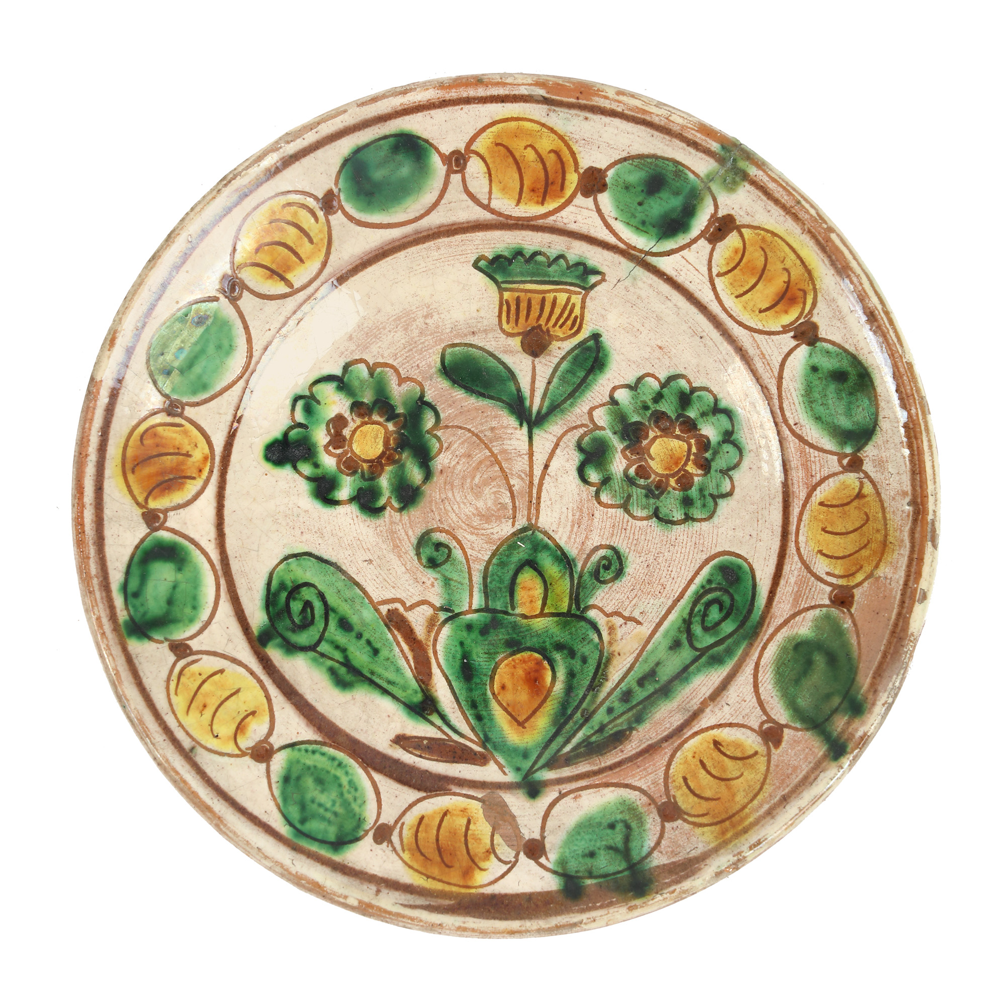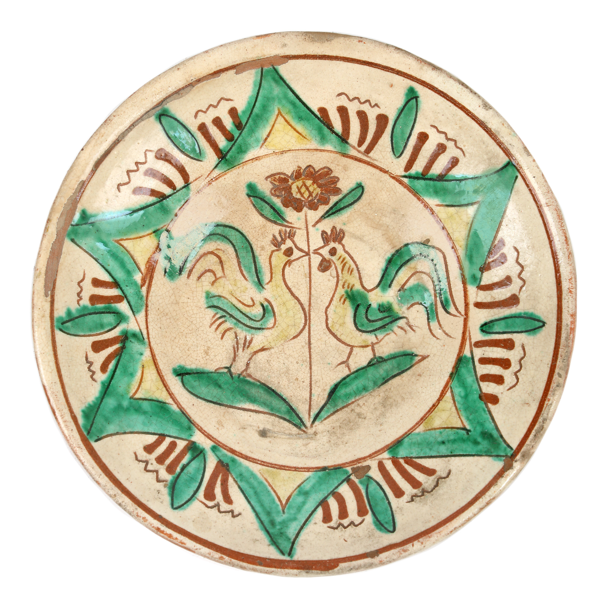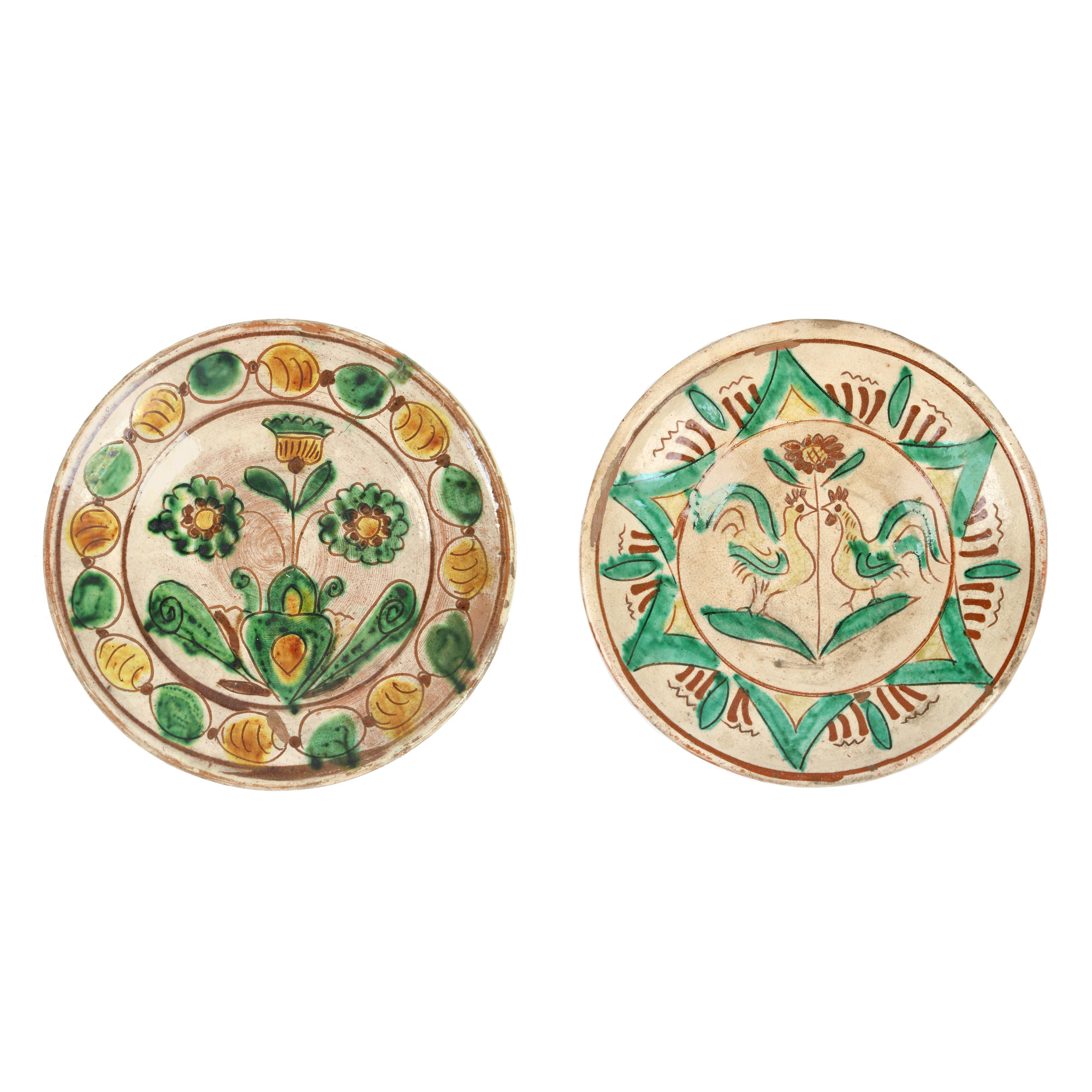 42. Lot format din două farfurii din ceramică tip Kuty, decorate cu cocoși și motive florale, semnate Constantin Colibaba, prima jumătate a sec. XX