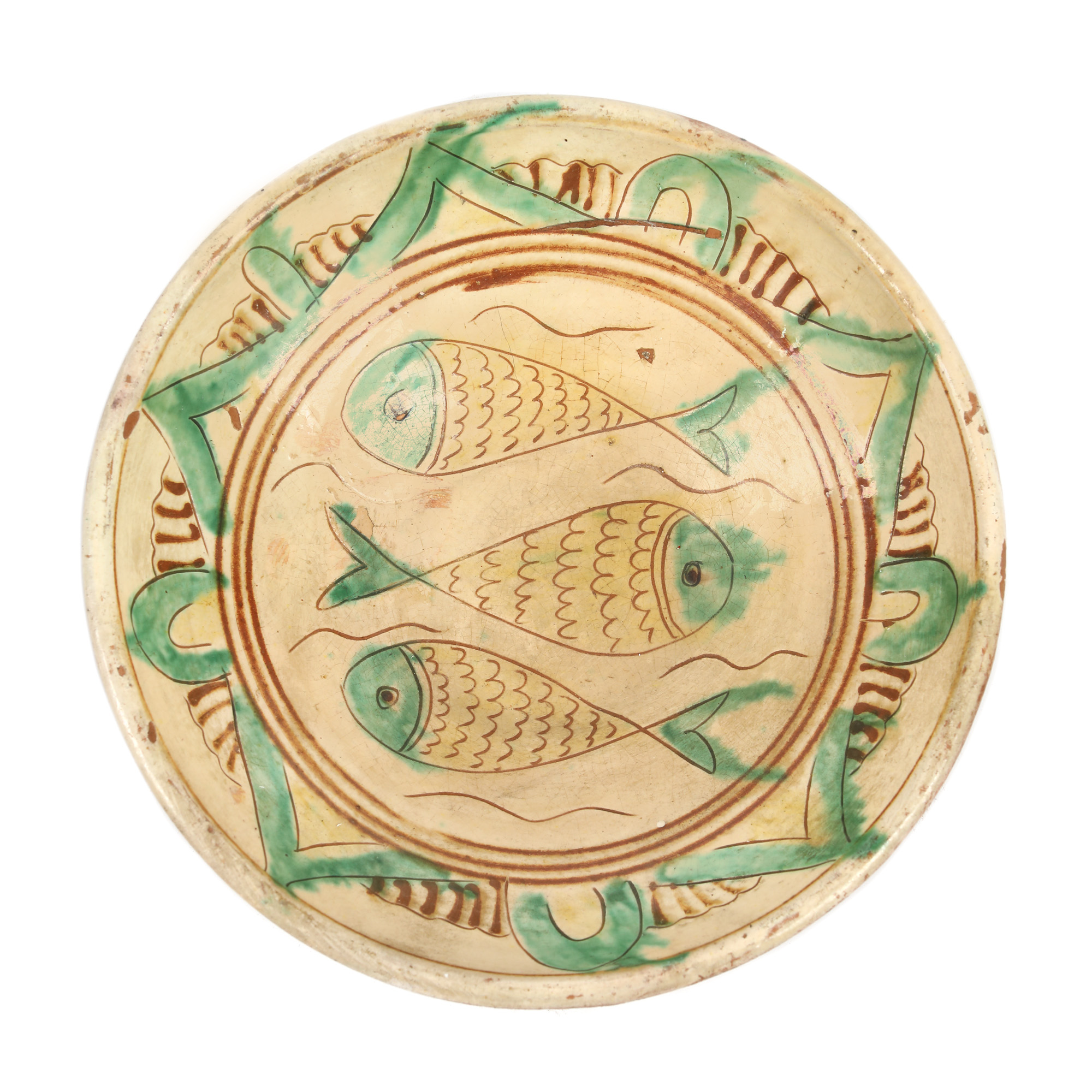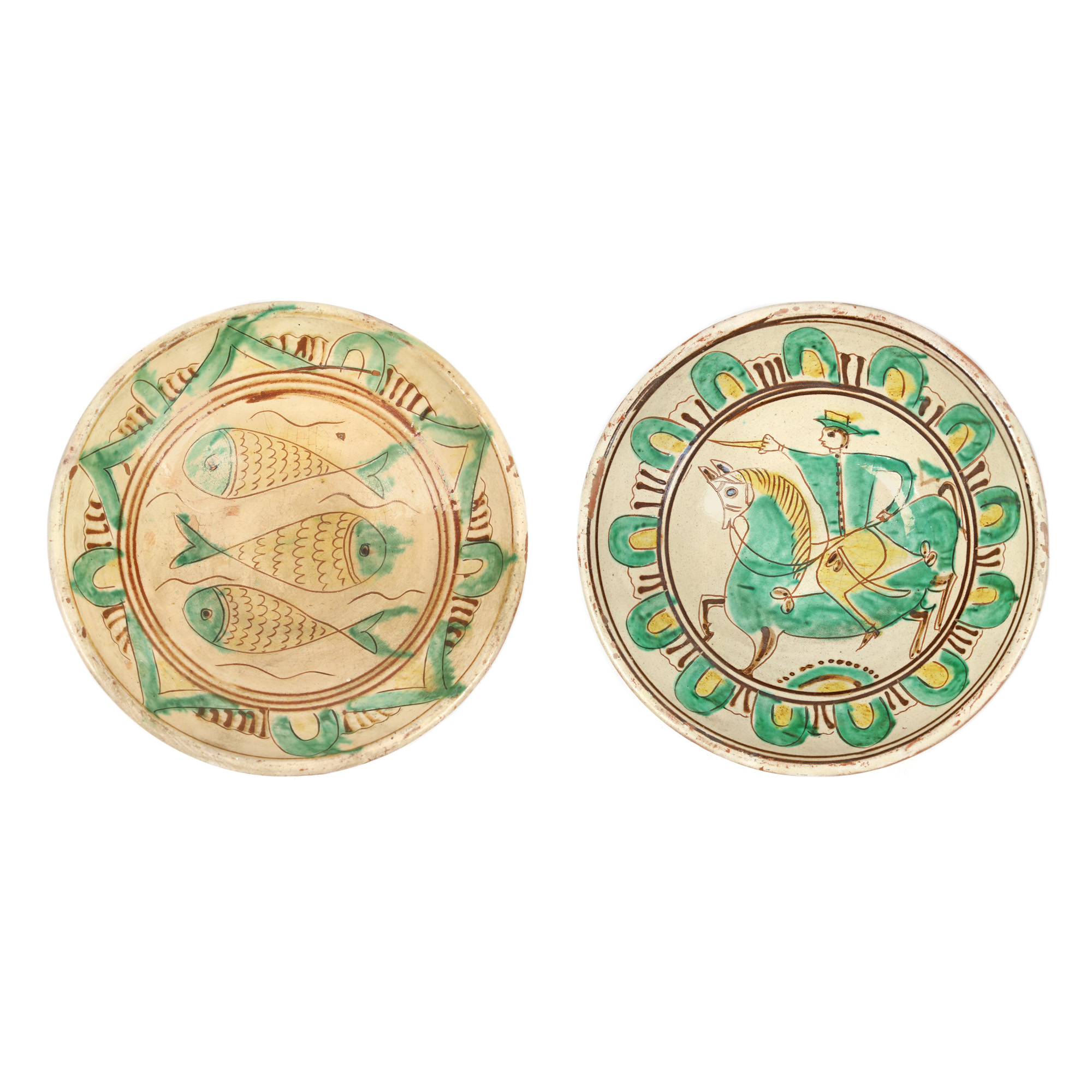 41. Lot format din două farfurii din ceramică tip Kuty, decorate cu nuntaș și pești, semnate Constantin Colibaba, prima jumătate a sec. XX