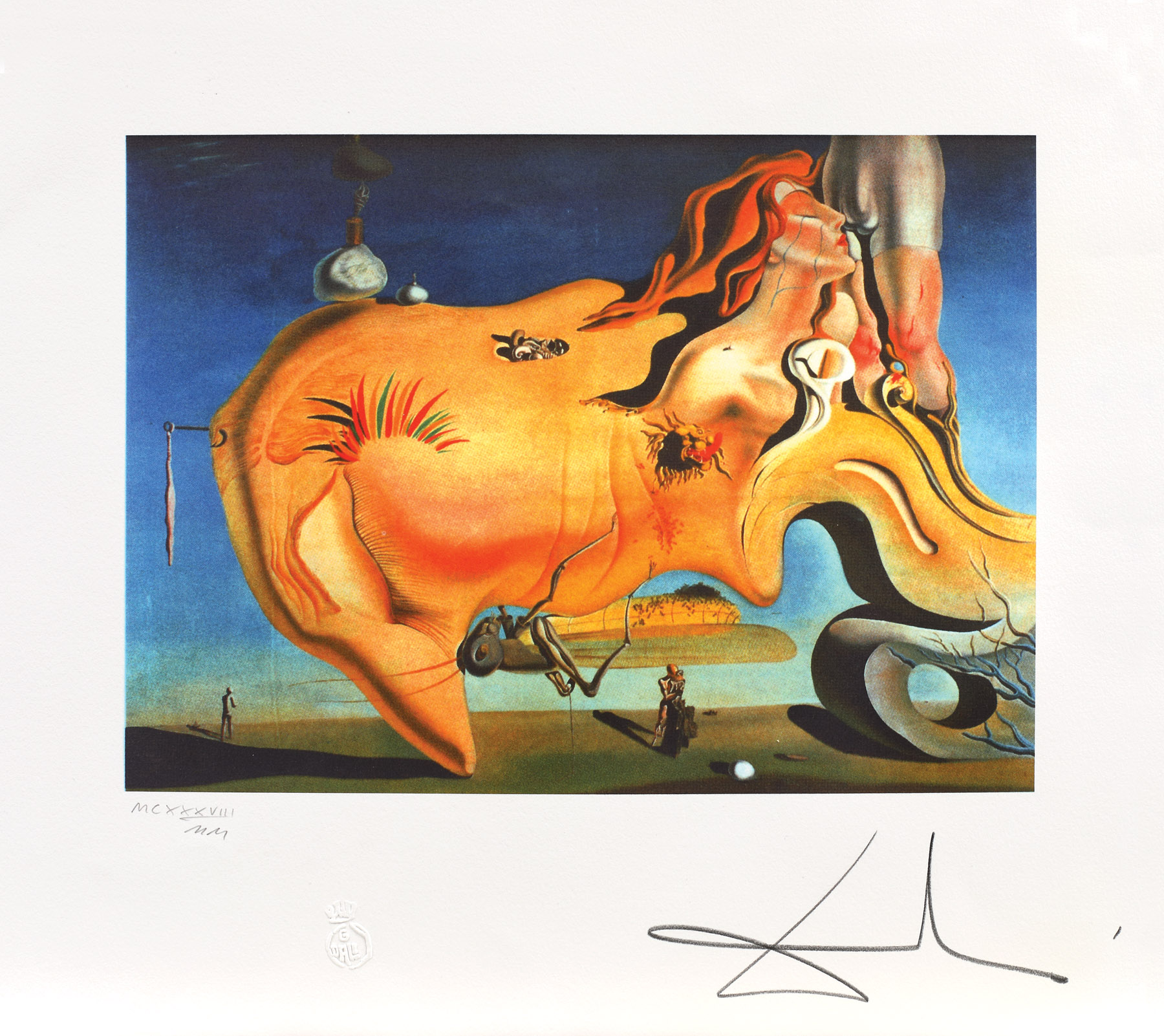 semnat dreapta jos, sub cadru, în cărbune, "Dali"; numerotat stânga jos, sub cadru, în creion, "MCXXXVIII/MM"; stânga jos, sub cadru, ştampila editurii, "G. Dali"