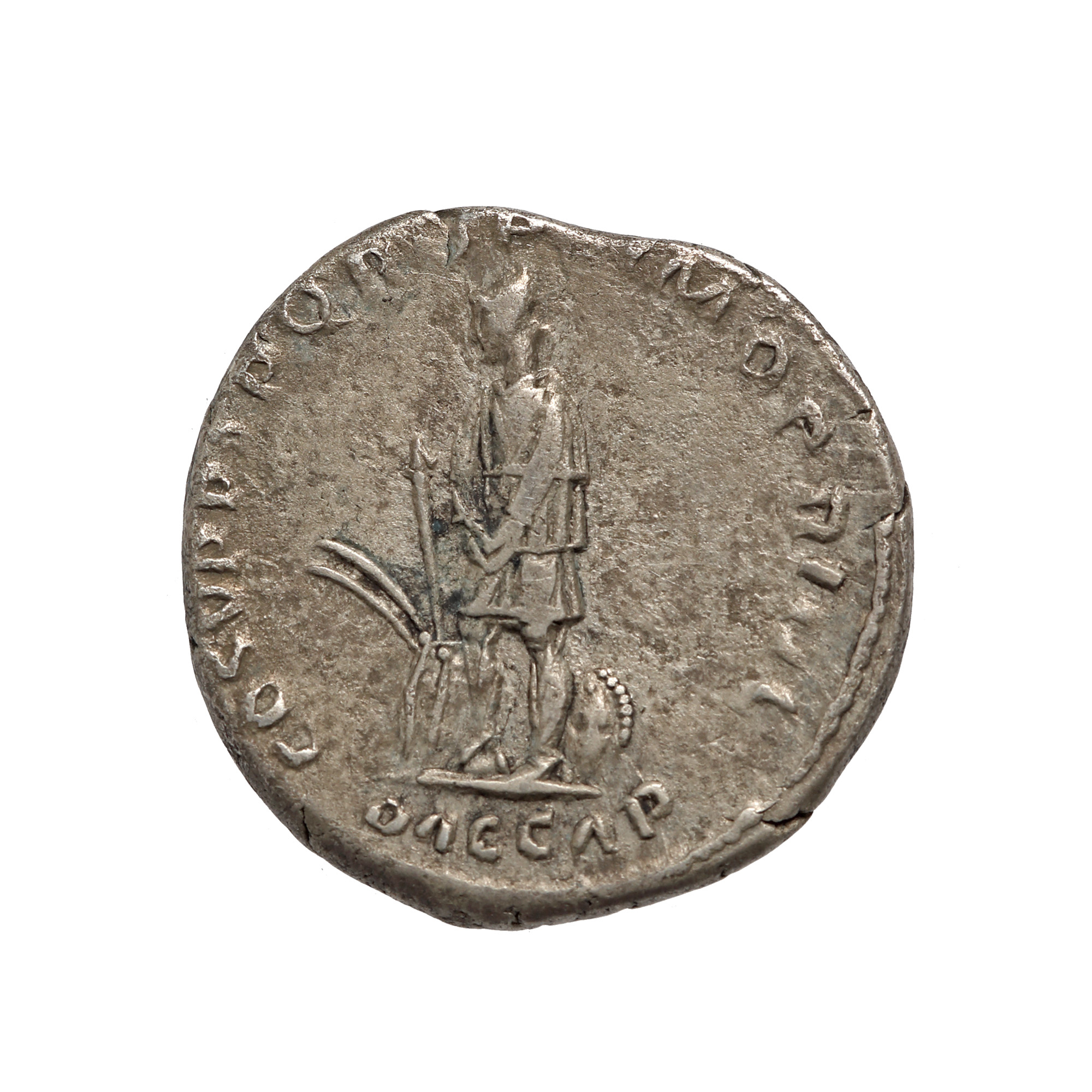 Legendă avers: IMP TRAIANO AVG GER DAC P M TR P COS V P P Legendă revers: COS V P P S P Q R OPTIMO PRINCIPI / DAC CAP Moneda prezintă pe avers bustul laureat al Împăratului Traian orientat spre dreapta, alături de abrevierea legendei în latină „Imperator, Caesar, Nervae Traiano Augustus, Germanicus, Dacicus, Pontifex Maximus, Tribunicia Potestate, Consul Quintum, Pater Patriae", în timp ce reversul ilustrează figura unui dac aflat în captivitate, alături de o suliță, două săbii și două scuturi.", înconjurat de inscripția prescurtată de la sintagma „Consul Quintum, Pater Patriae, Senatus Populusque Romanus, Optimo Principi, Dacia Capta".
