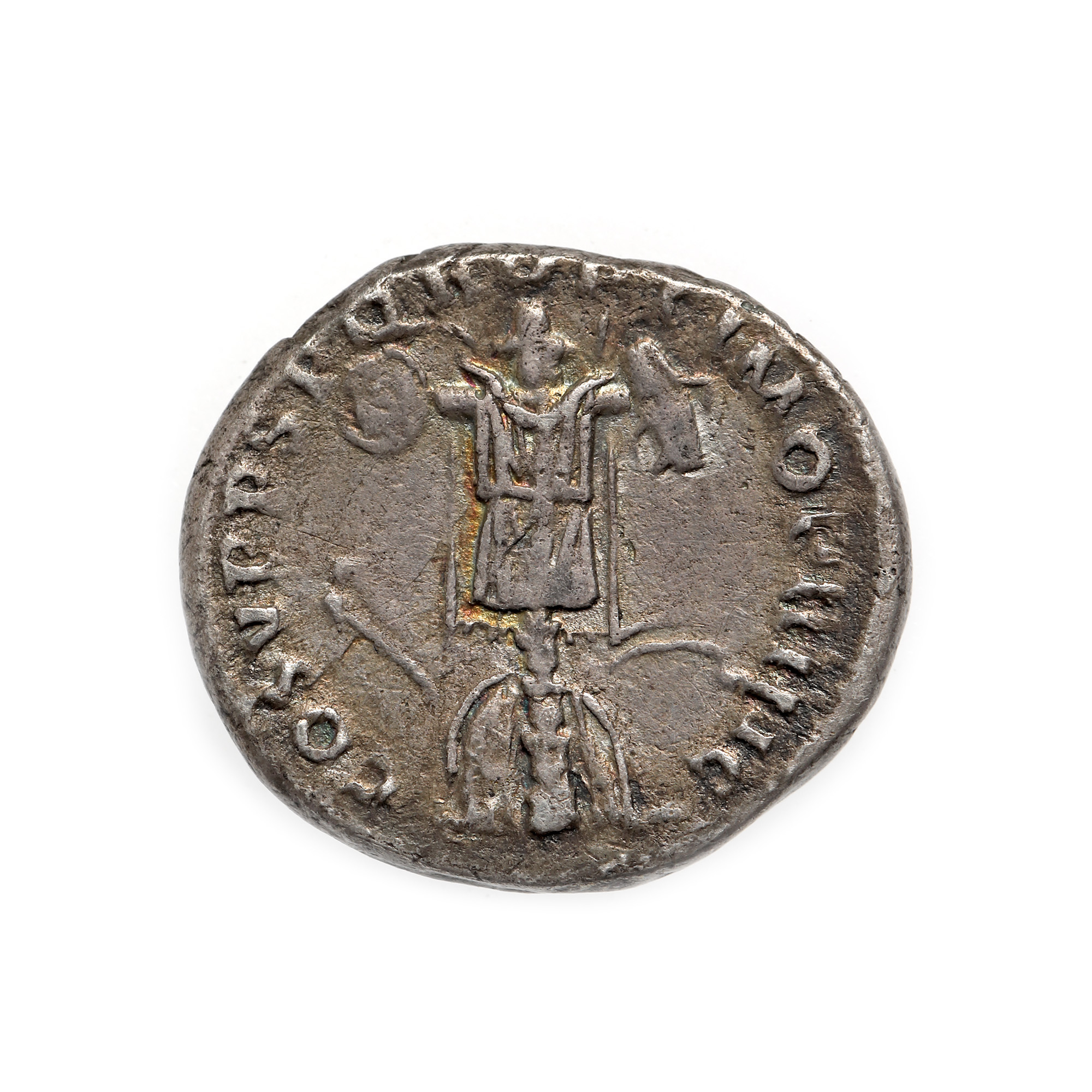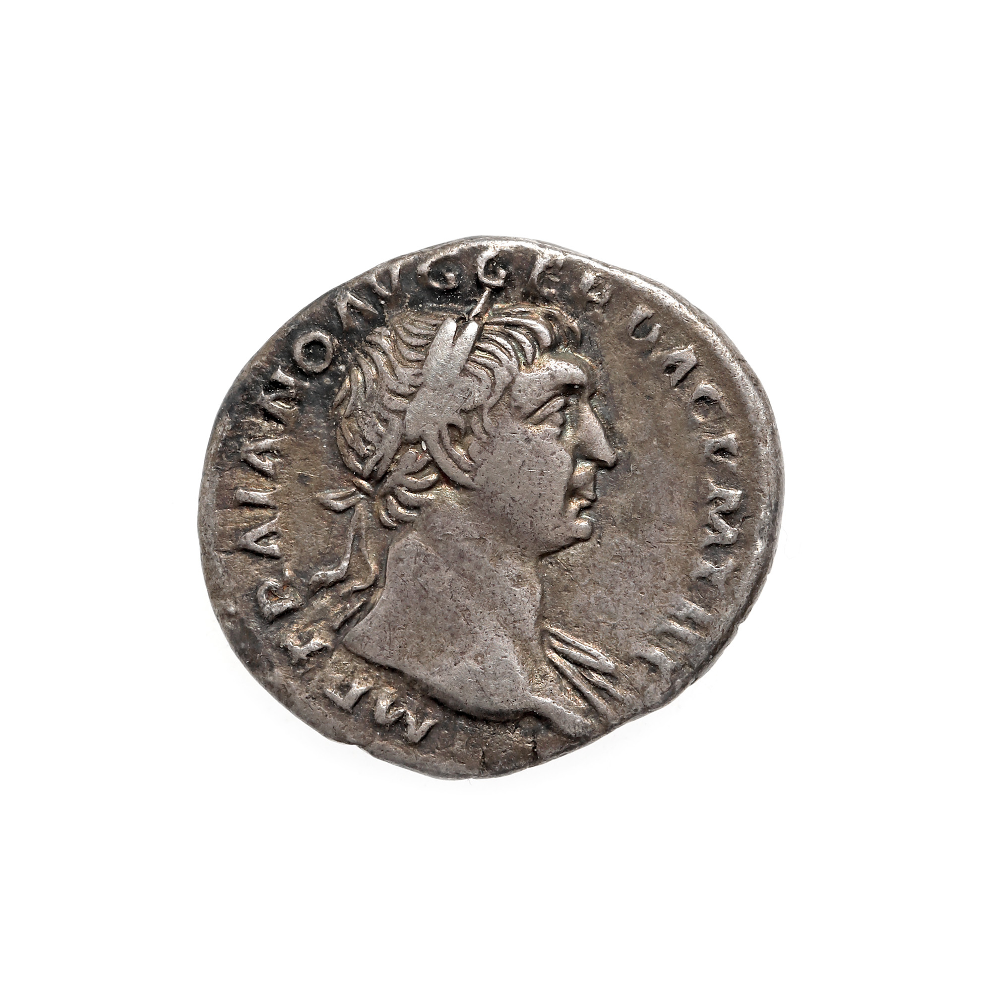 55F. Monedă Denarius, Traian, tip Trofeul Armelor, 107 e.n., argint