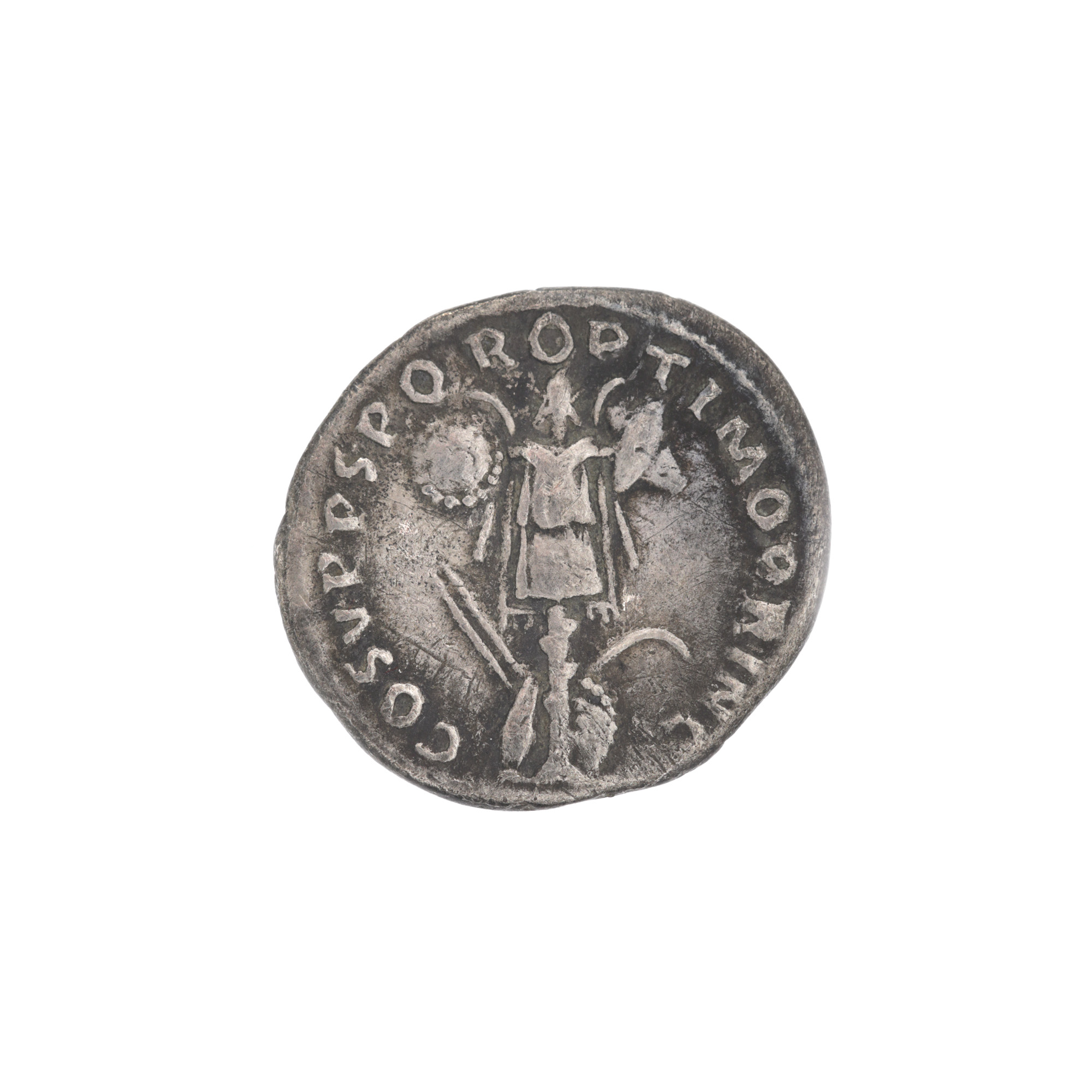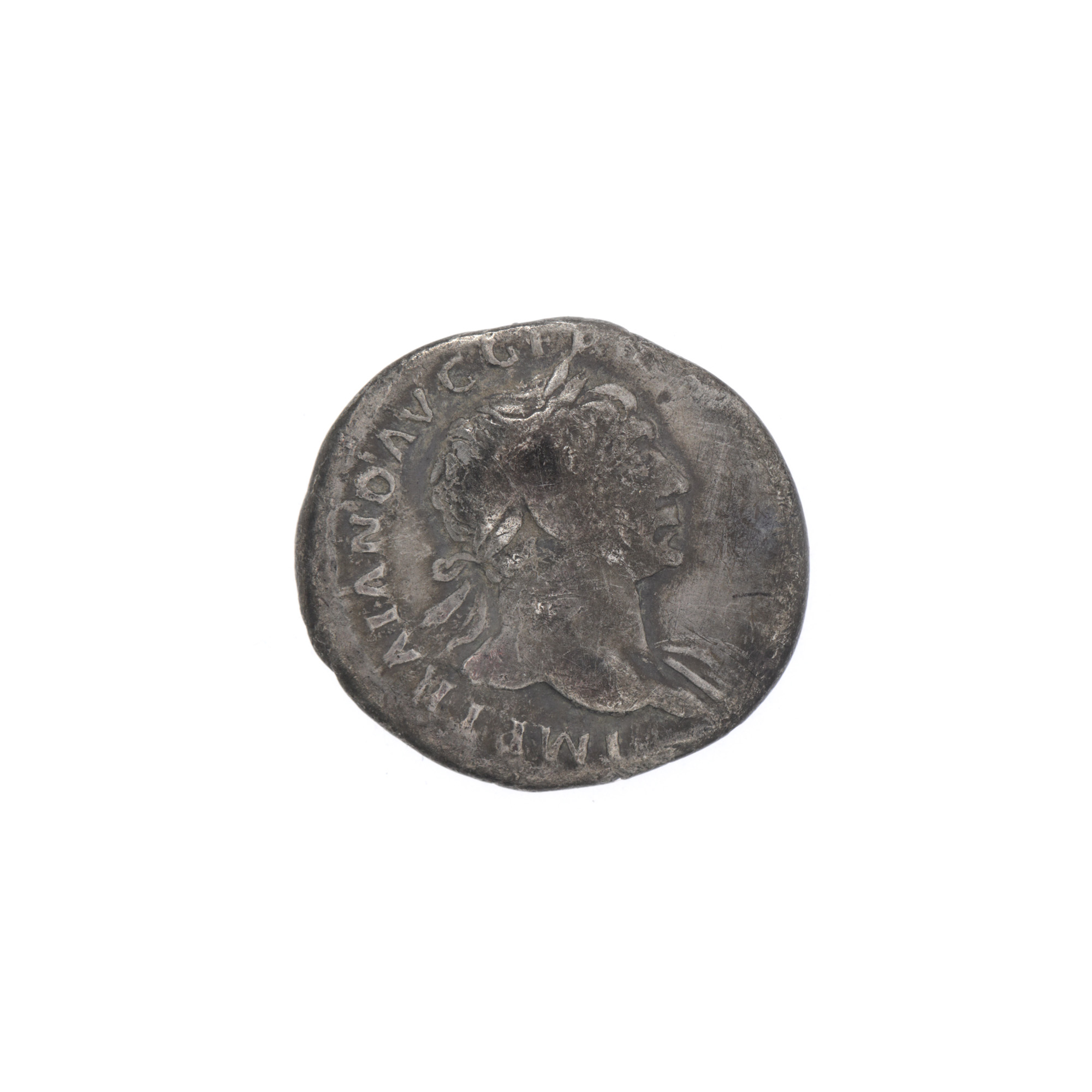 41F. Monedă Denarius, Traian, tip Trofeul Armelor, imortalizat prin monumentul de la Adamclisi, 107 e.n., argint