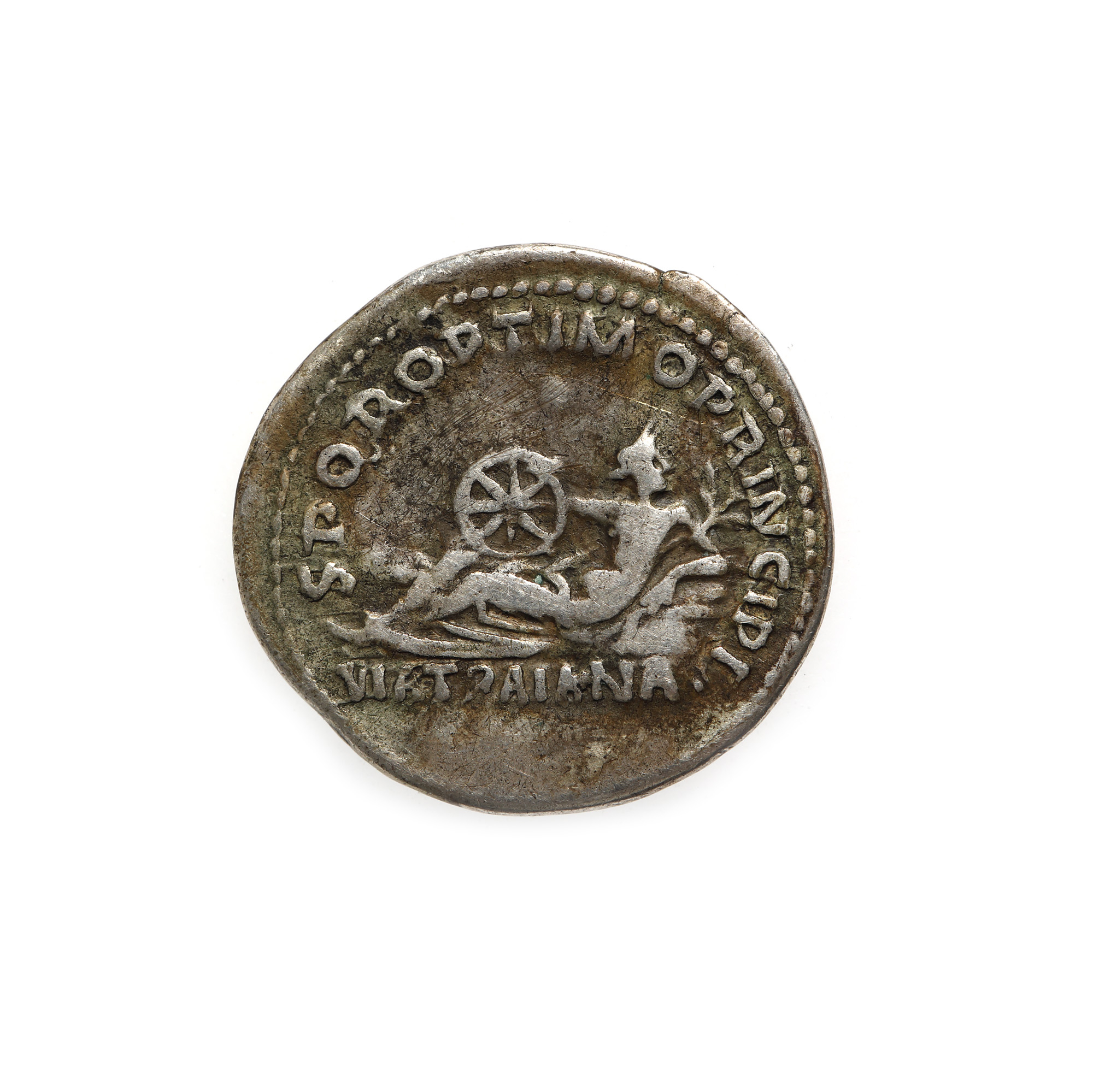 52F. Monedă Denarius, Traian, tip Via Traiana, 112-114 e.n., argint, piesă rară