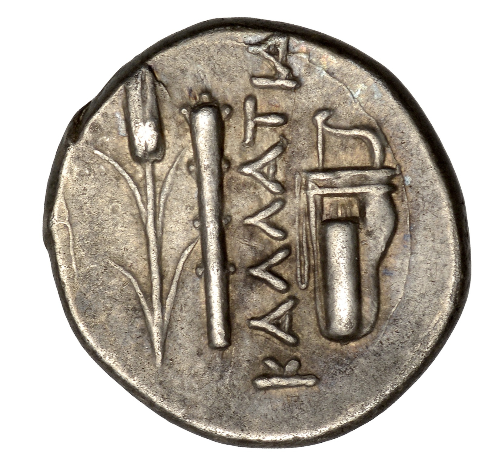 Legendă avers: capul lui Hercule purtând blana de leu, orientat spre dreapta Legendă revers: KALLATIA, alături de un spic de grâu și o bâtă deasupra și de o tolbă cu un arc în partea inferioară. Cel de-al doilea oraş pontic care a bătut monedă a fost Callatis. Despre întemeierea la sfârşitul secolului al VI-lea a.Chr. a oraşului Callatis (astăzi Mangalia, România), colonie de origine doriană, există informaţii de la Pseudo – Scymnos, care arată că aceasta a fost înfiinţată de grecii veniţi din Heracleea Pontică (azi Eregli, în Turcia). Primele emisiuni ale coloniei Callatis sunt drahmele de argint, bătute după sistemul ponderal aeginetic (de la Aegina) folosit si în oraşe ca Heraclea Pontică, Bysantion şi Sinope. Pe avers apare Herakles imberb, strămoşul mitic al grecilor din Callatis, cu blana leului din Nemea pe cap, iar pe revers, alaturi de spicul de grâu, se afla armele eroului grec, măciuca, arcul şi tolba cu săgeţile înveninate cu sangele Hydrei din Lerna