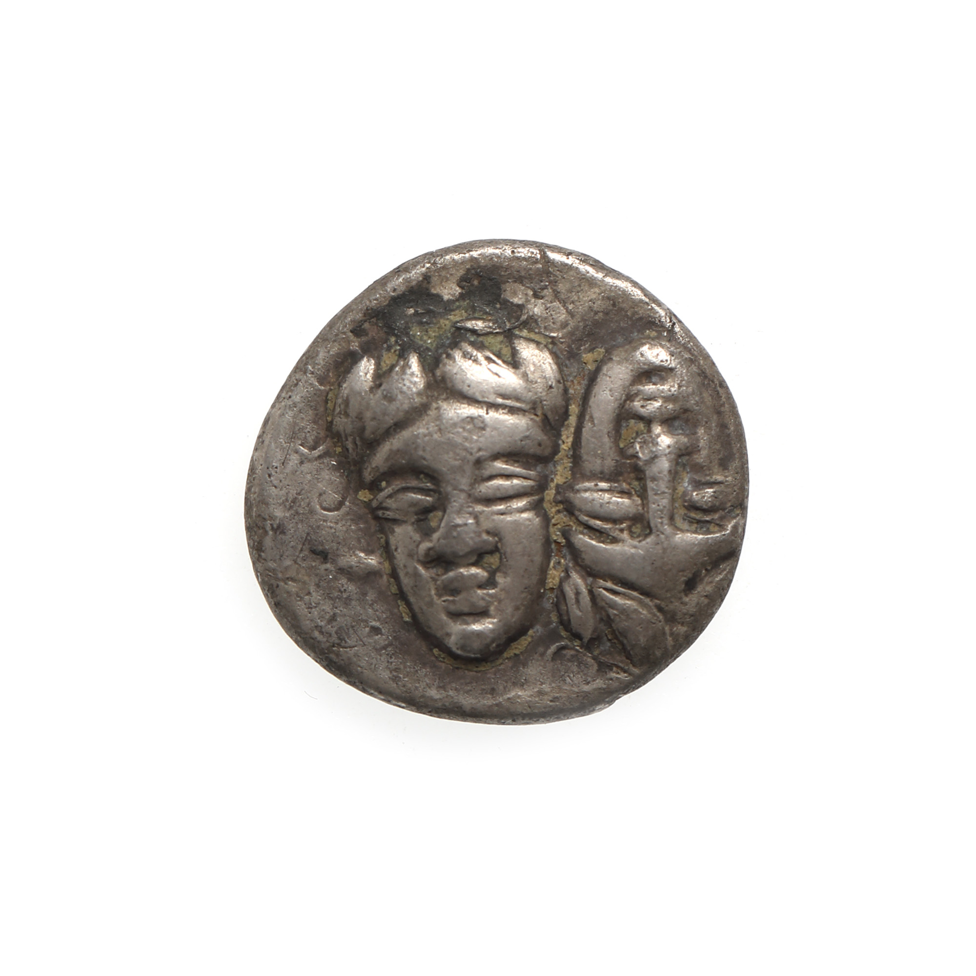 4Т. Monedă Drahmă, tip Gemenii - cele două fețe ale Dunării, Histria, 434-300 î.e.n., argint