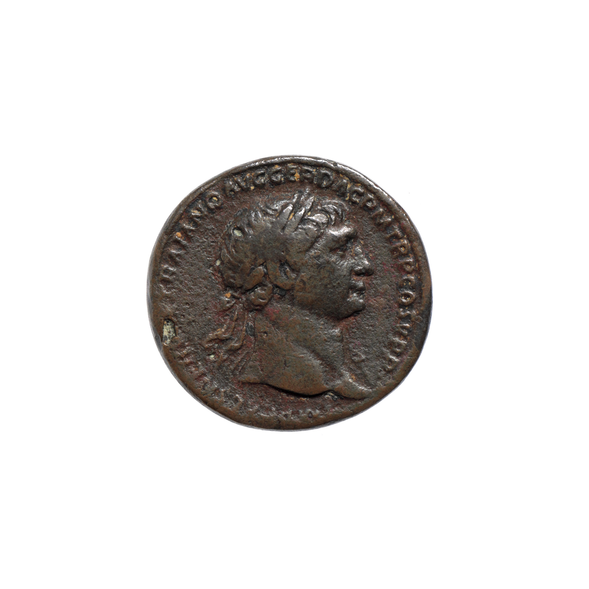Legendă avers: ”IMP CAES NERVAE TRAIANO AVG GER DAC P M TR P COS V P P” Legendă revers: ”S P Q R OPTIMO – PRINCIPI” În calitate de împărat, între anii 98 și 117, Traian a extins Imperiul Roman pentru a deveni mai mare decât oricând. A cucerit Dacia, care a oferit pământ coloniștilor romani și acces la bogatele rezerve de aur și sare. Legenda de pe avers reprezintă abrevierea titulaturilor de Imperator, Caesar, Nervae Traiano Augustus, Germanicus, Dacicus, Pontifex Maximus, Tribunicia Potestate, Consul Quintum, Pater Patriae, în timp ce pe revers regăsim Senatus Populusque Romanus Optimo Principi.