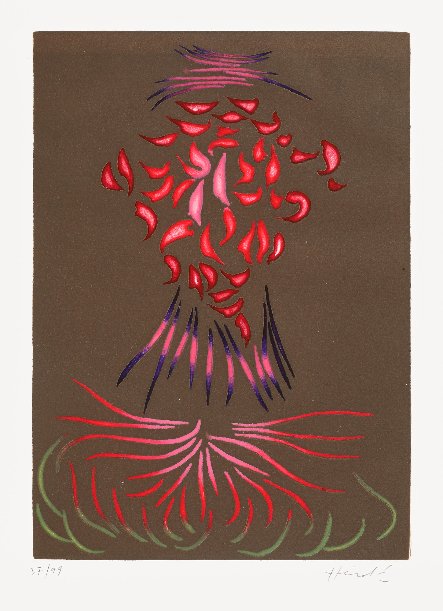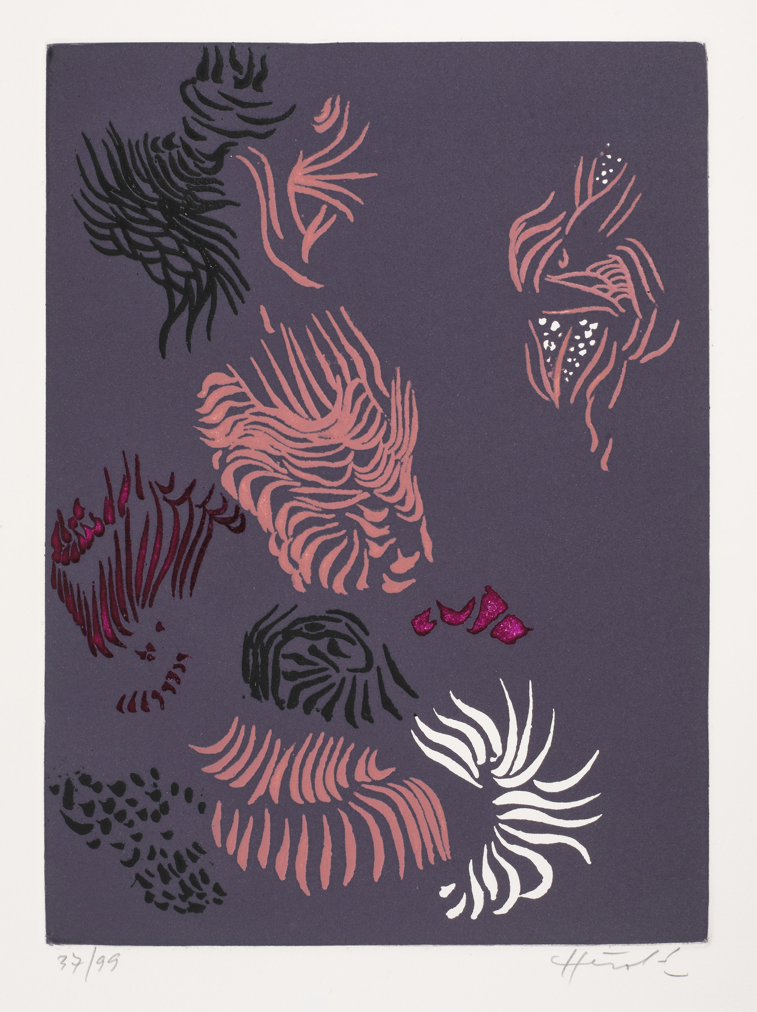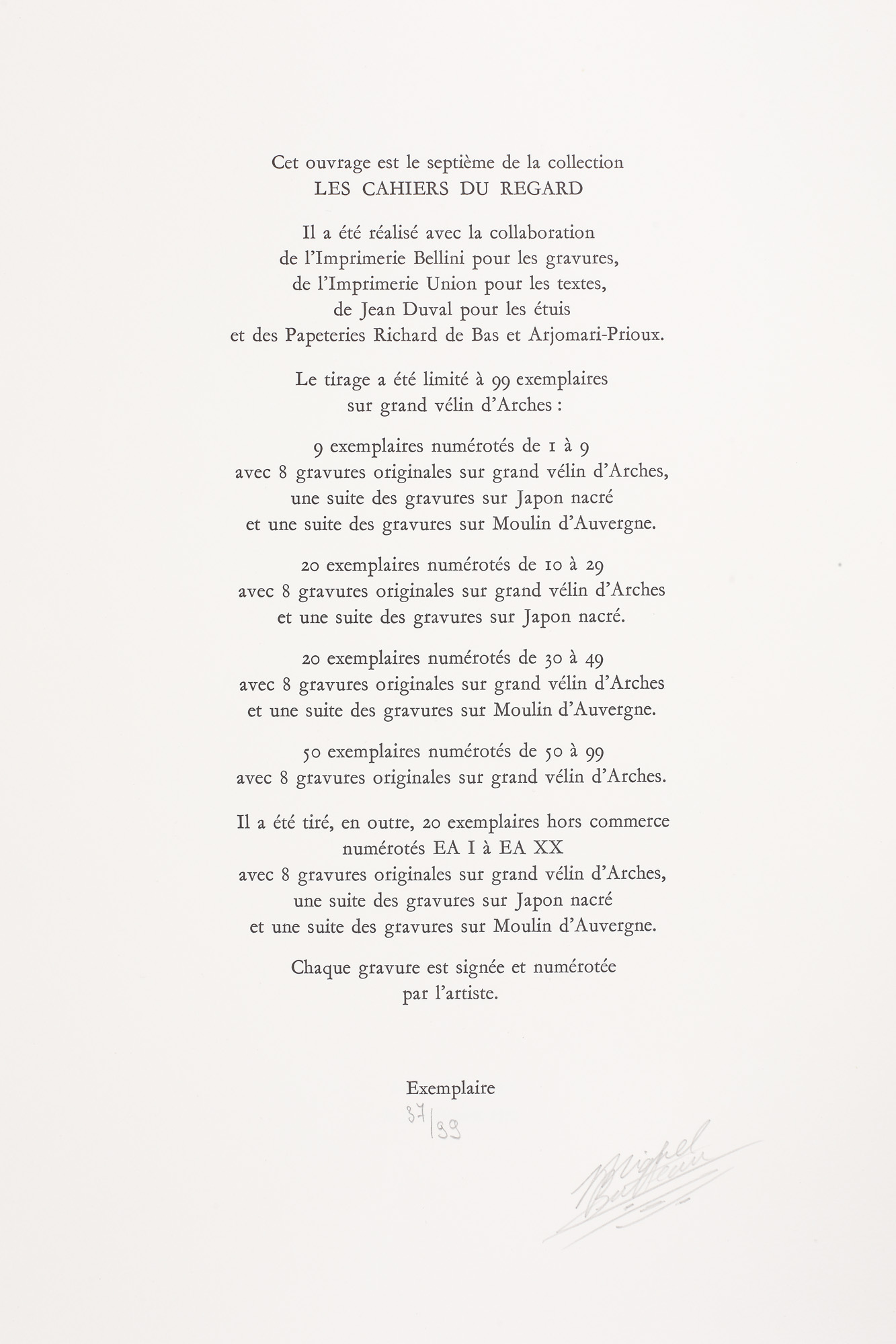 semnat dreapta jos, în creion, "Hérold"; numerotat stânga jos, în creion, "37/99" (fiecare litografie); numerotat și semnat în creion, pe ultima pagină, "Michel Buteau, 37/99"