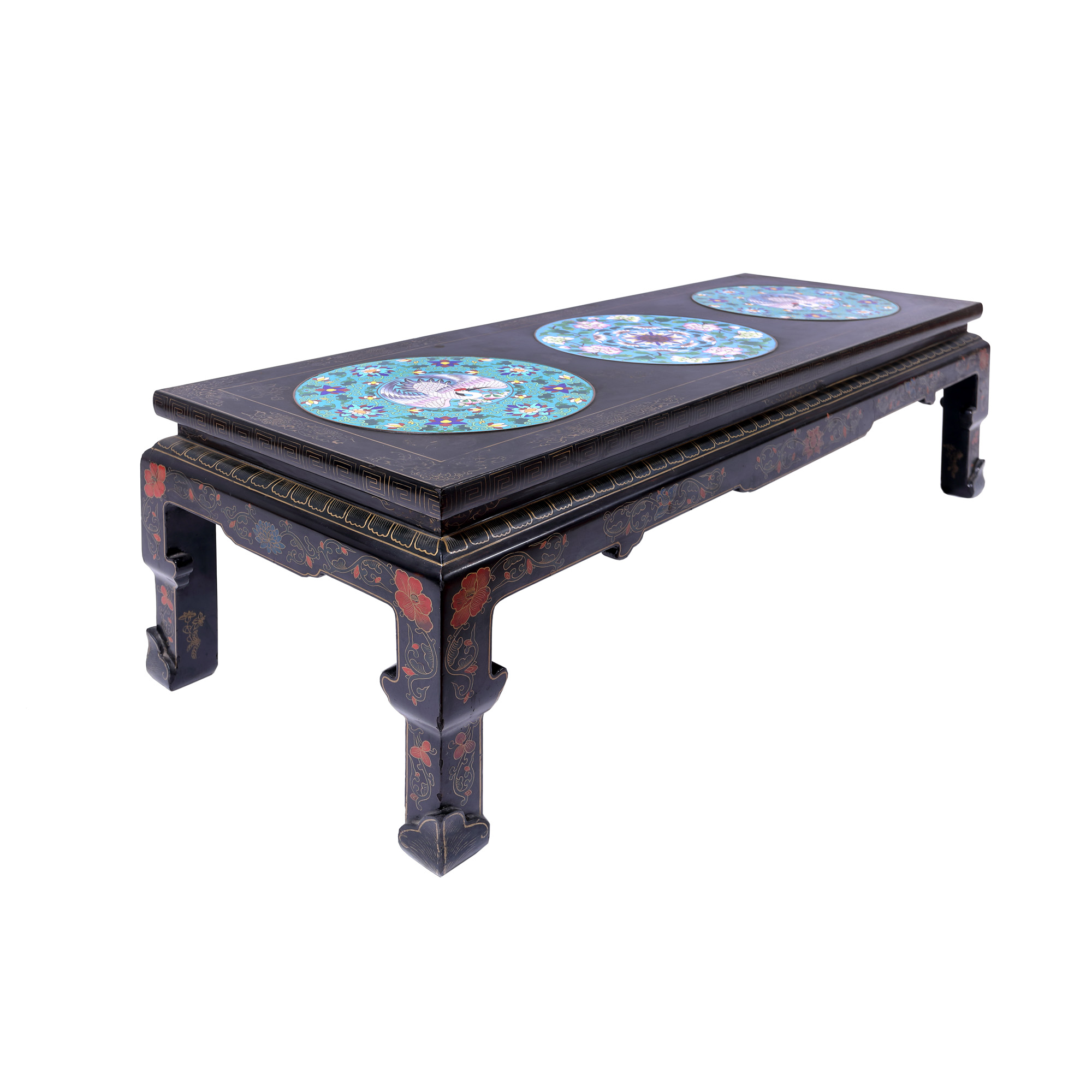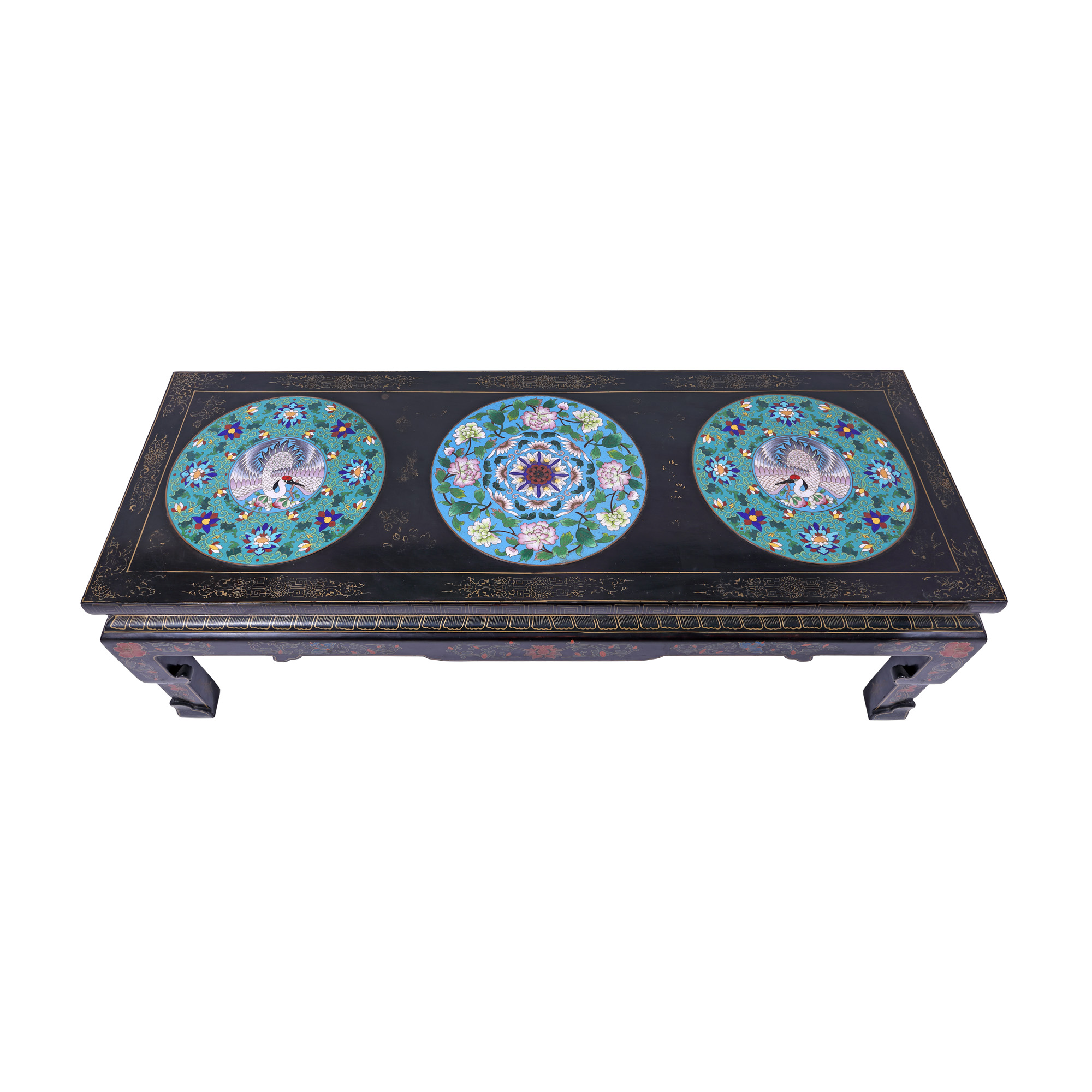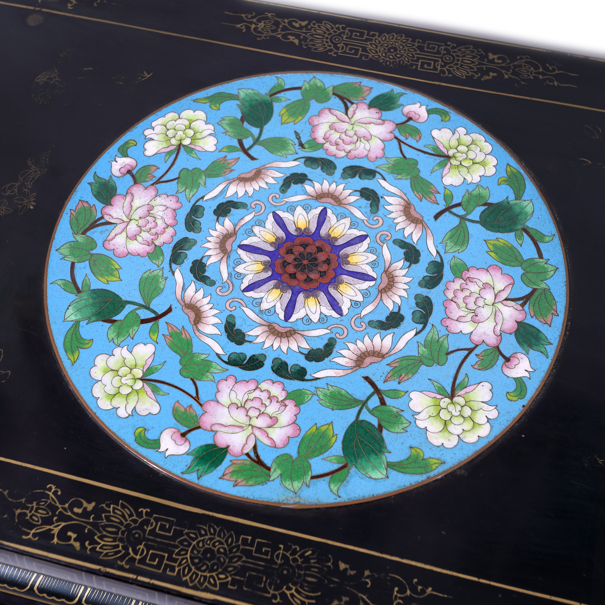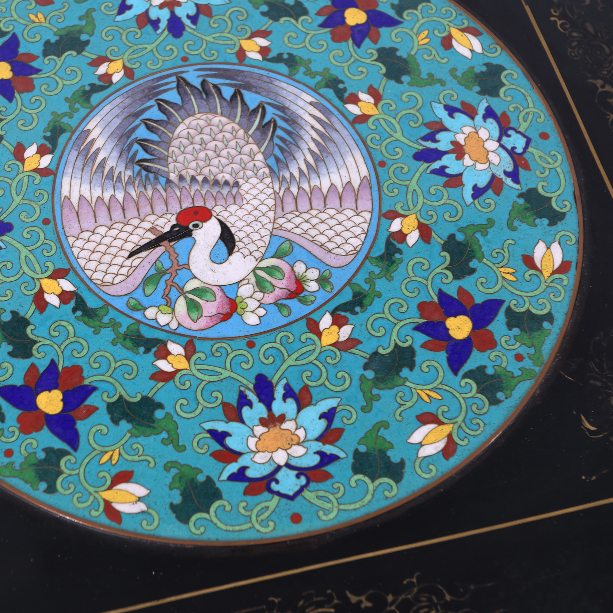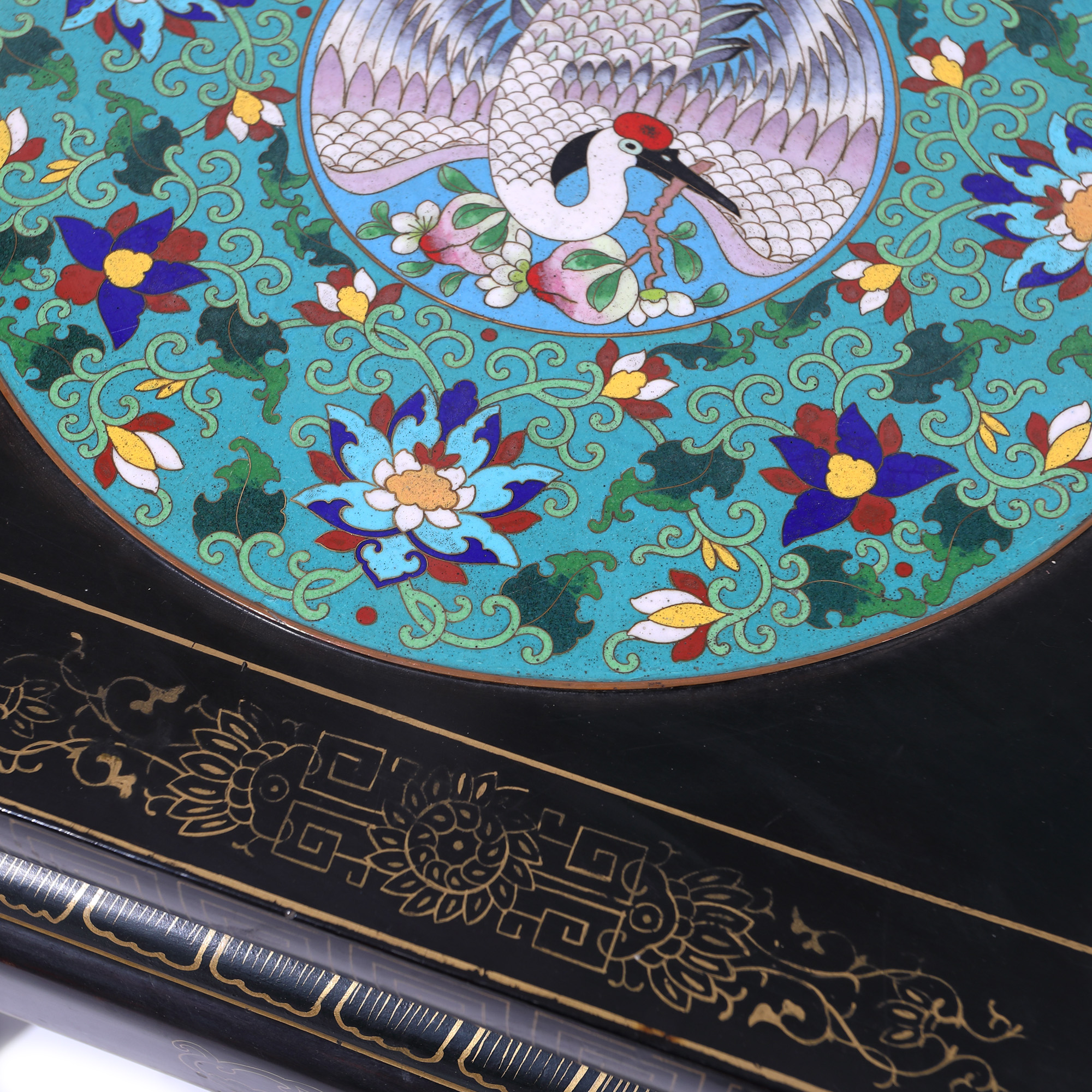 36. Impresionantă masă din lemn exotic, decorată în tehnica cloisonné cu rozetă florală și cocori, perioada Republicană, China, mijlocul sec. XX