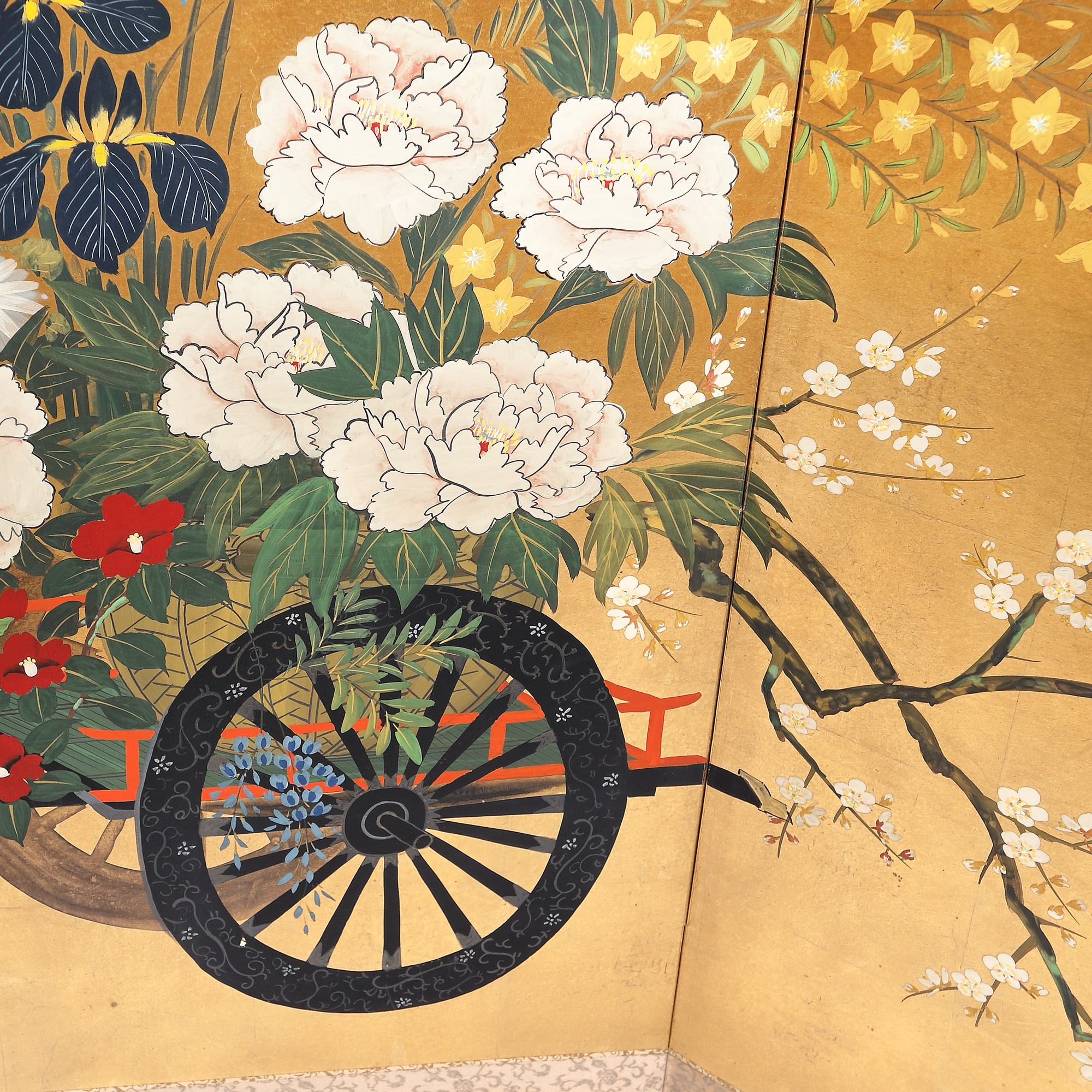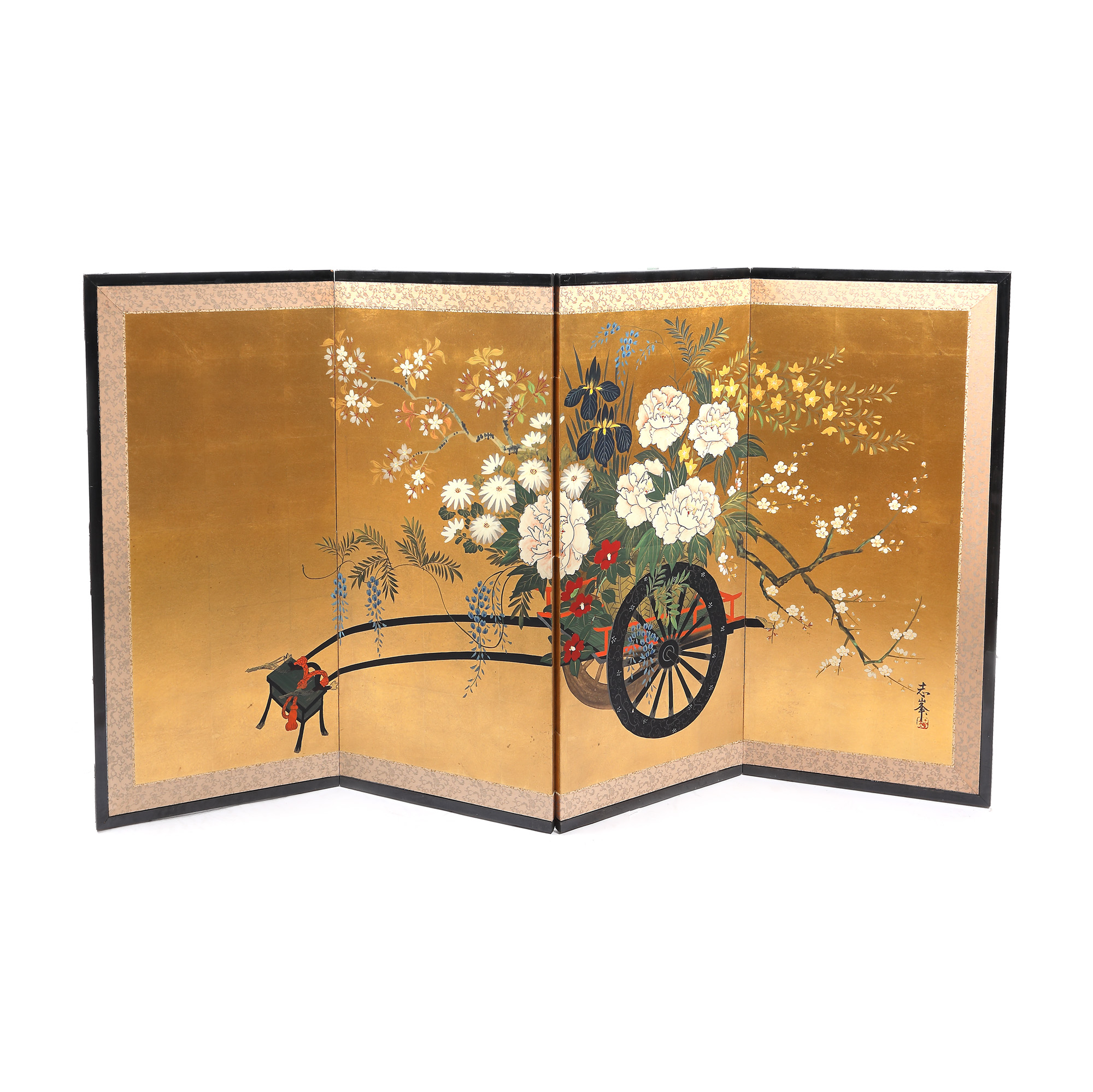 52. Paravan decorat cu crizanteme și flori de cireș, semnat, Japonia, mijlocul sec. XX