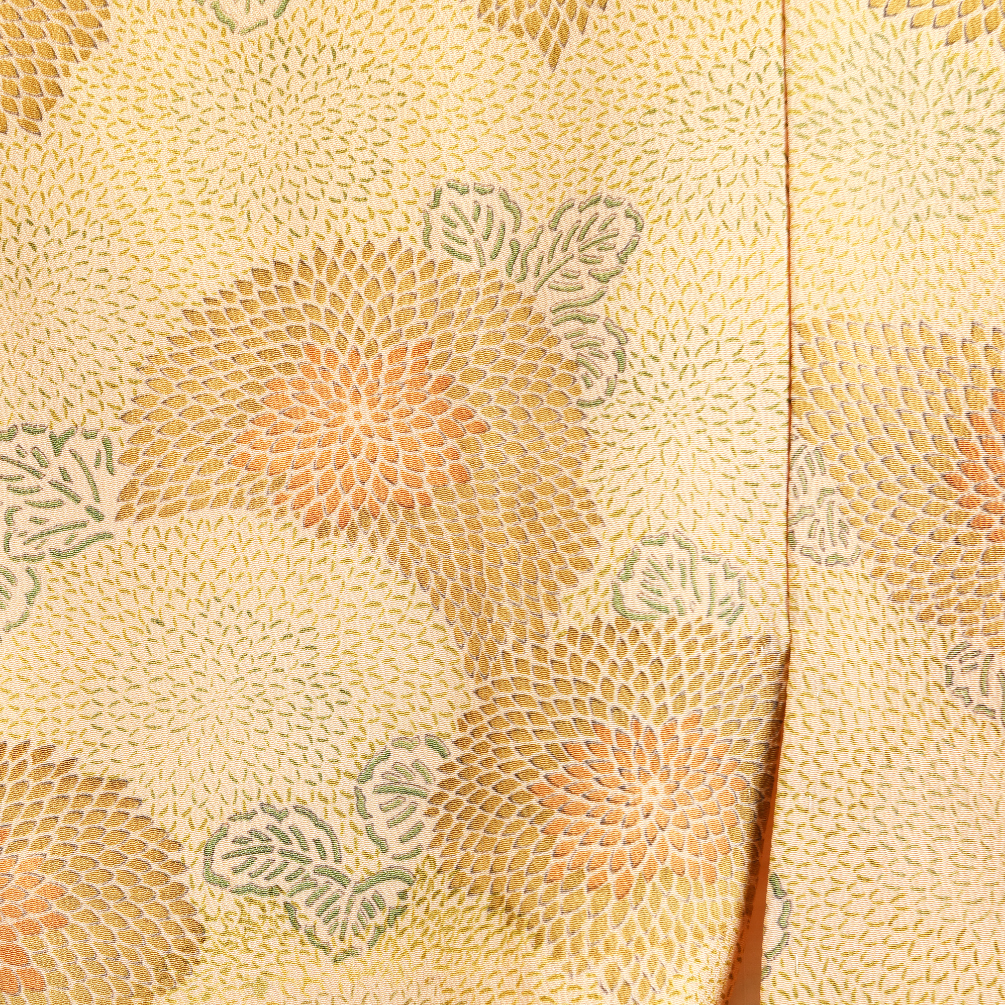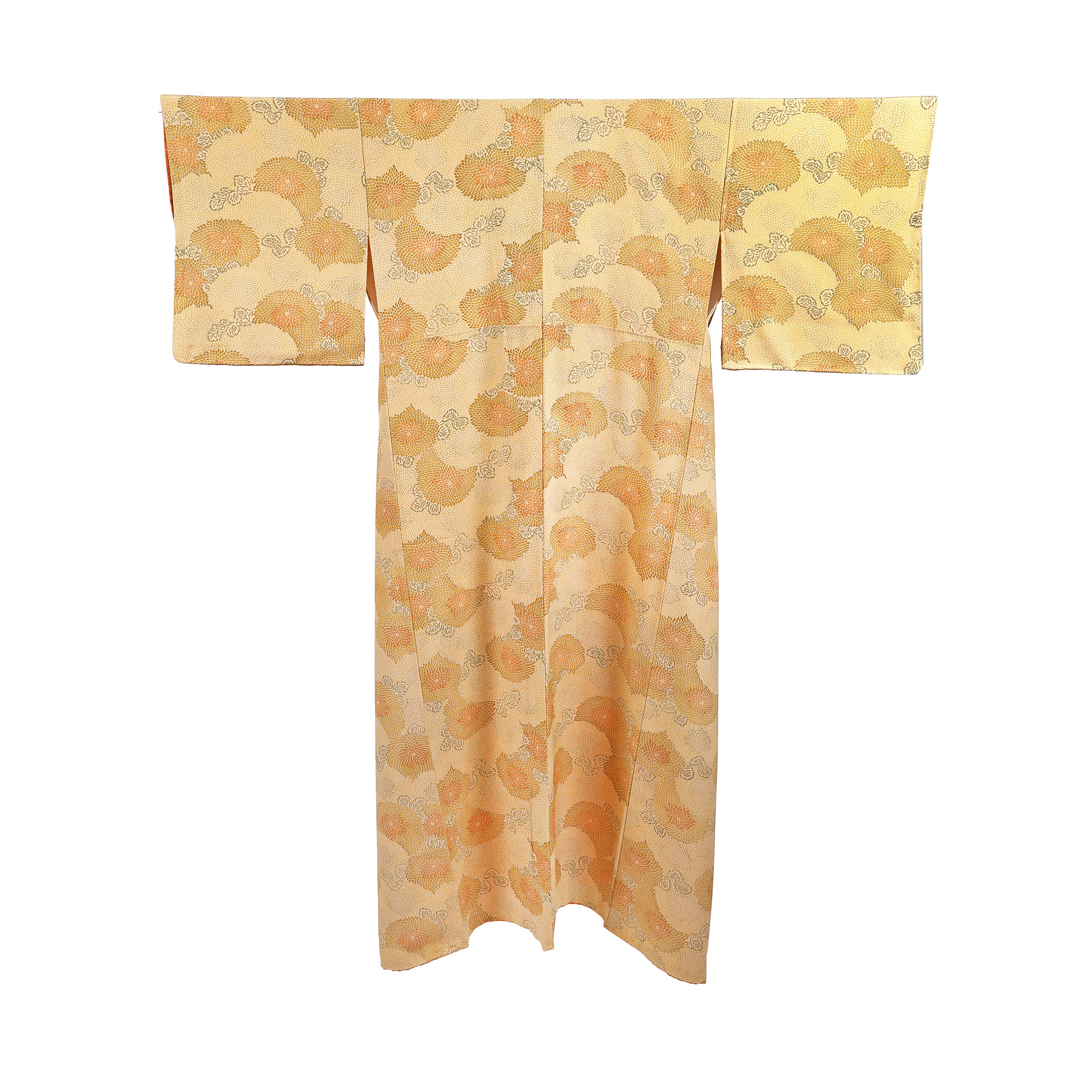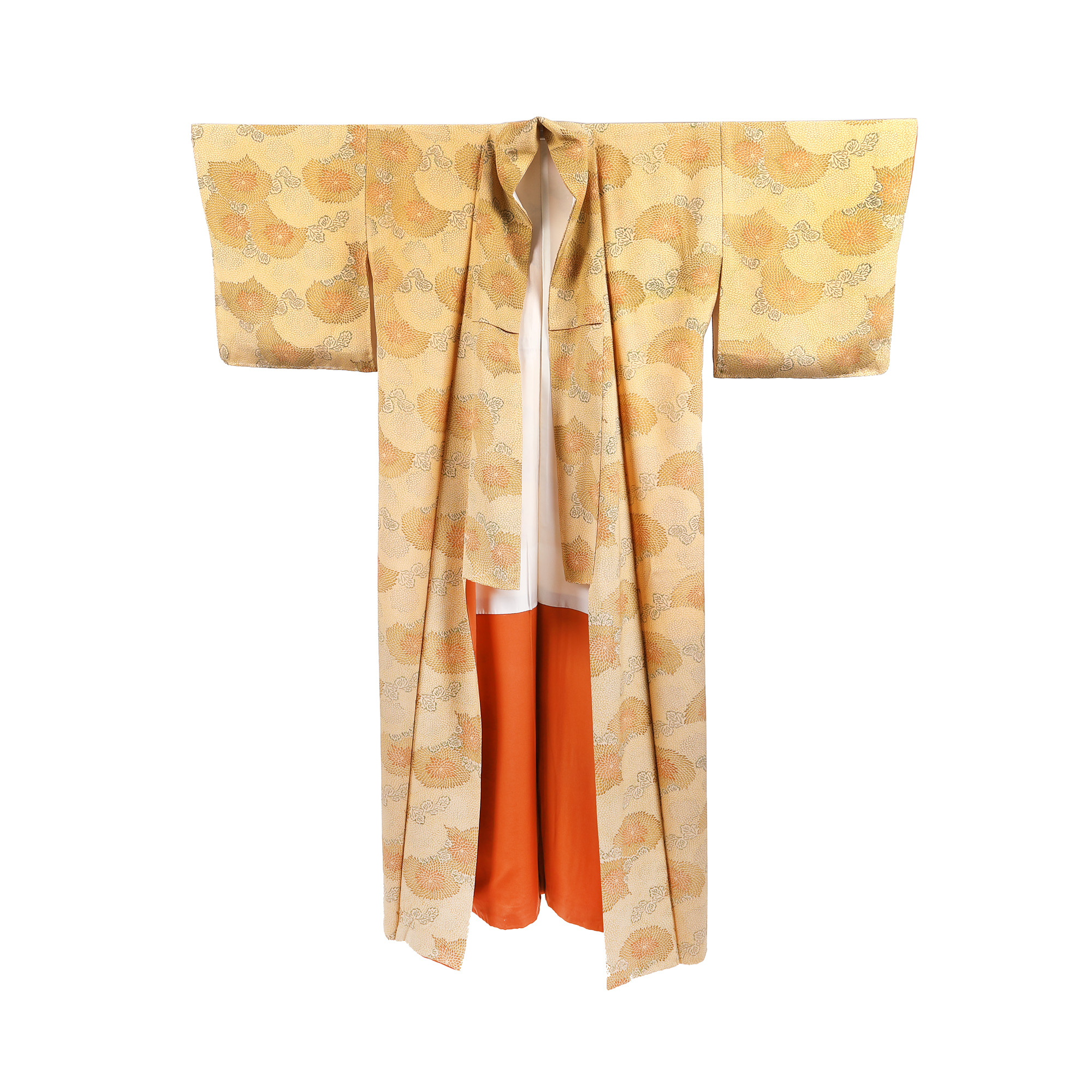 46. Tsukesage Houmongi (kimono semi-formal) din mătase, decorat cu crizanteme stilizate, Japonia, provine din colecția Iuliei Gorneanu [a doua jumătate a sec. XX]