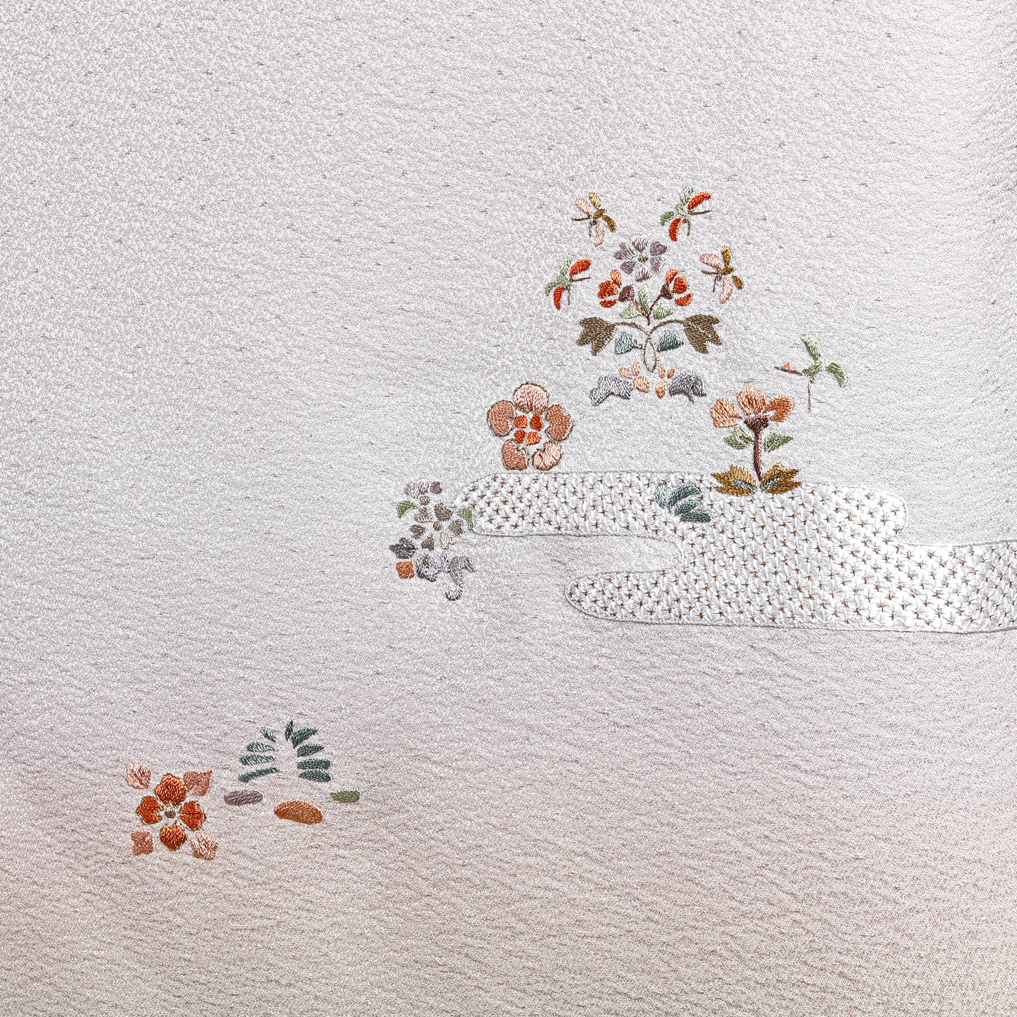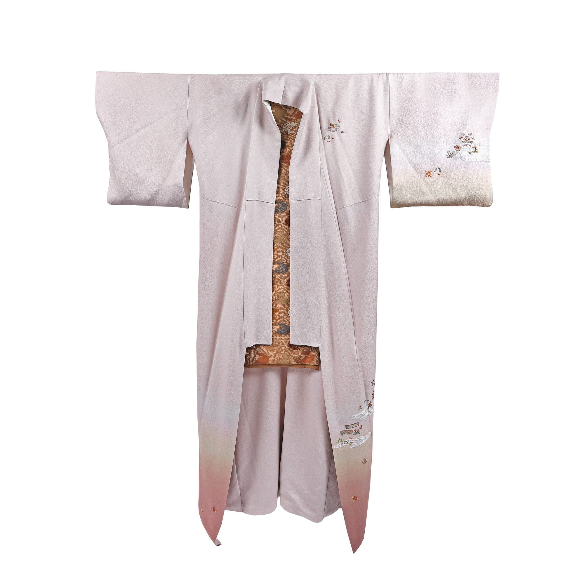 48. Tsukesage (kimono formal) din mătase, brodat manual cu fir de mătase și argint, obi decorat cu motive lacustre, Japonia, provine din colecția Iuliei Gorneanu [a doua jumătate a sec. XX]