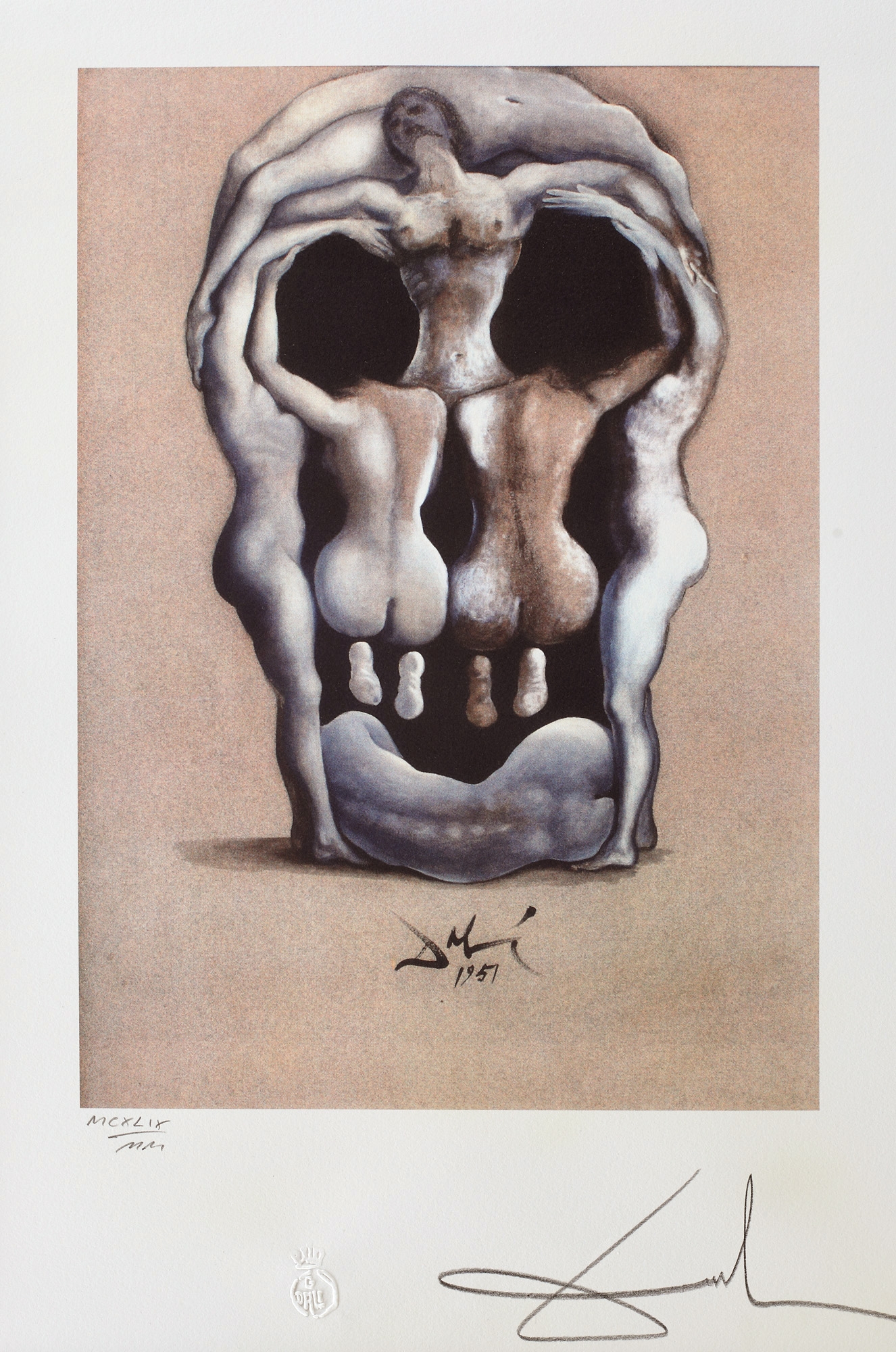 semnat și datat, gravat central sus, în placă, ”Dali, 1951”; semnat dreapta jos, sub cadru, în cărbune, "Dali"; numerotat stânga jos, sub cadru, în creion, "DCXLIX/MM"; stânga jos, sub cadru, ştampila editurii, "G. Dali"