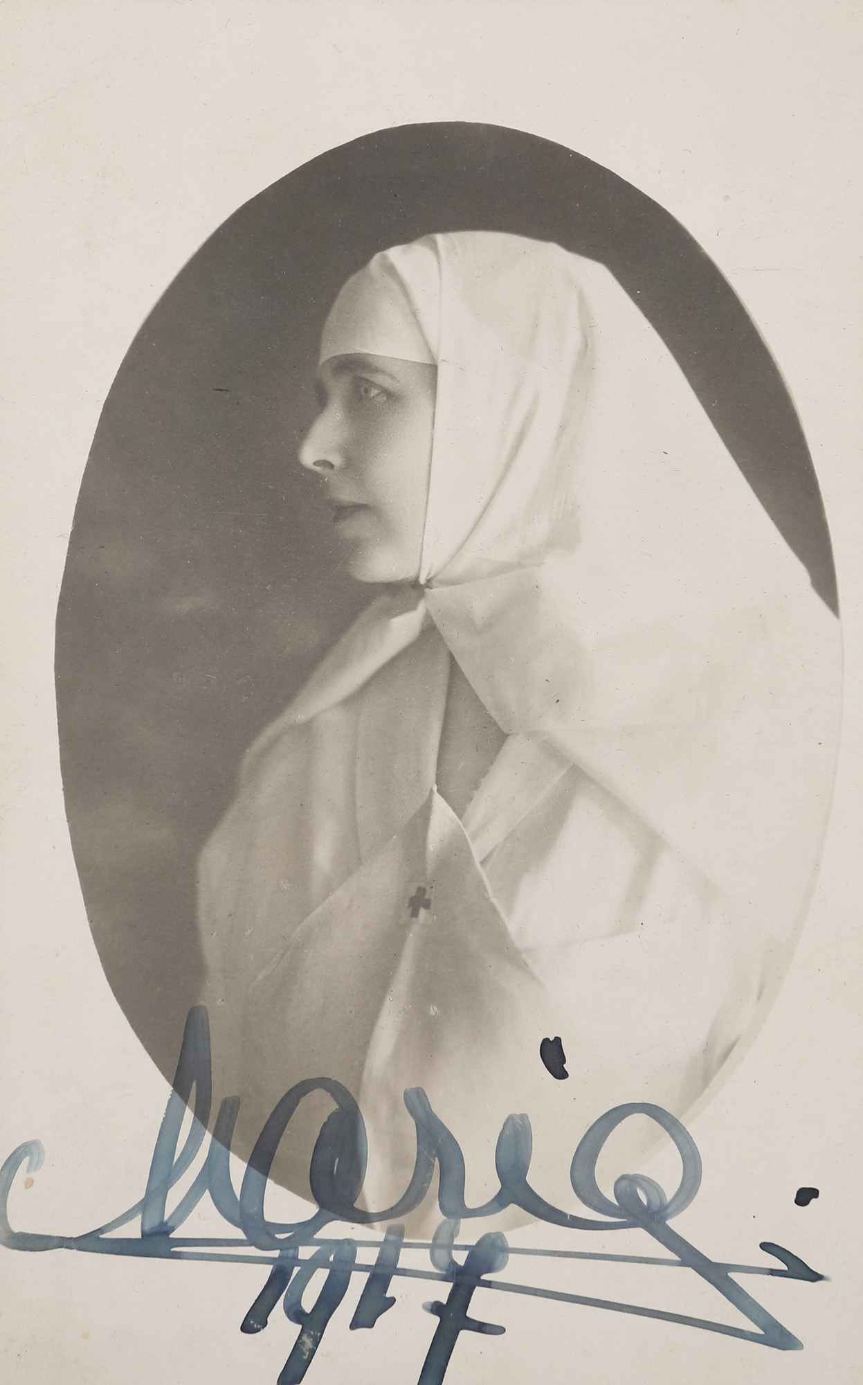 8. Carte poștală ilustrând-o pe Regina Maria îmbrăcată în soră medicală - Mama Răniților, 1917, cu semnătura olografă a reginei, în ramă decorată în stil Neo-Brâncovenesc