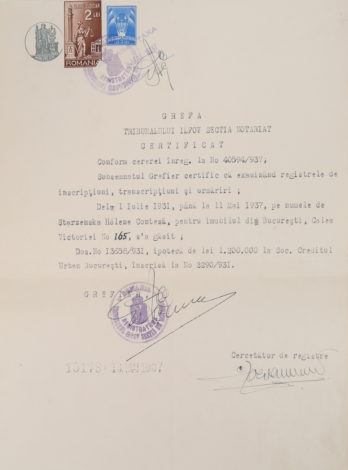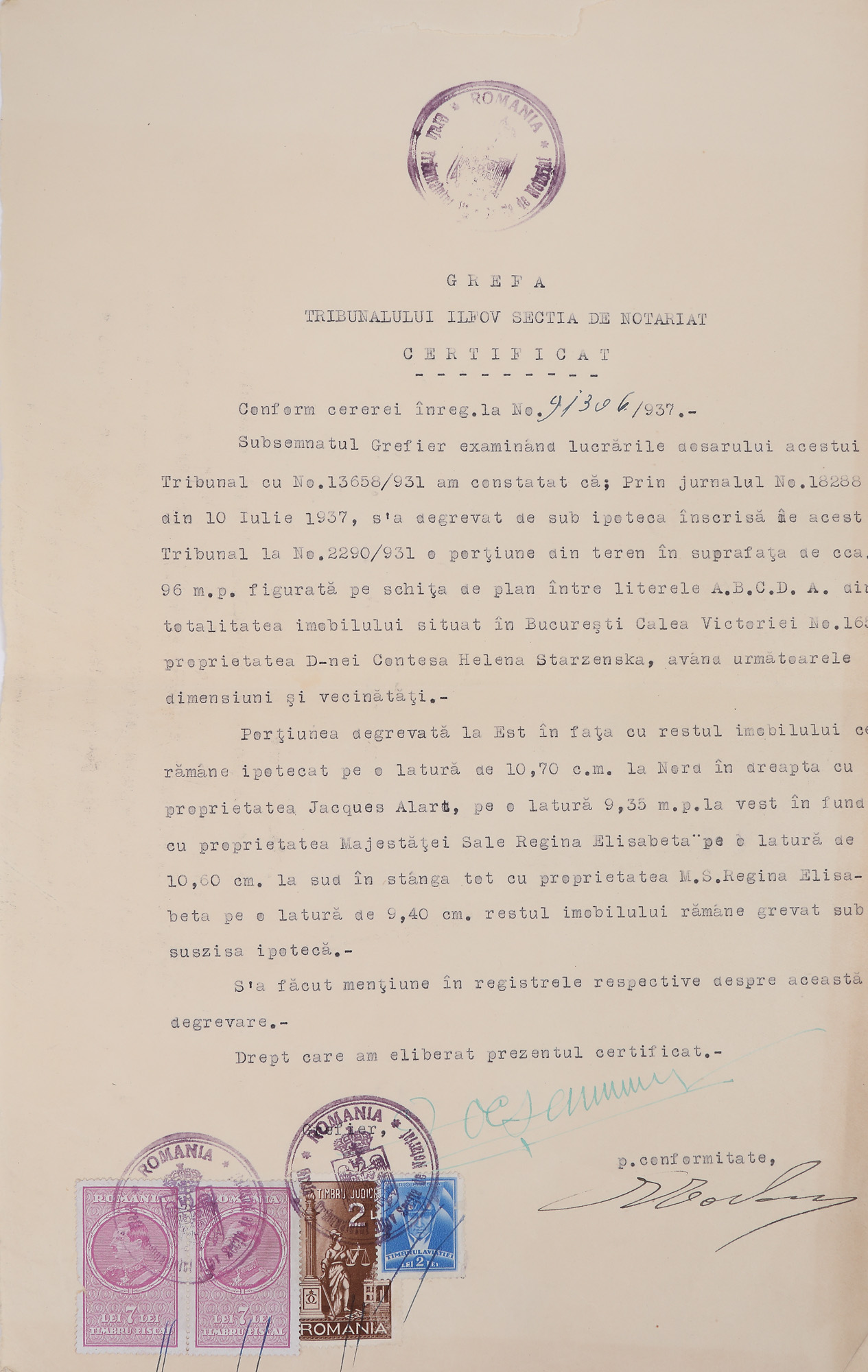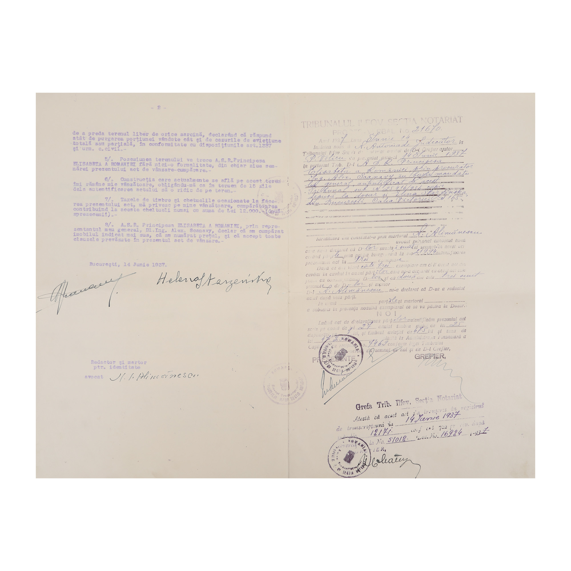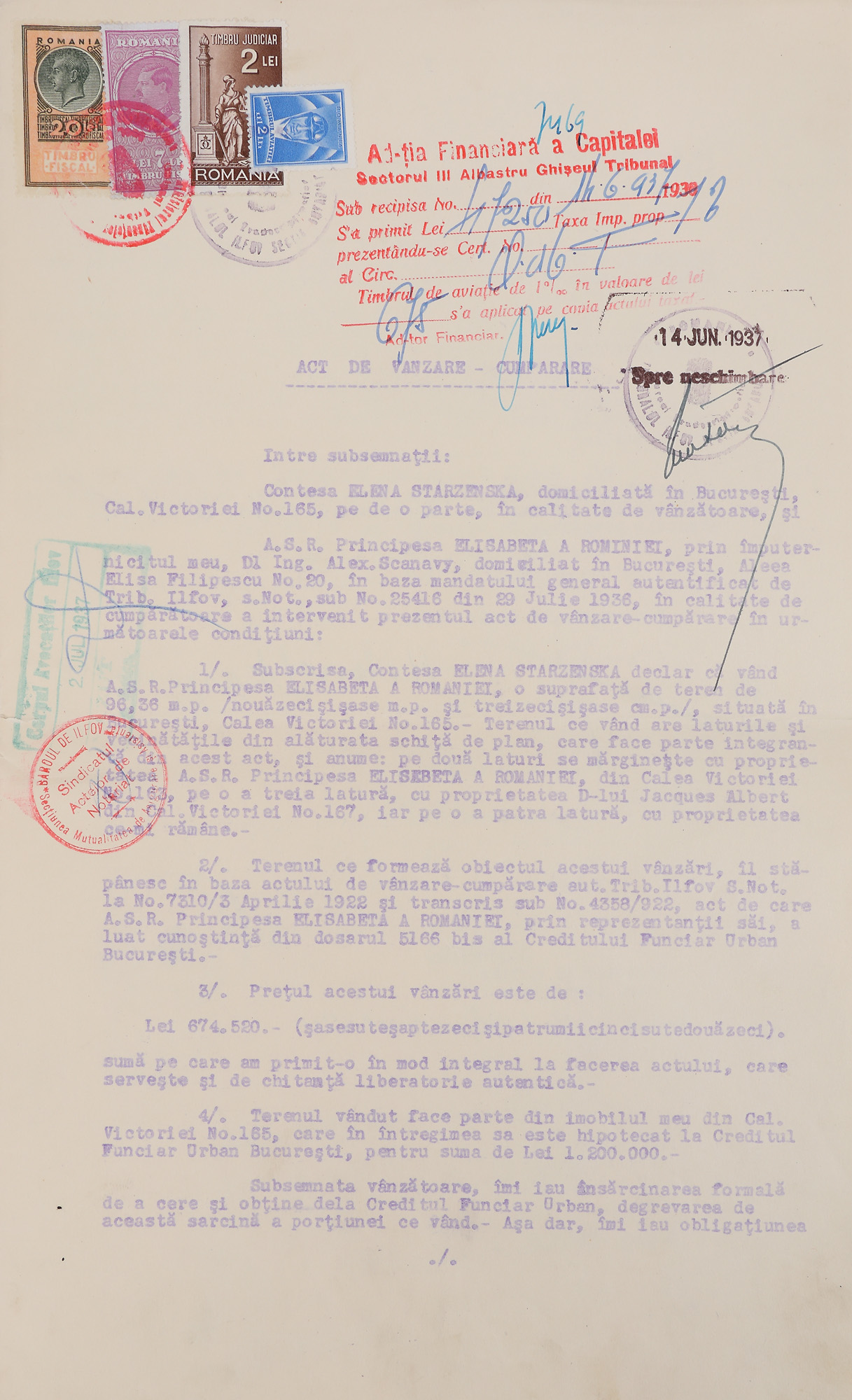 - Contract de vânzare-cumpărare a unui imobil din București între contesa Elena Starzenska și principesa Elisabeta, 1937 - Procură de împuternicire a lui Alexandru Scanavy de vânzare al unui imobil, 1942 - Contract de închiriere între Eforia Spitalelor Civile din București și doamna Marie Angele Massart, 1935 - Contract de vânzare-cumpărare între Marie Angele Poliso-Micșunești și Alexandru Sc. Stan, în calitate de mandatar al reginei Elisabeta a Greciei (Principesa Elisabeta a României), 1927