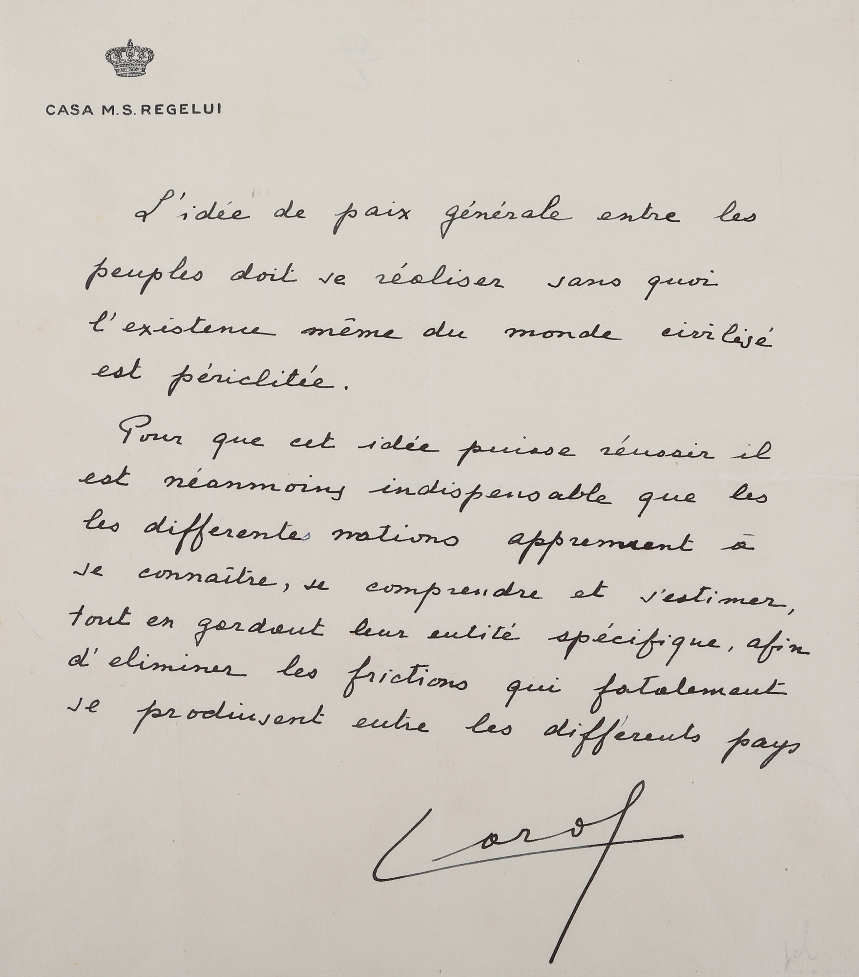 40. Filă manuscrisă a Regelui Carol al II-lea, despre ideea păcii generale între popoare, cca. 1935, cu semnătura olografă