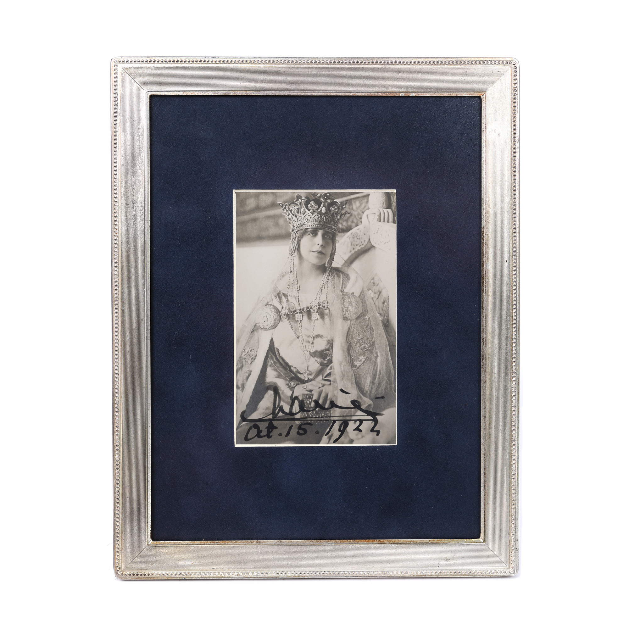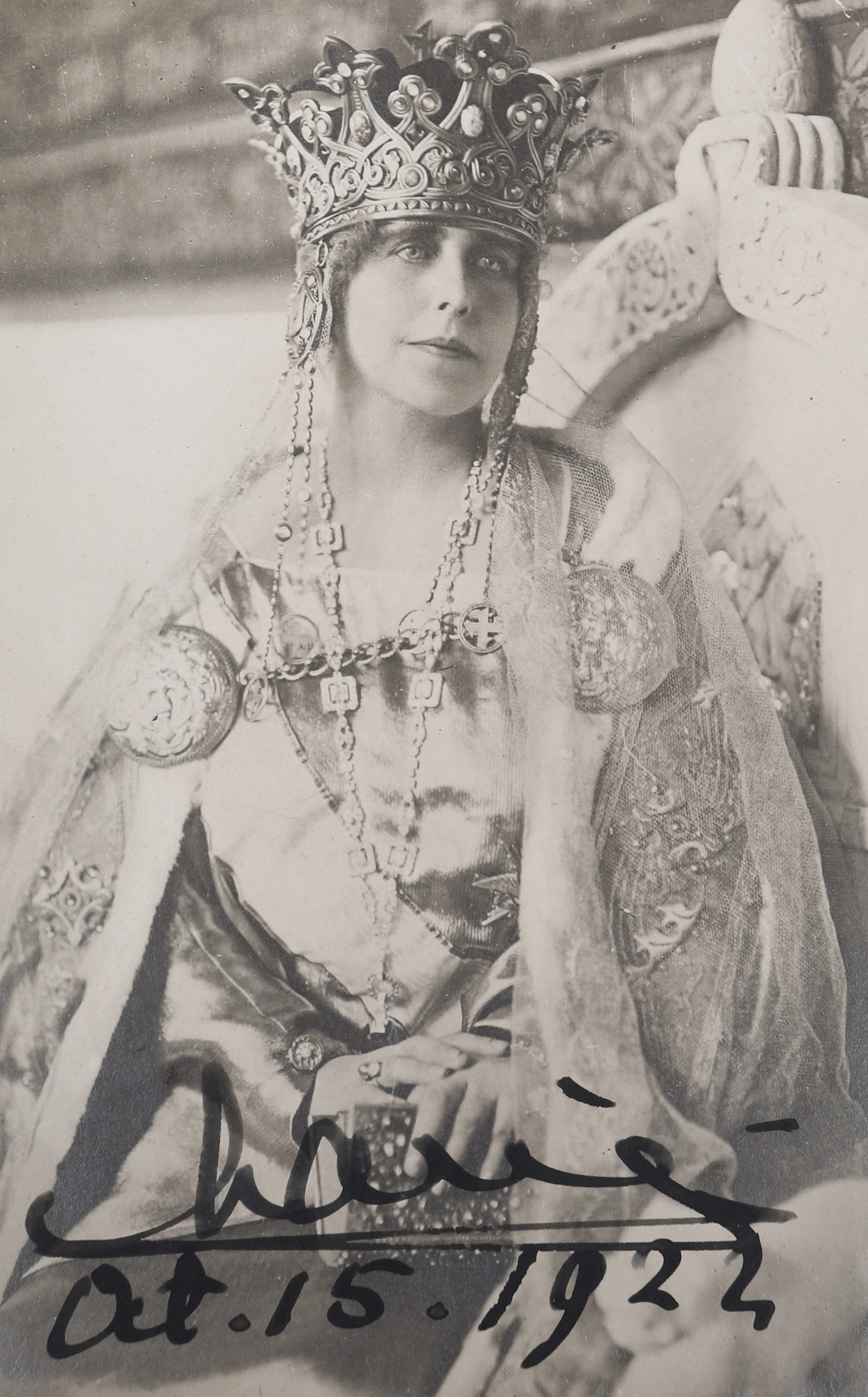 50. Fotografie de colecție, ilustrând-o pe Regina Maria în ținută de Încoronare, fotograf Guggenberger Mairovitz, Sibiu, 15 octombie 1922 (ziua Încoronarii), piesă extrem de rară, cu dedicația și semnătura olografă a reginei