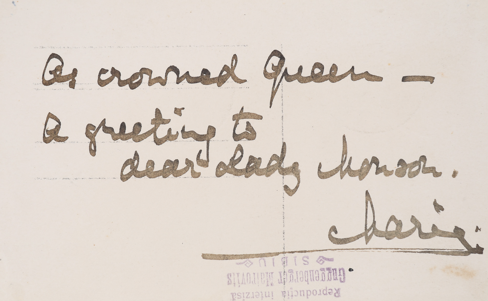 Textul olograf și semnat al dedicației ”Ca regina incoronată, felicitari pentru draga Lady Manon. Maria”