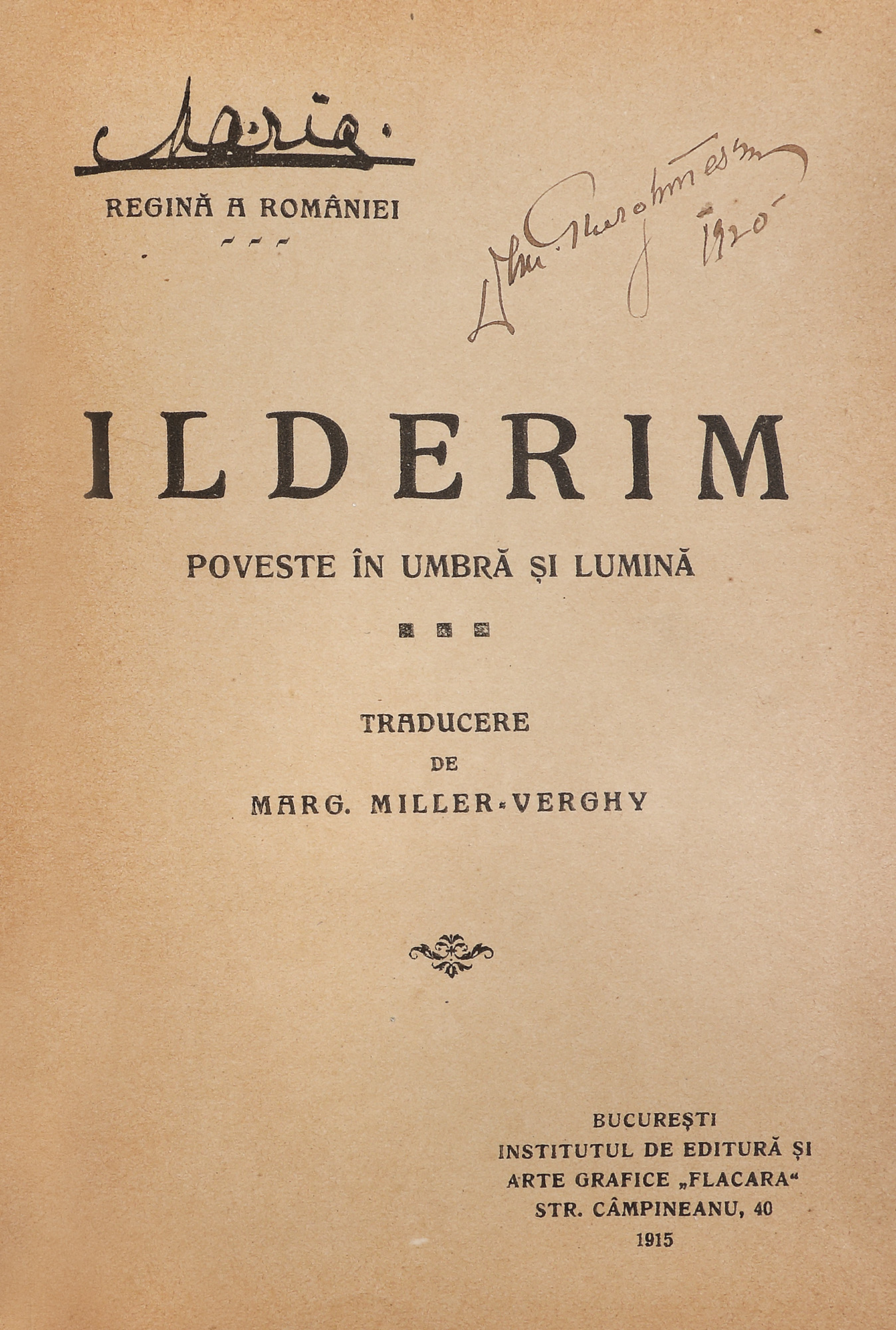 28. ”Ilderim, poveste în umbră și lumină”, de Regina Maria, în română, de traducătoare oficială a Reginei, Mărgărita Miller-Verghy, ediție princeps, București, 1915, exemplar bibliofil, provine din colecția scriitorului Vania Gherghinescu