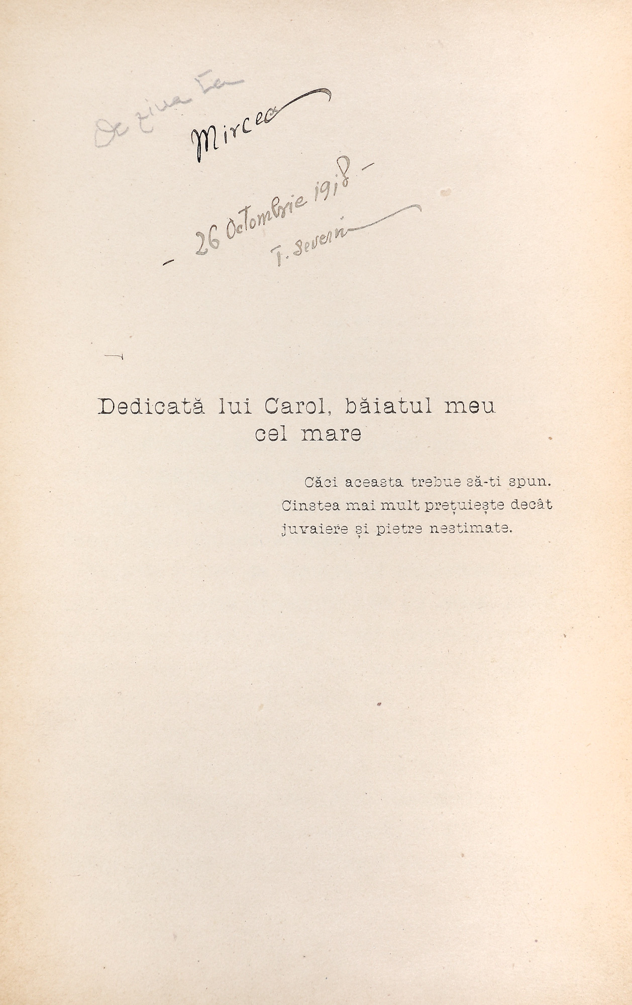 Prezintă două însemnări olografe, una pe pagina de titlu, cu cerneală neagră: ”Dlui. Gherghinescu 1920” și una la pagina 3, cu cerneală neagră și creion: ”De ziua ta Mircea - 26 octombrie 1918- T. Severin”. Legătura originală, editorială, din pânză grena lipătă pe carton.