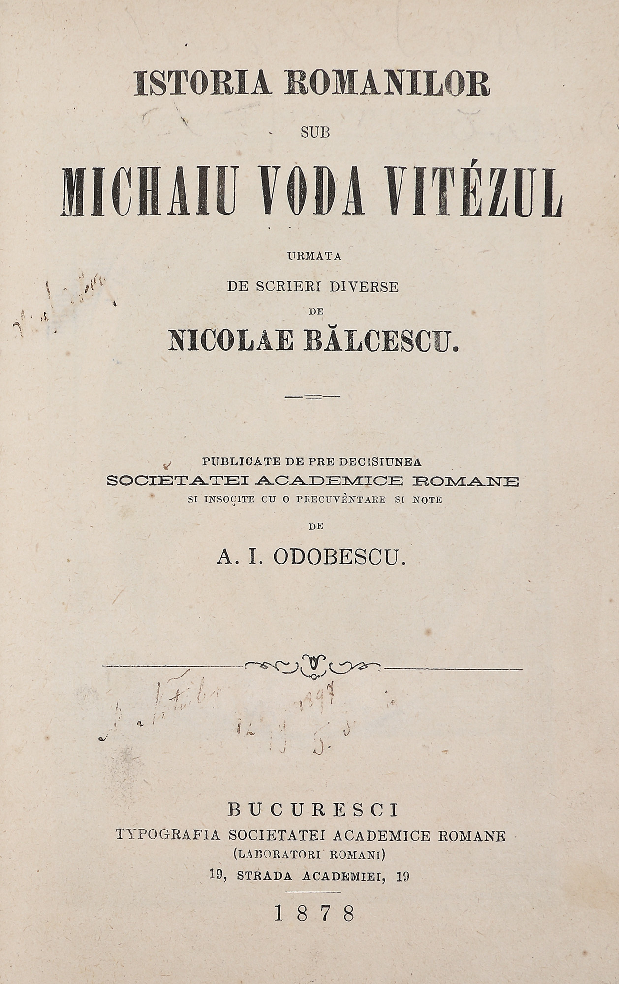 31. "Istoria românilor sub Michaiu Vodă Vitezul", de Nicolae Bălcescu, publicată de Alexandru Odobescu, ediție princeps, București, 1878, piesă rară, provine din colecția scriitorului Vania Gherginescu