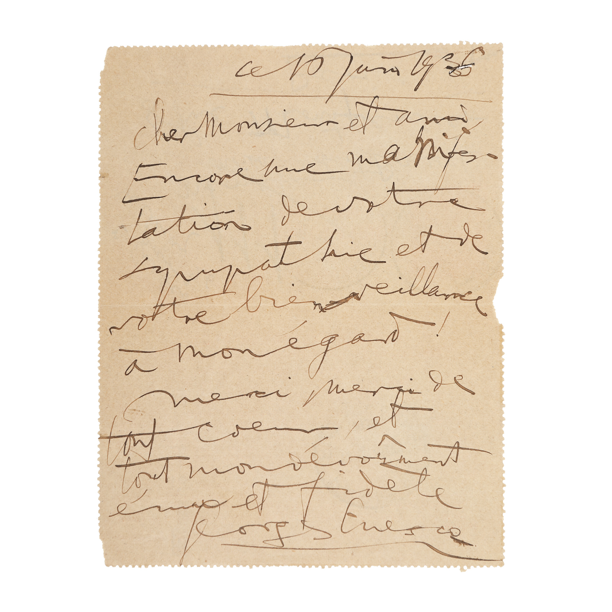 42. Scrisoare amicală trimisă de George Enescu către prietenul și criticului muzical Robert Brussel, Paris, 1936, cu semnătura olografă a compozitorului