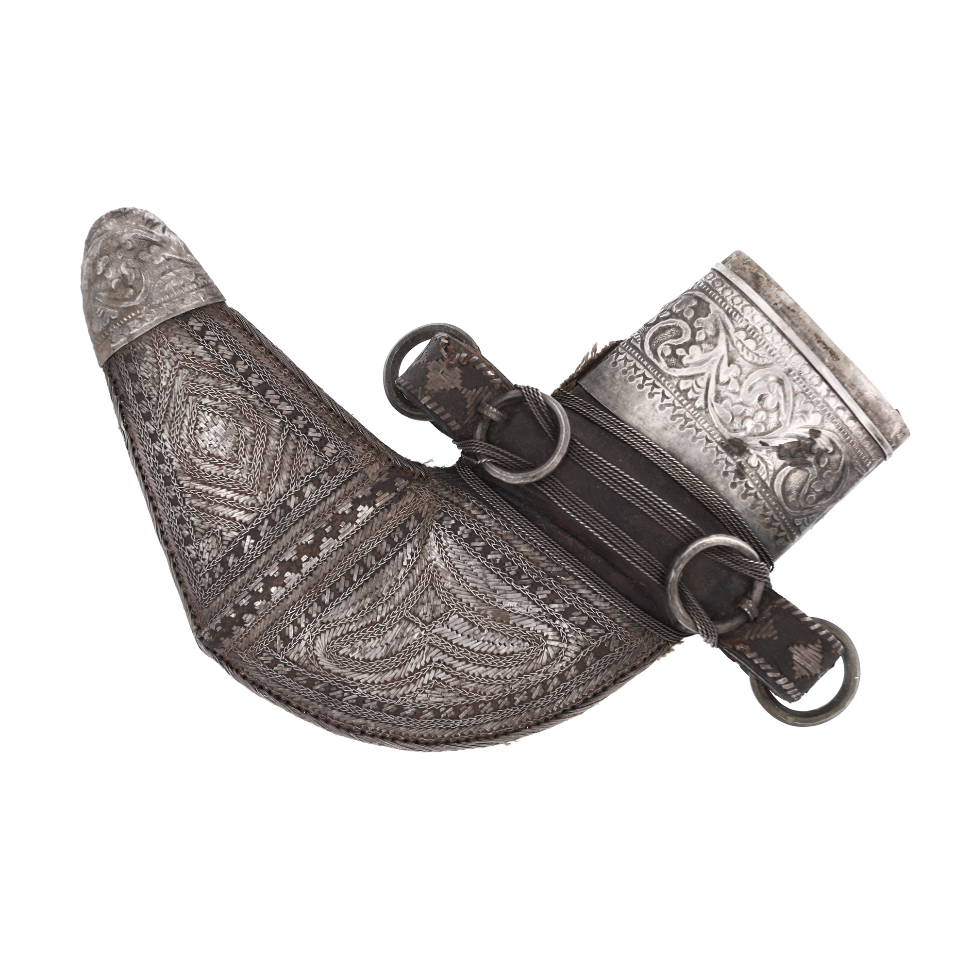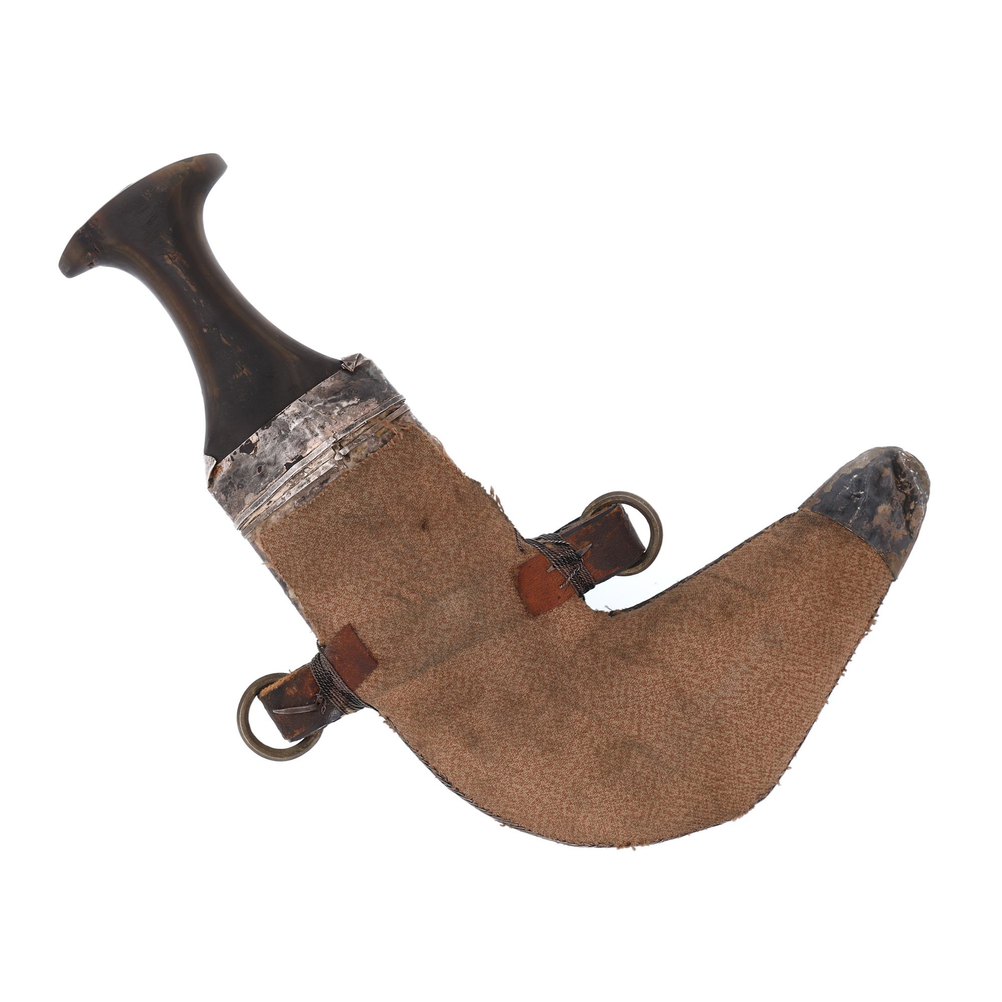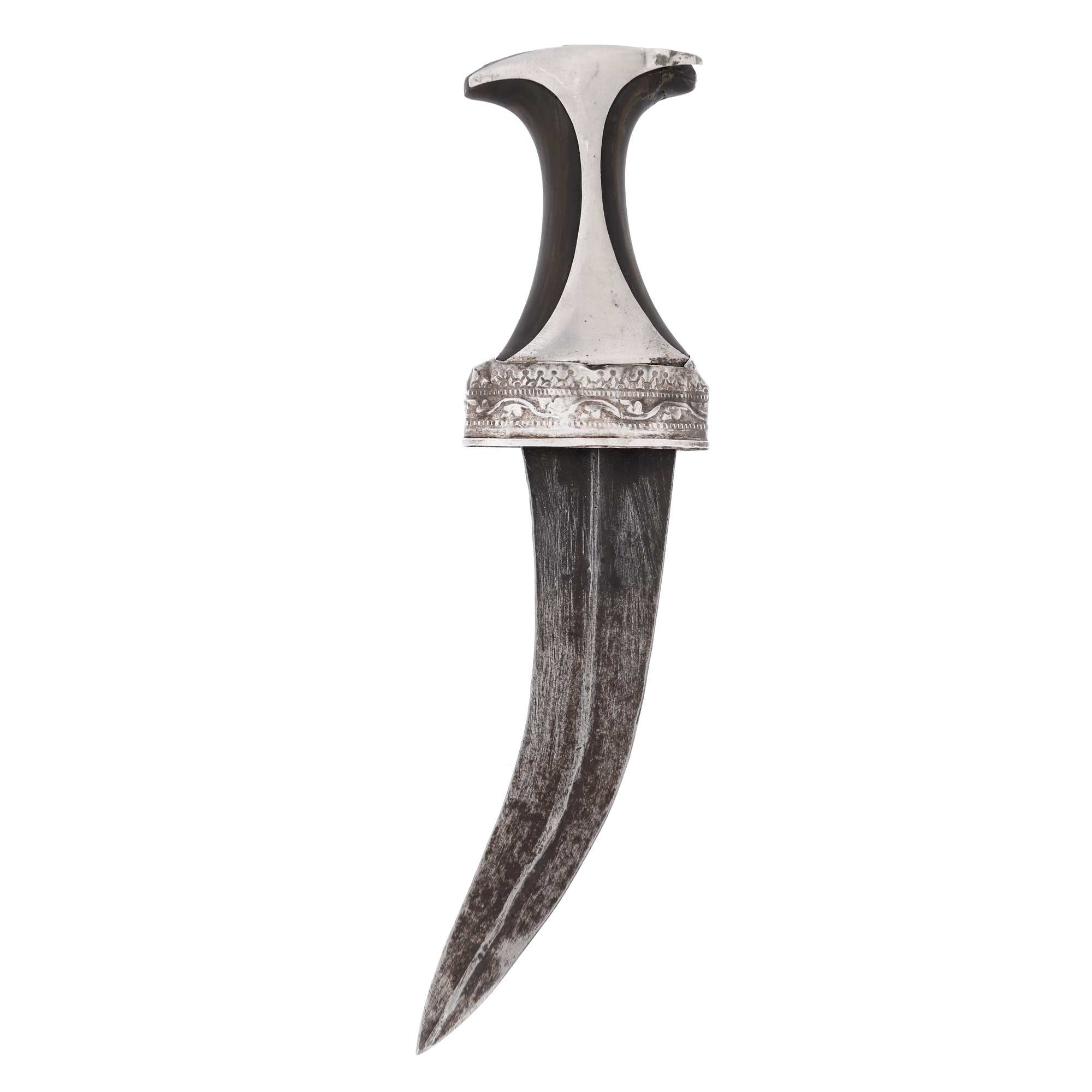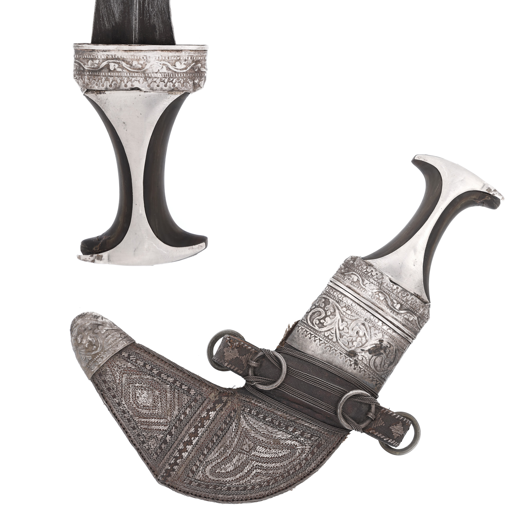 47. Pumnal Jambiya, cu teaca și mânerul din argint și corn de rinocer, Oman, sfârșitul sec. XIX - începutul sec. XX