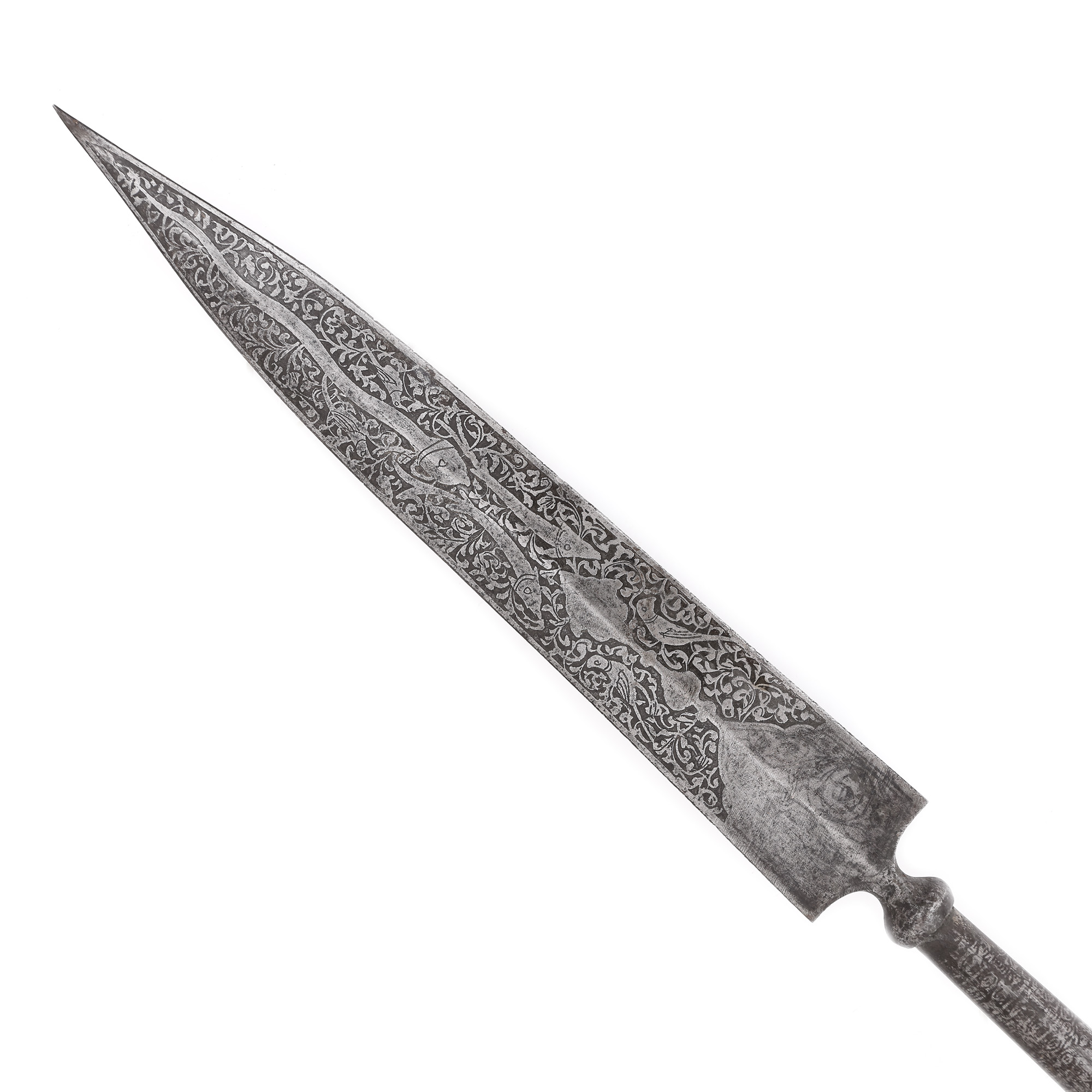 33. Vârf de suliță, gravat cu motive vegetale și animale, posibil Italia, sec. XVII-XVIII