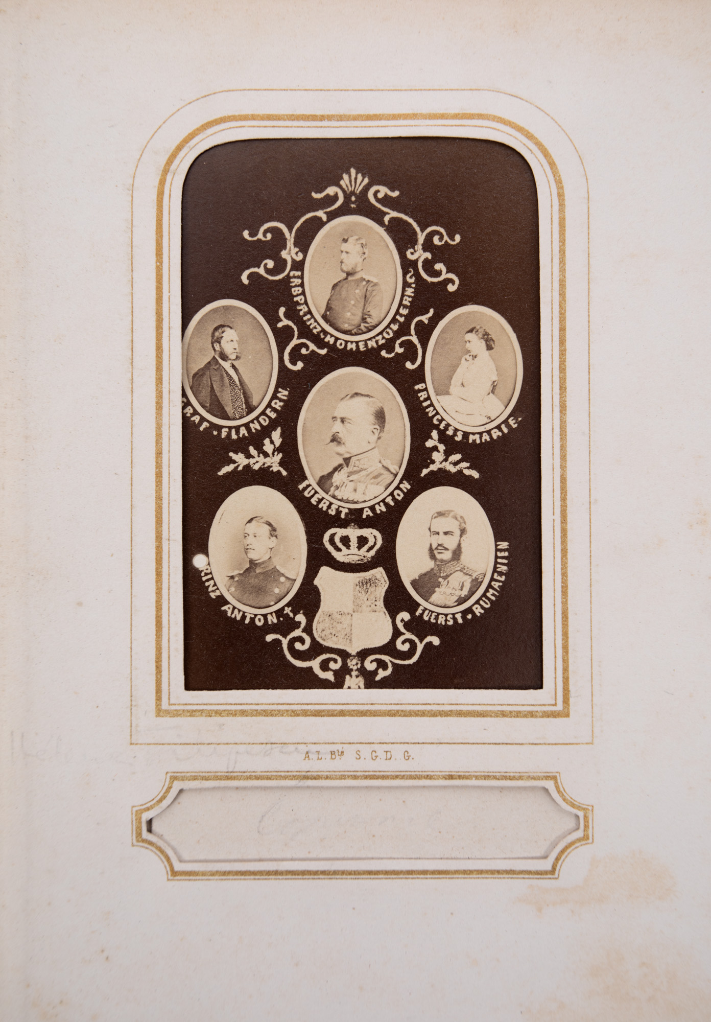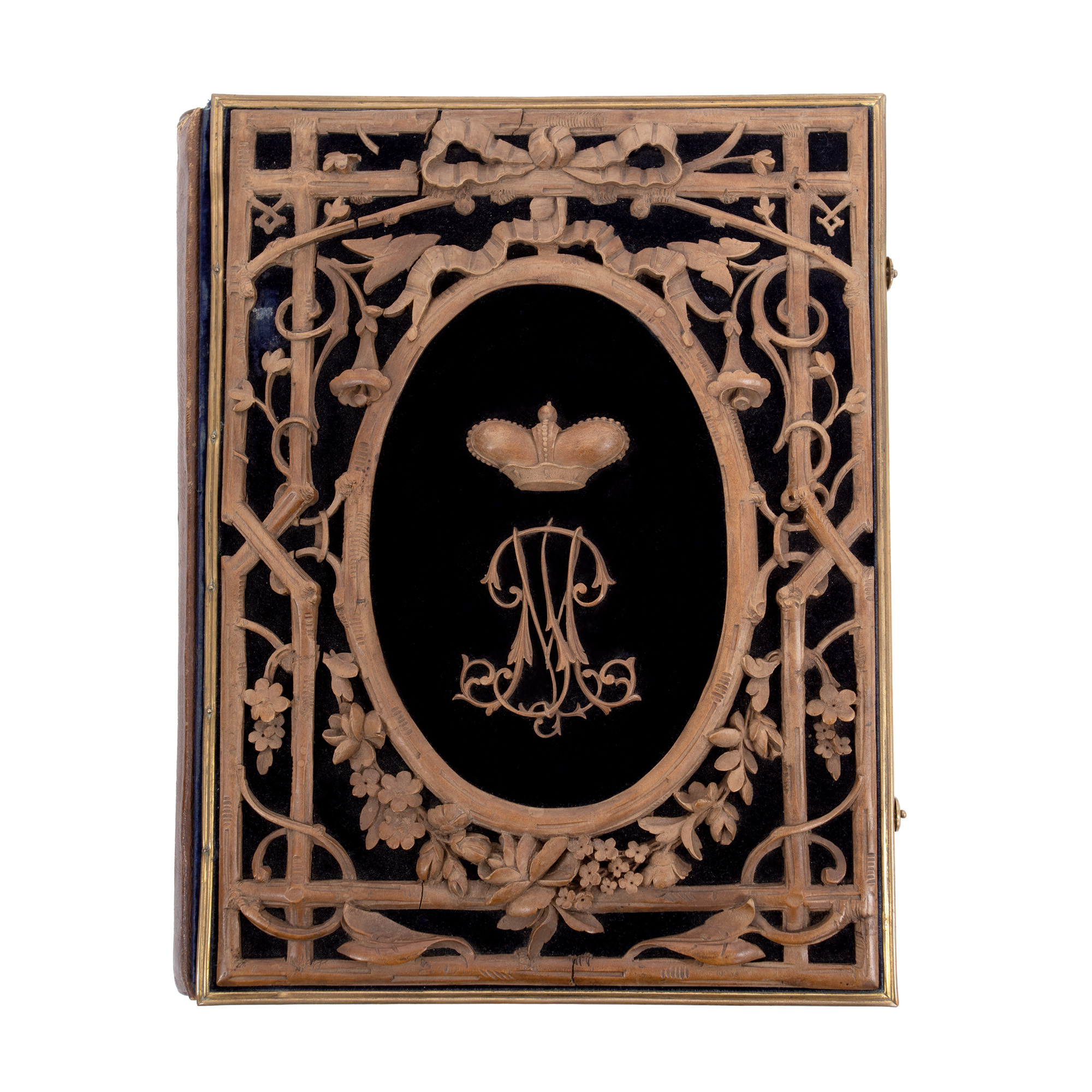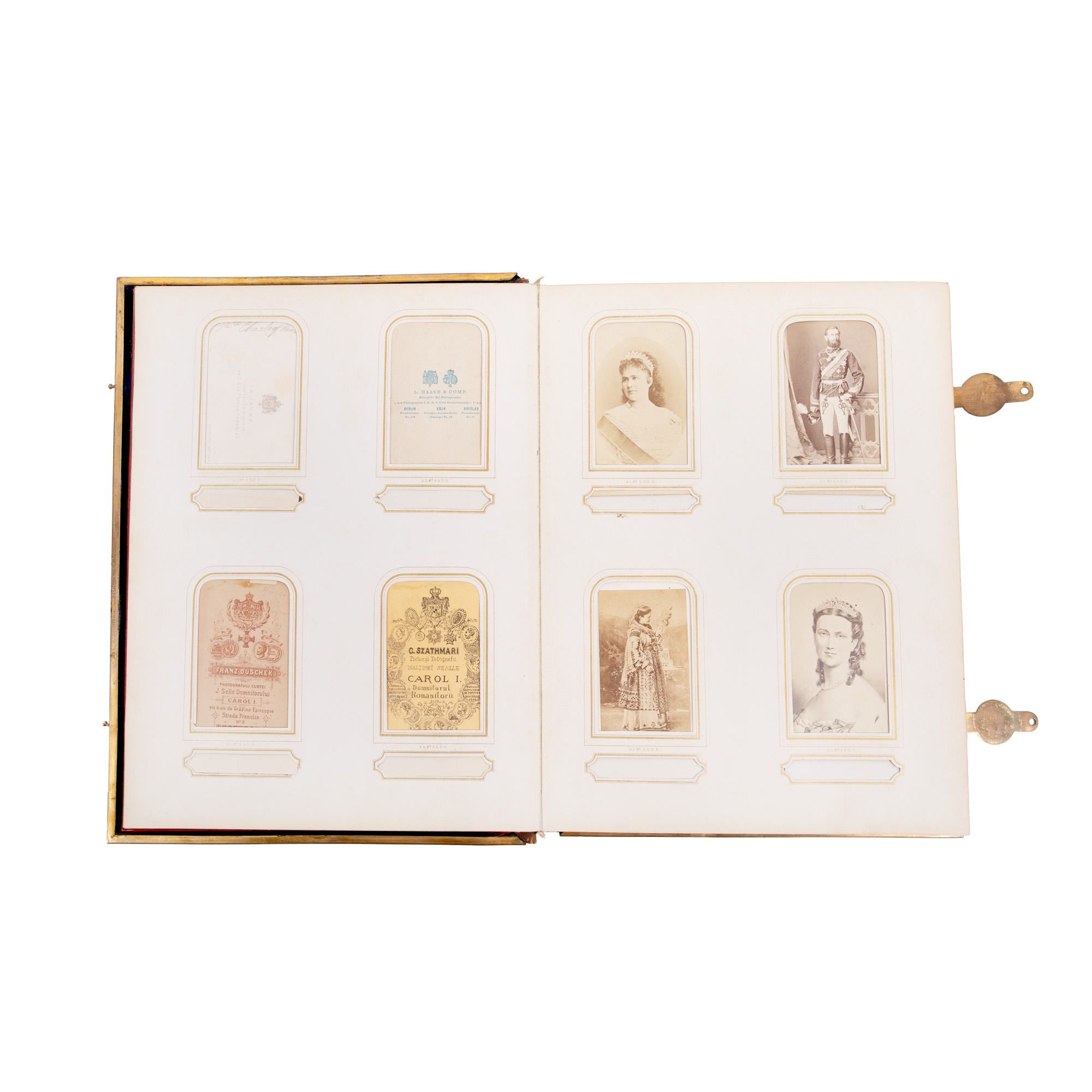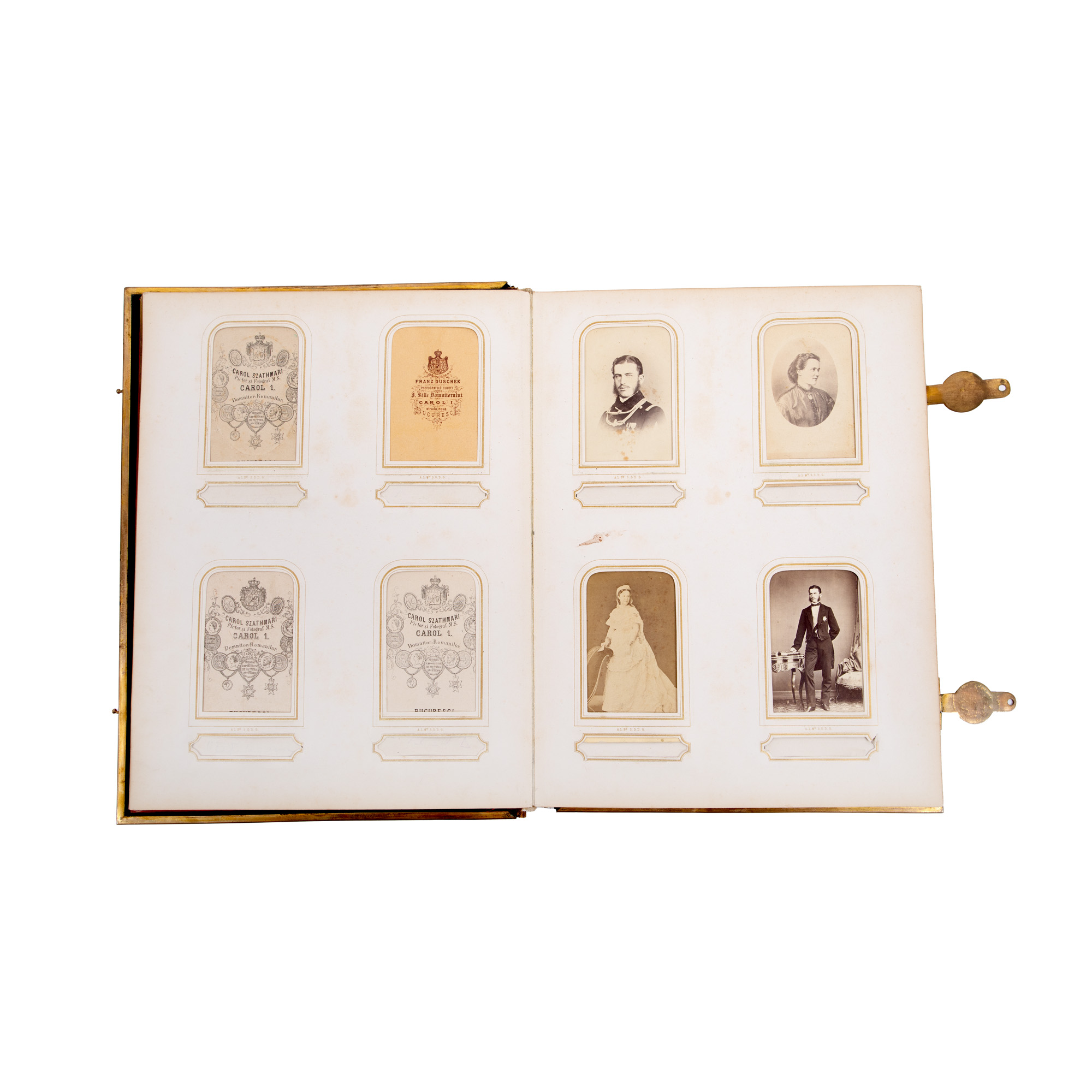 27. Album cu 85 de fotografii ale regelui Carol I, reginei Elisabeta și ale rudelor germane ale acestora, realizate de fotografii Carol Popp de Szathmary, Franz Duschek și alți fotografi din epocă, 1865-1883, provine din colecția familiei Mavrocordat, cu cifrul Irinei Mavrocordat