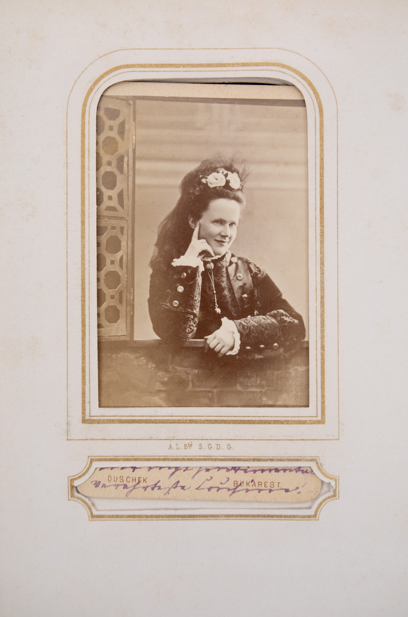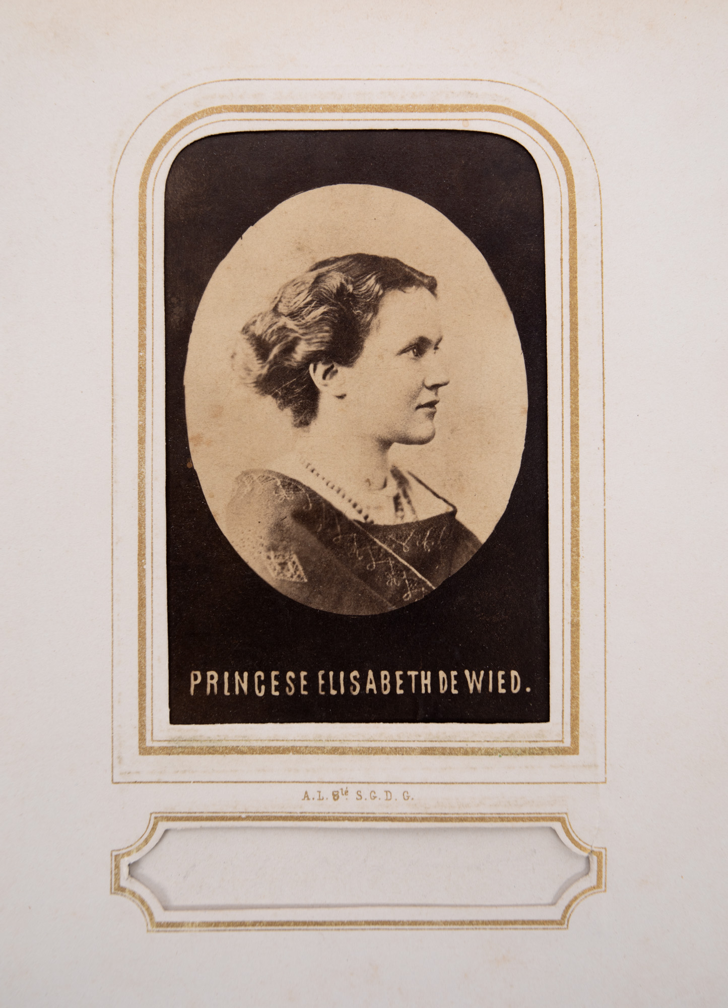 Album fotografic de epocă, 85 fotografii, Carol I, Elisabeta și rudele lor germane, diverse ateliere fotografice, cca. 1866-1883. Dintre acestea, 26 de fotografii sunt realizate de Franz Duschek, iar 11 fotografii sunt realizate de Carol Popp de Szathmary. Fotografiile format "carte de visite" sunt păstrate într-un splendid album de epocă, realizat în manufactura Wirth Frères din Paris. Coperțile sunt din alamă patinată, îmbrăcate în catifea neagră iar la exterior au aplicații sub forma unui decor vegetal stilizat traforat în lemn. Șnitul este aurit iar încuietorile sunt din alamă, decorate cu figuri vegetale. Planșele din carton sunt foarte bine păstrate și sunt prevăzute cu locașuri speciale pentru prinderea fotografiilor. Cotorul este îmbrăcat în piele de vițel. Albumul conține 85 de fotografii, dintre care 60 reprezintă portretele regelui Carol I și reginei Elisabeta din diverse perioade, realizate în atelierele fotografice Szathmary, Duschek. Restul de fotografii reprezintă portretele unor membri ai familiilor de Hohenzollern și Wied și au fost realizate în ateliere fotografice germane. Monograma Irinei Mavrocordat decorează coperta principală a albumului.