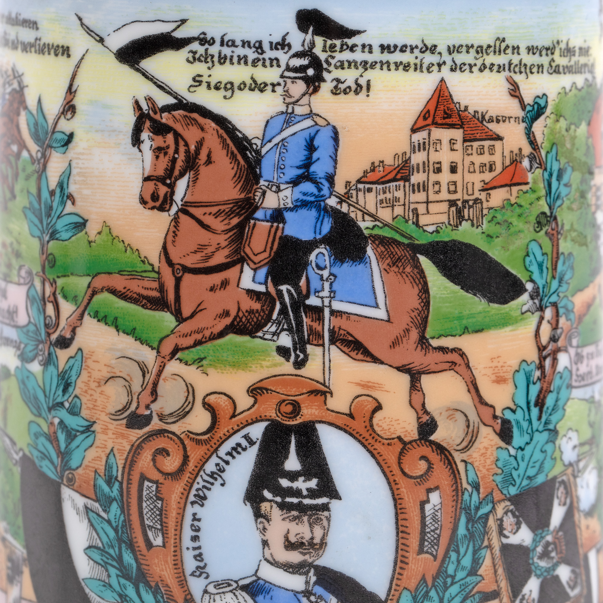 1. Halbă din porțelan pentru rezerviști, ilustrând scene din trecutul militar al Regimentului 9 de Dragoni Regele Carol I (numit și Regimentul 1 de Hanovra), 1910
