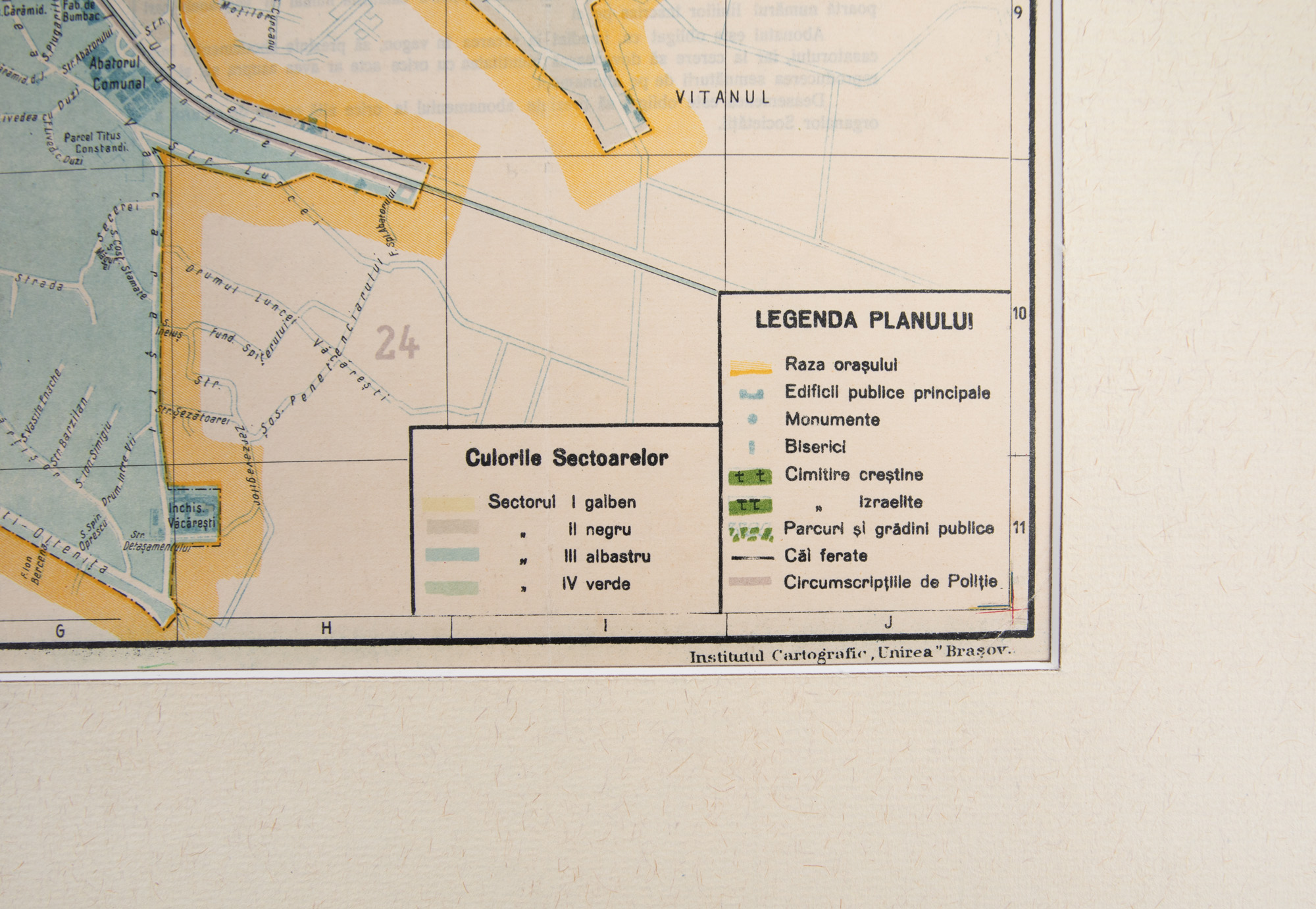 Harta cuprinde în detaliu rețeaua stradală a orașului așa cum arăta ea în epocă, precum și liniile transportului în comun. Piesa era realizată în 1934 de Institutul Cartografic "Unirea" din Brașov.