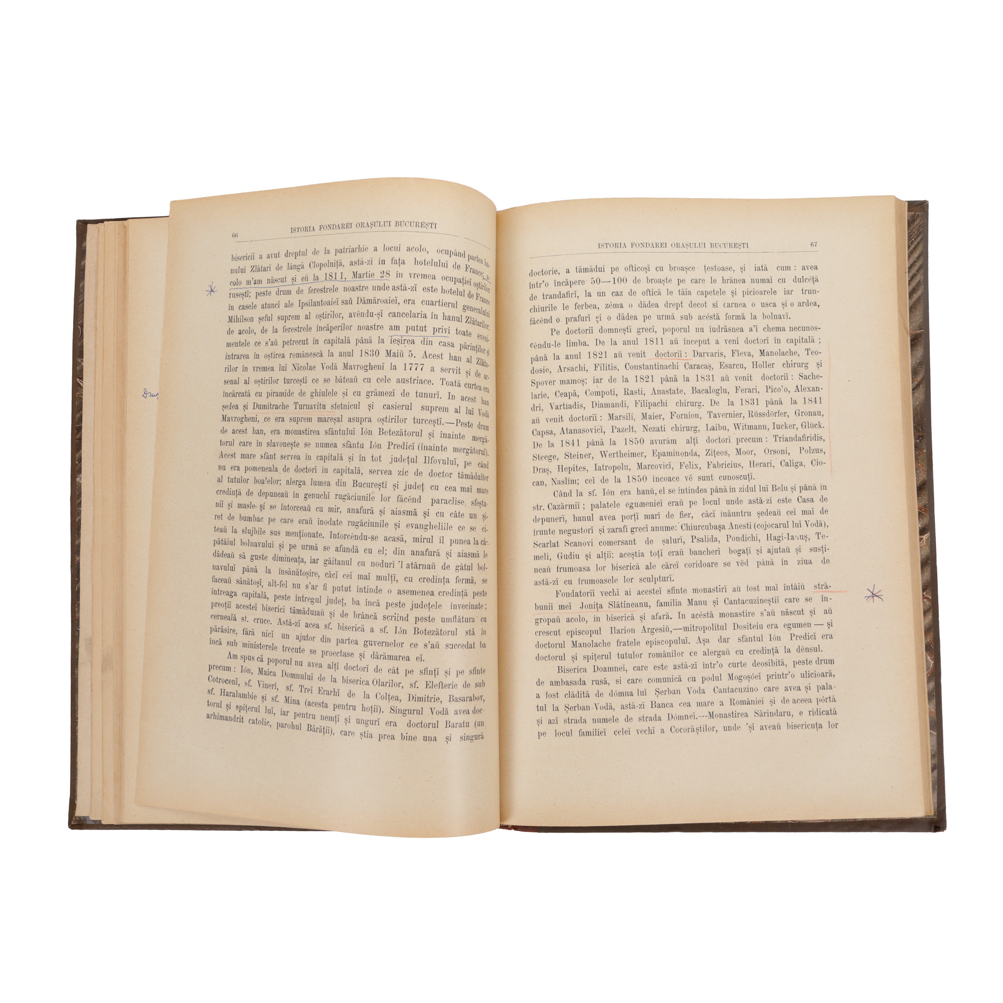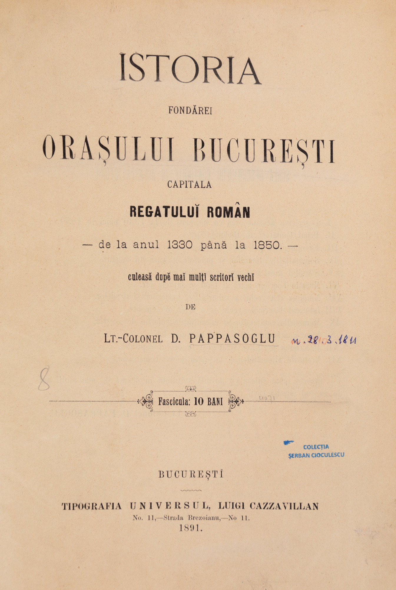 22. "Istoria fondărei orașului București", de Dimitrie Papazoglu, București, 1891, cu ex-libris, provine din colecția criticului literar Șerban Cioculescu