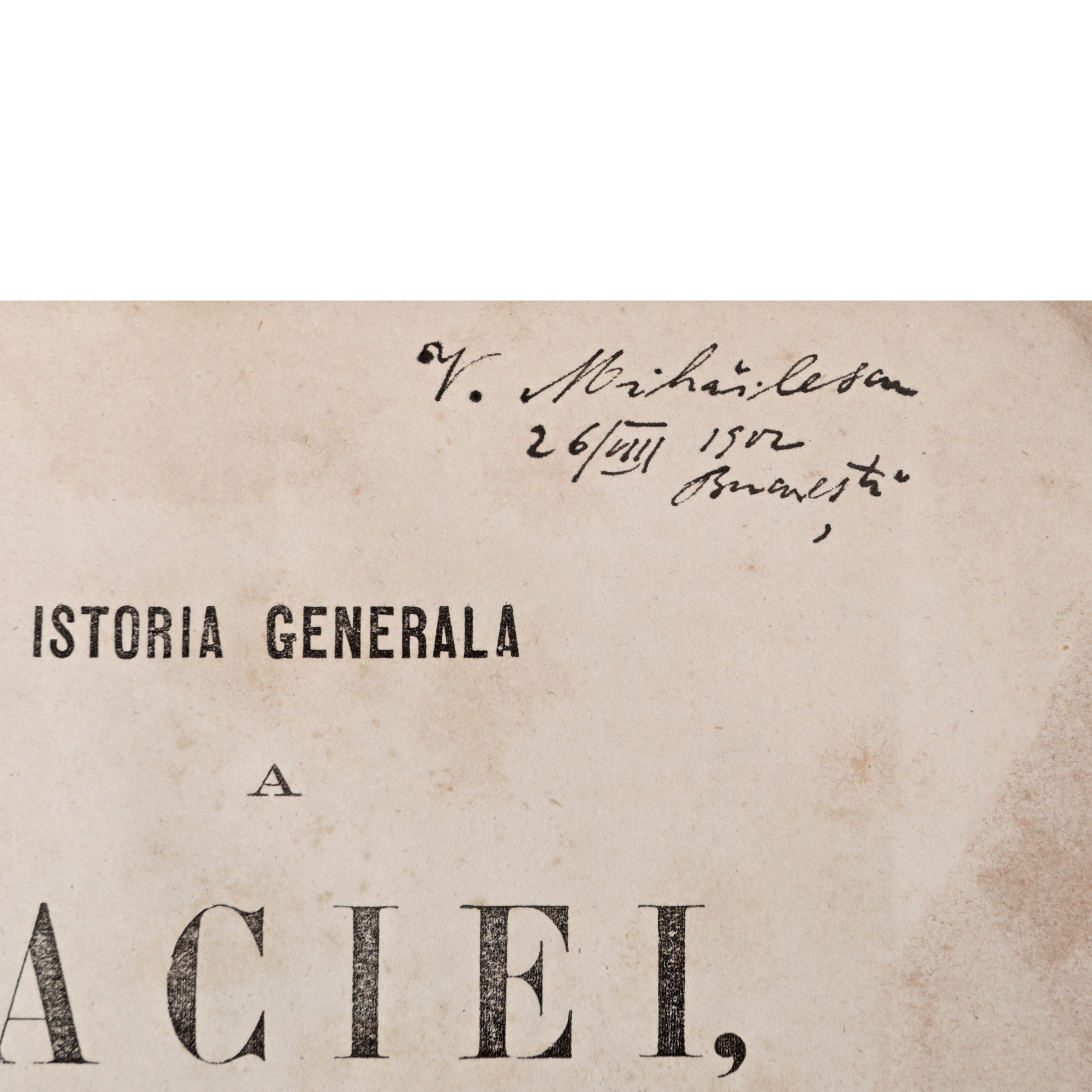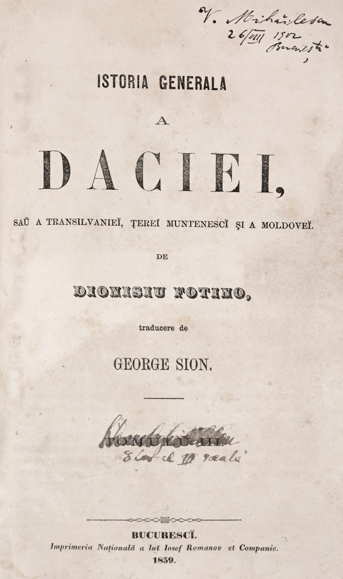 24. "Istoria generală a Daciei sau a Transilvaniei, Țerei Muntenesci și a Moldovei", de Dionisie Fotino (secretarul grec al domnitorului Ioan Caragea), traducere de George Sion, București, 1859, cu ex-libris V. Mihăilescu