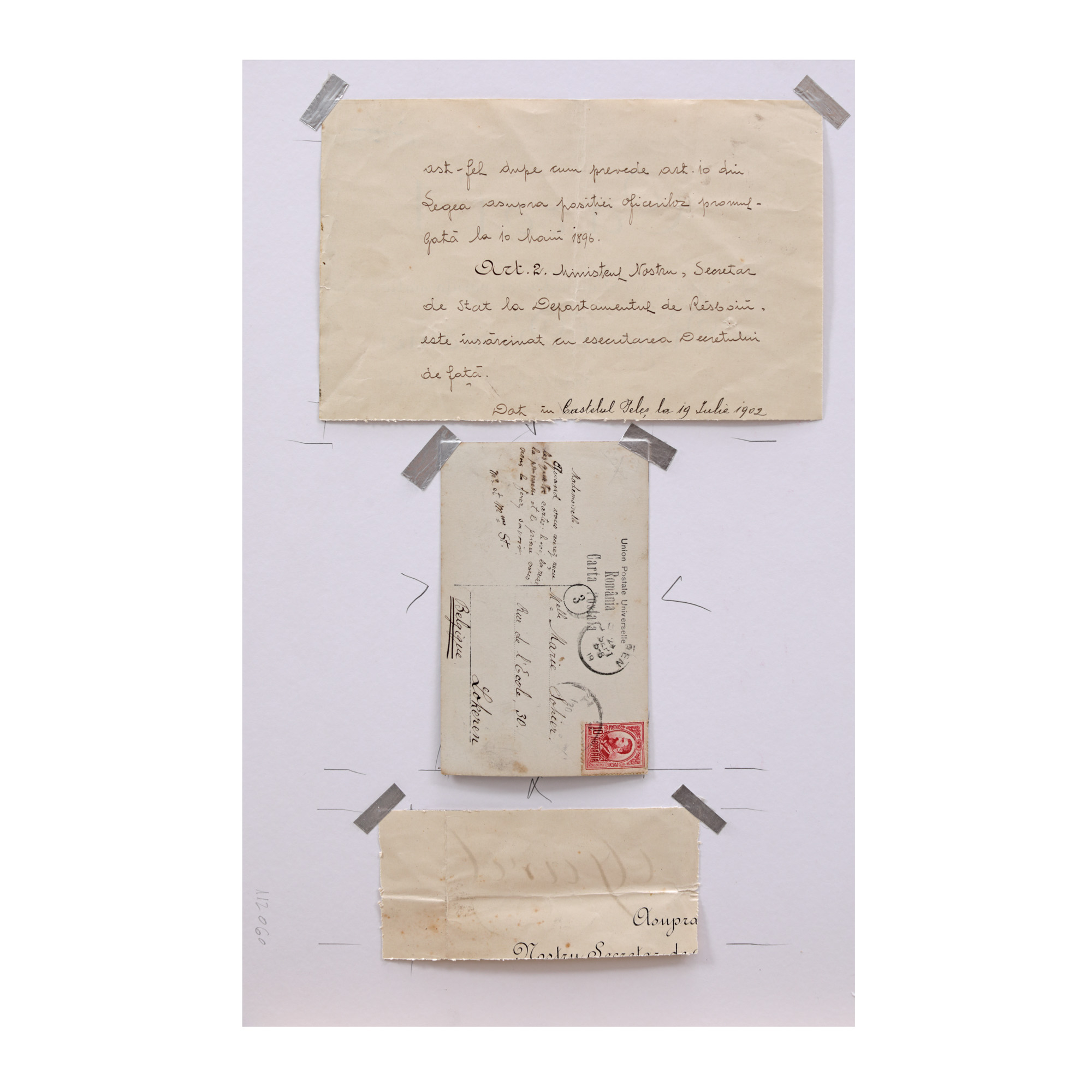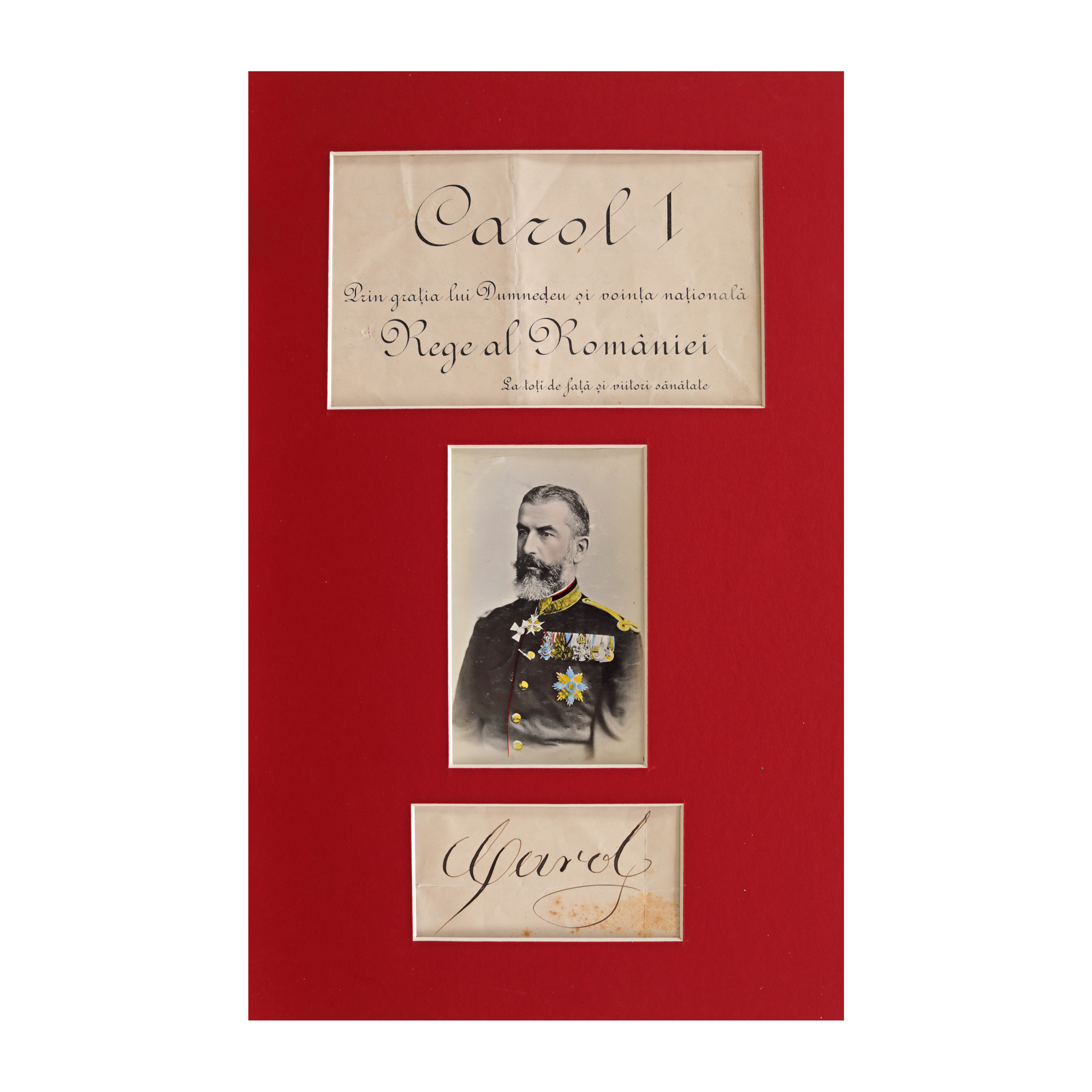 43. Lot format din carte poștală fotografică ilustrându-l pe Regele Carol I, semnătură olografă a acestuia și începutul unui document de epocă emis în numele regelui, cca. 1900-1902