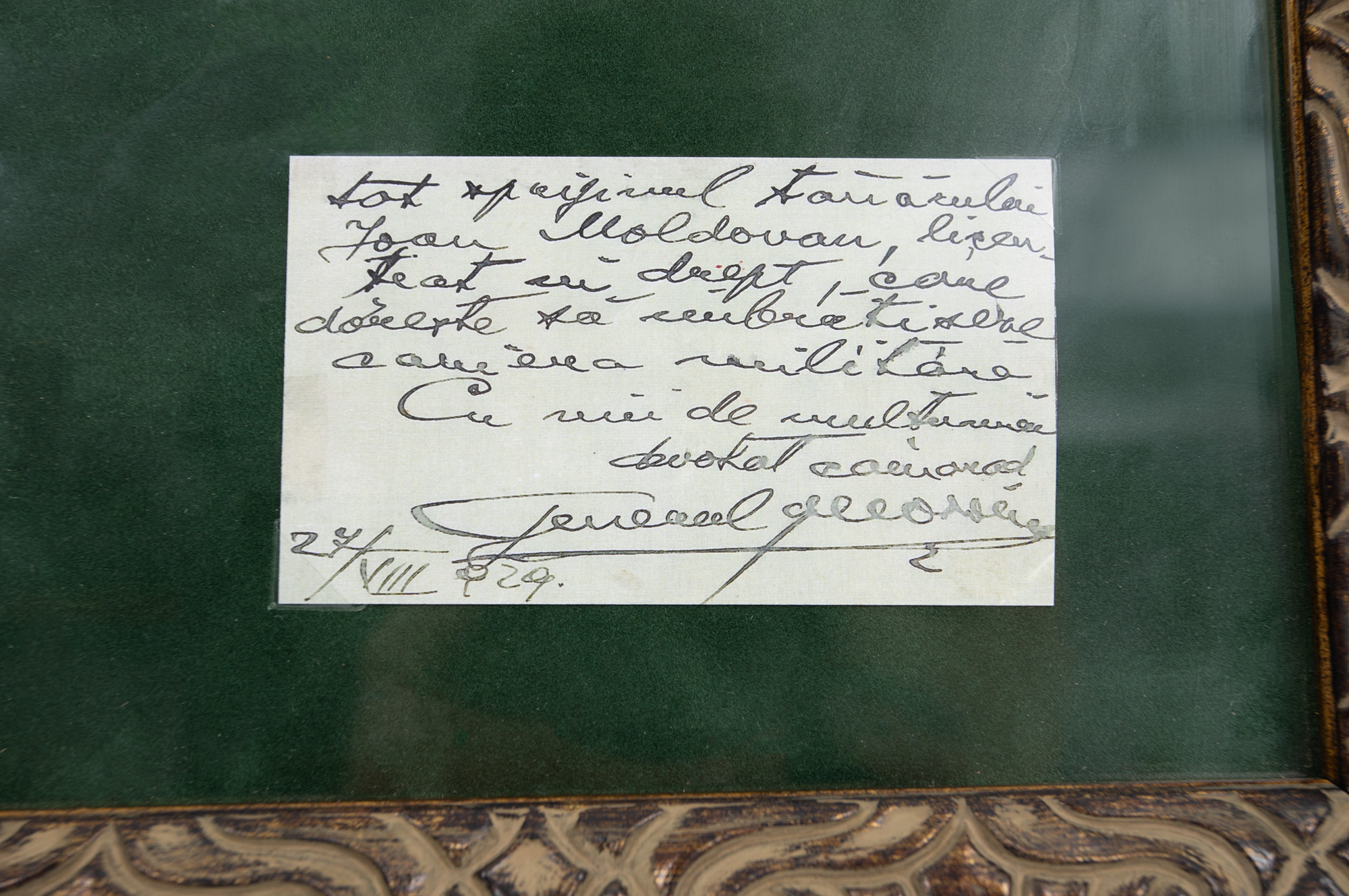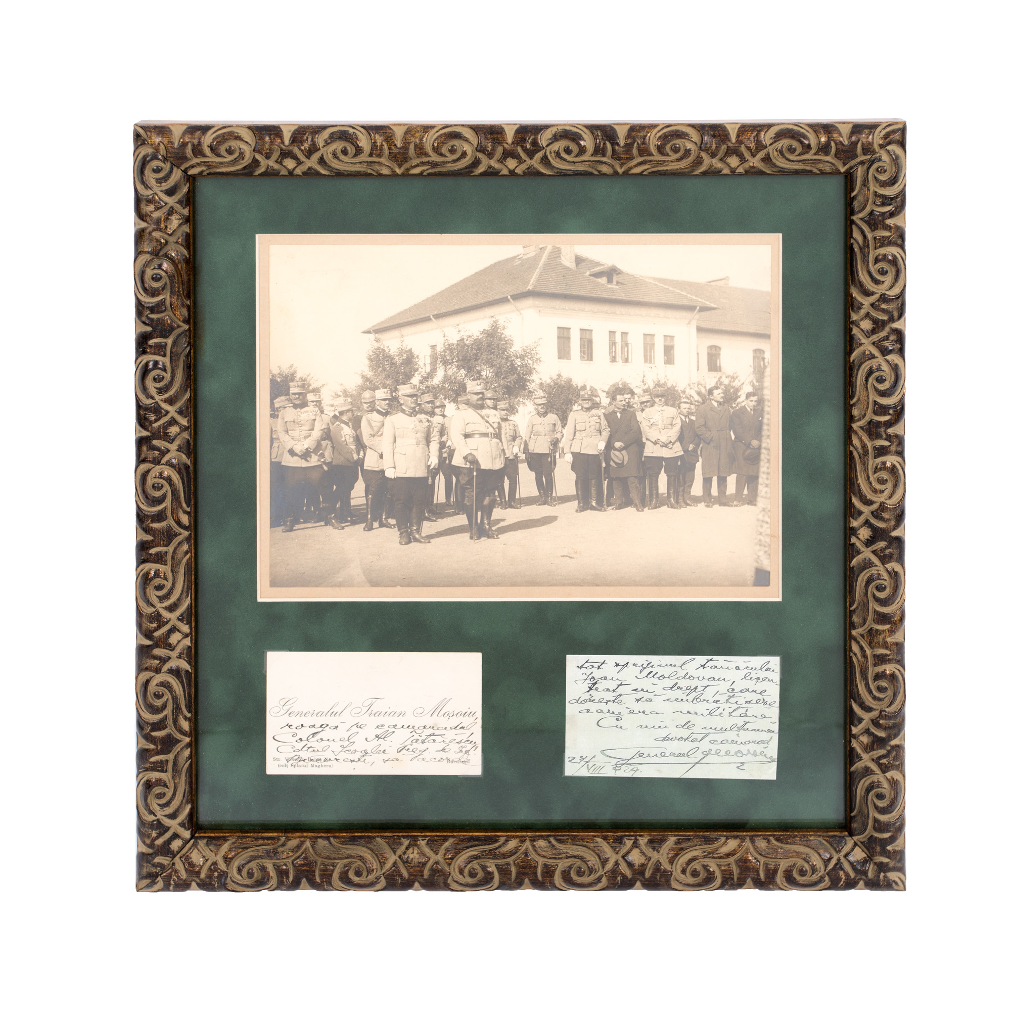42. Lot format din fotografie ilustrându-l pe generalul Traian Moșoiu într-un grup de ofițeri, carte de vizită a acestuia cu o însemnare olografă și bilet olograf semnat de acesta, 1929