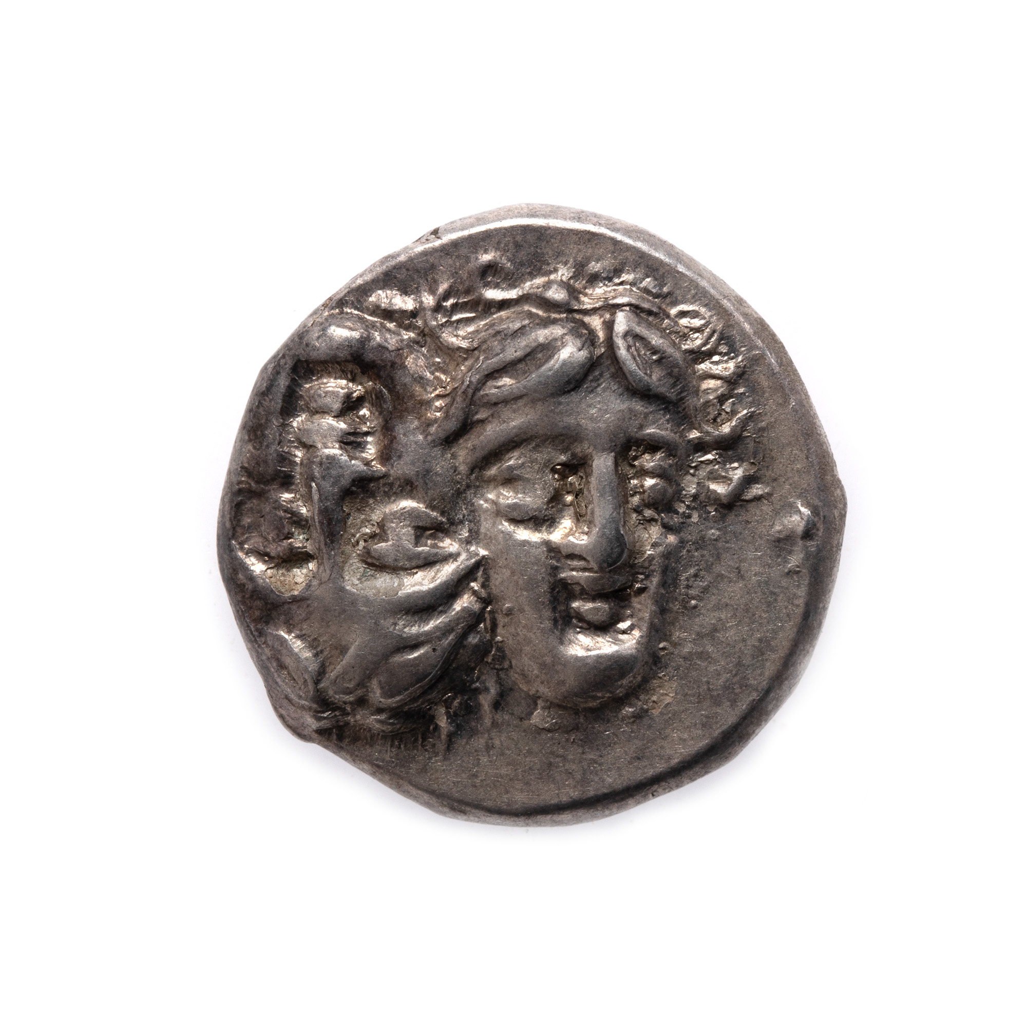 28Т. Monedă Drahmă, tip Gemenii - cele două fețe ale Dunării, Histria, 313-280 î.e.n., prima monedă bătută pe teritoriul actual al României, argint