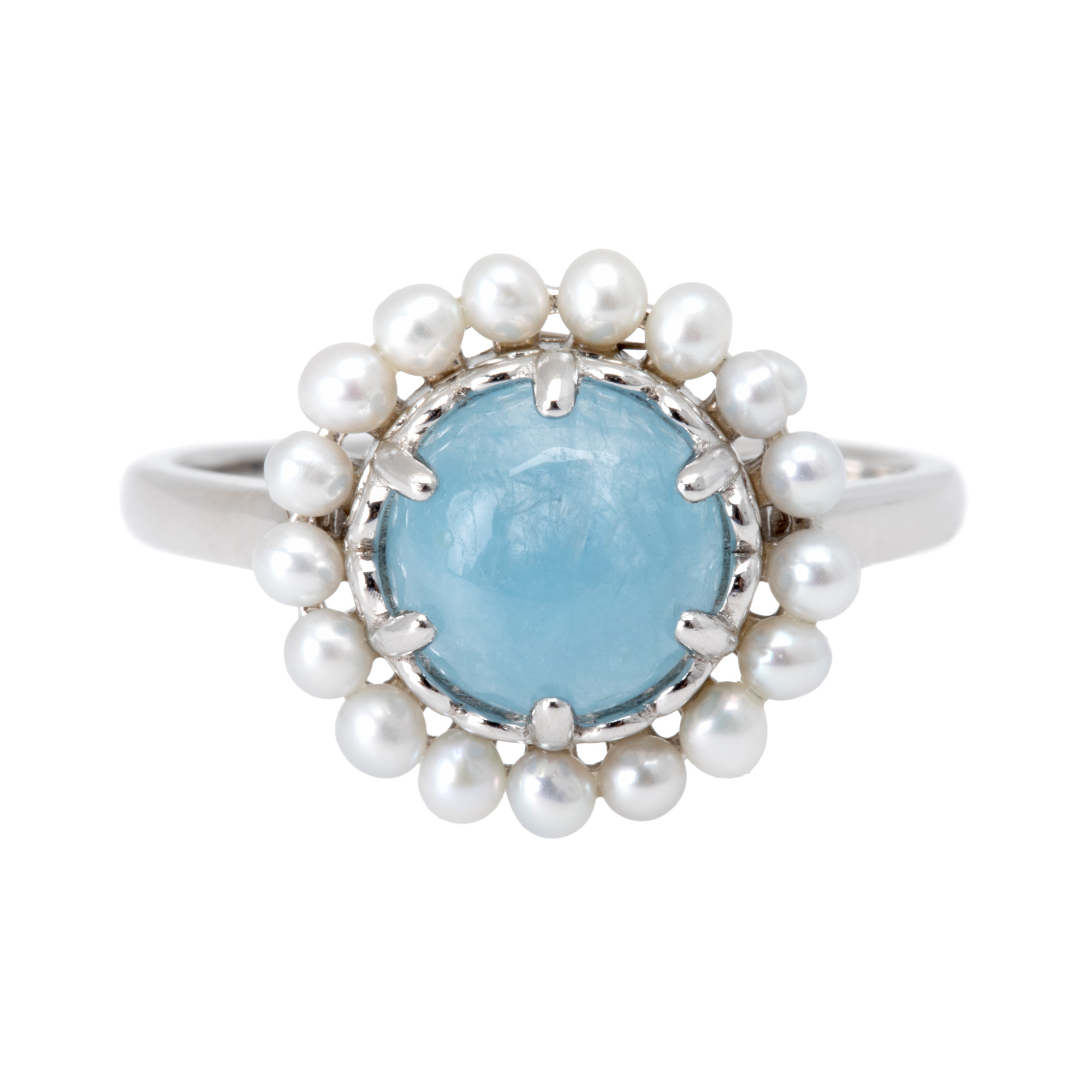 1. Inel din argint, decorat cu acvamarin caboșon și perle