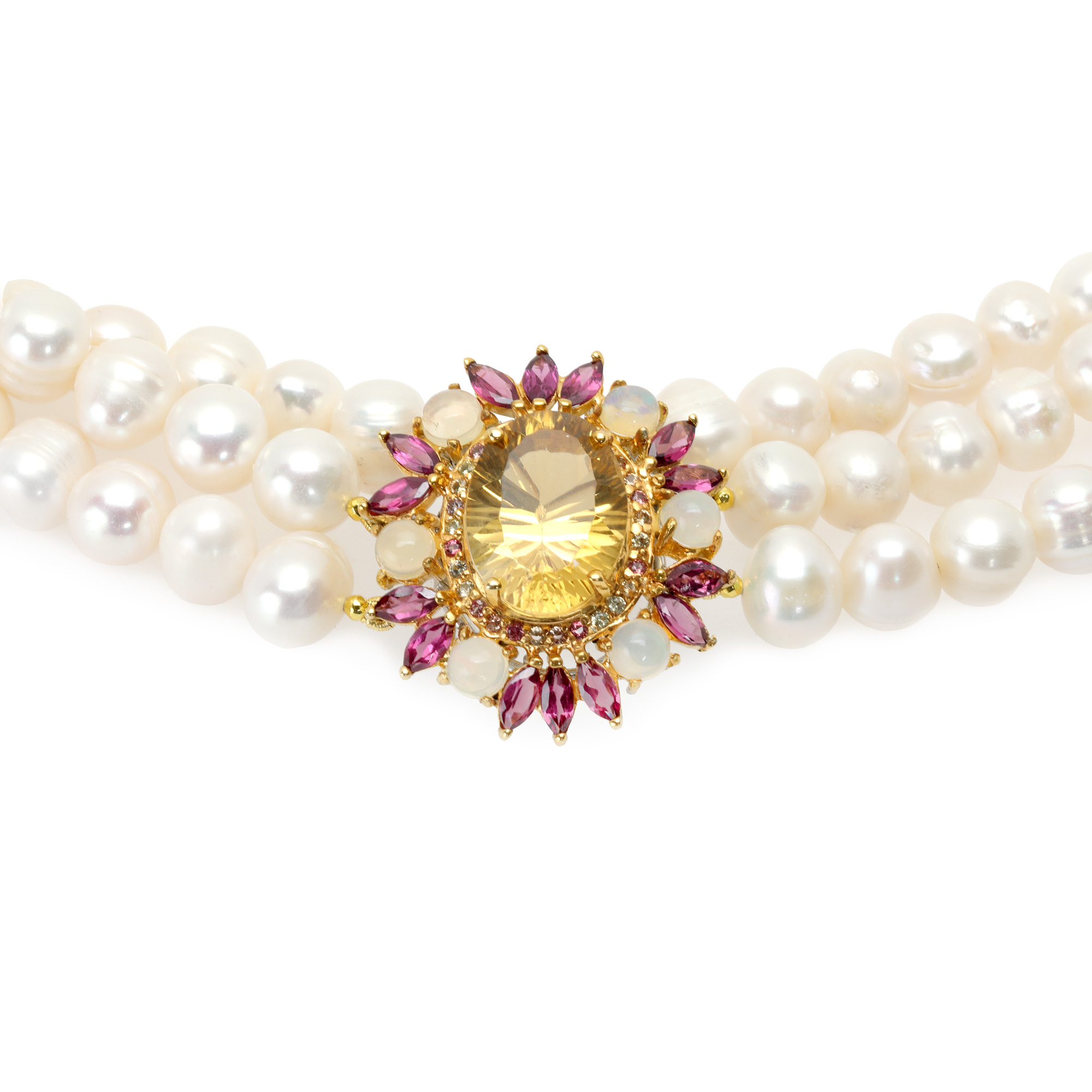 23. Colier din perle, cu închizătoare din argint aurit, decorată cu citrin central, anturat de opale, safire și granate