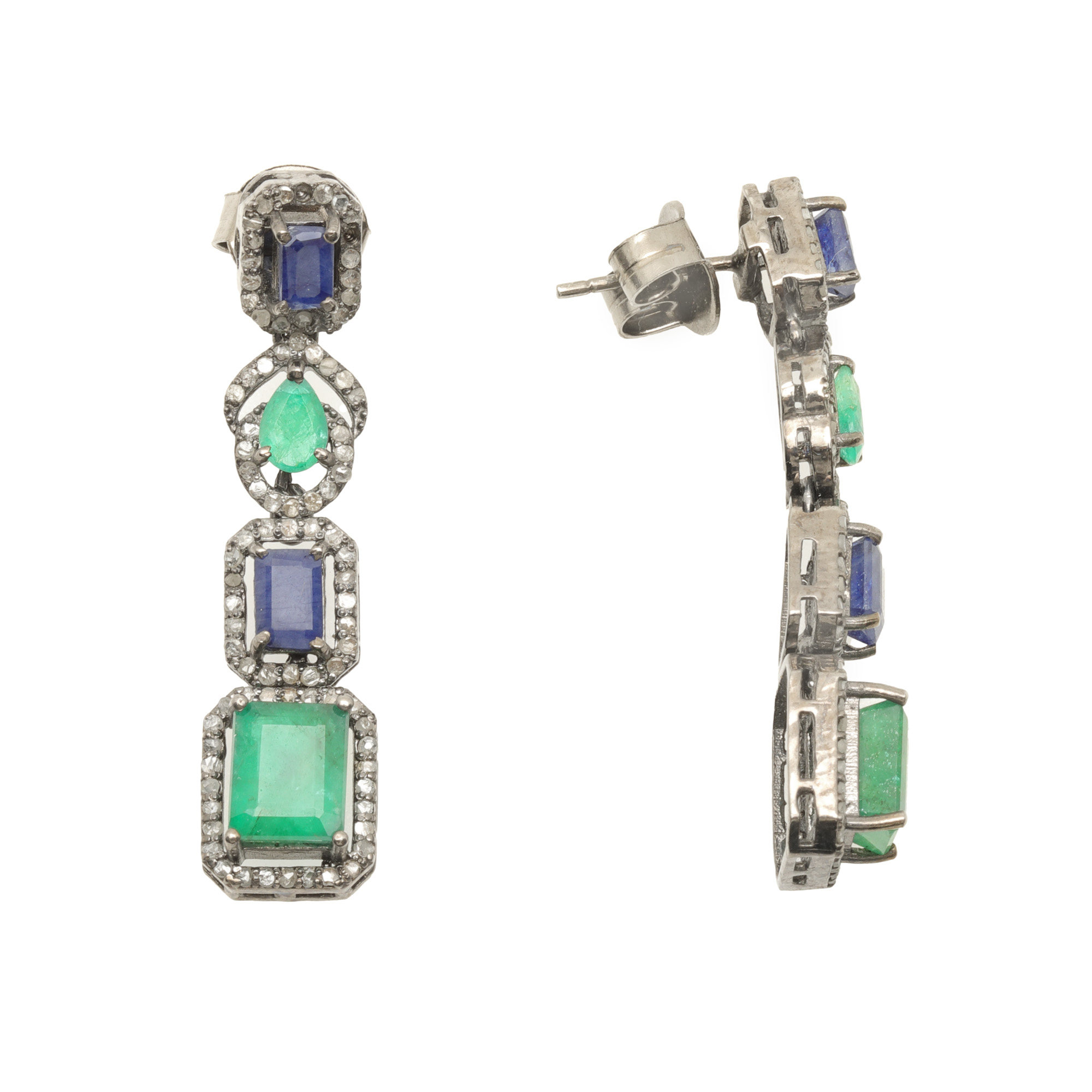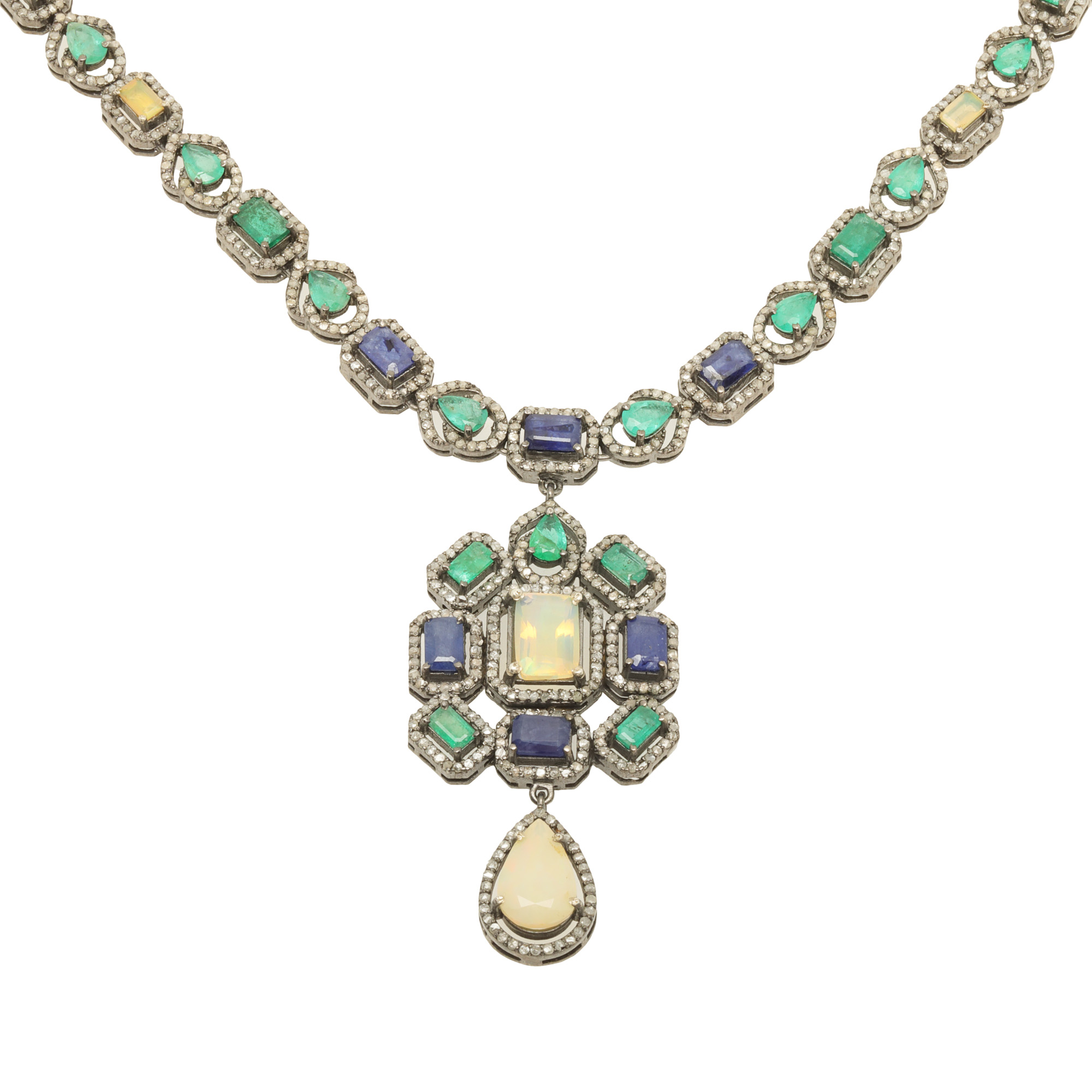 21. Impresionant set format din colier și pereche de cercei din argint, decorat cu smaralde, safire, diamante și opale