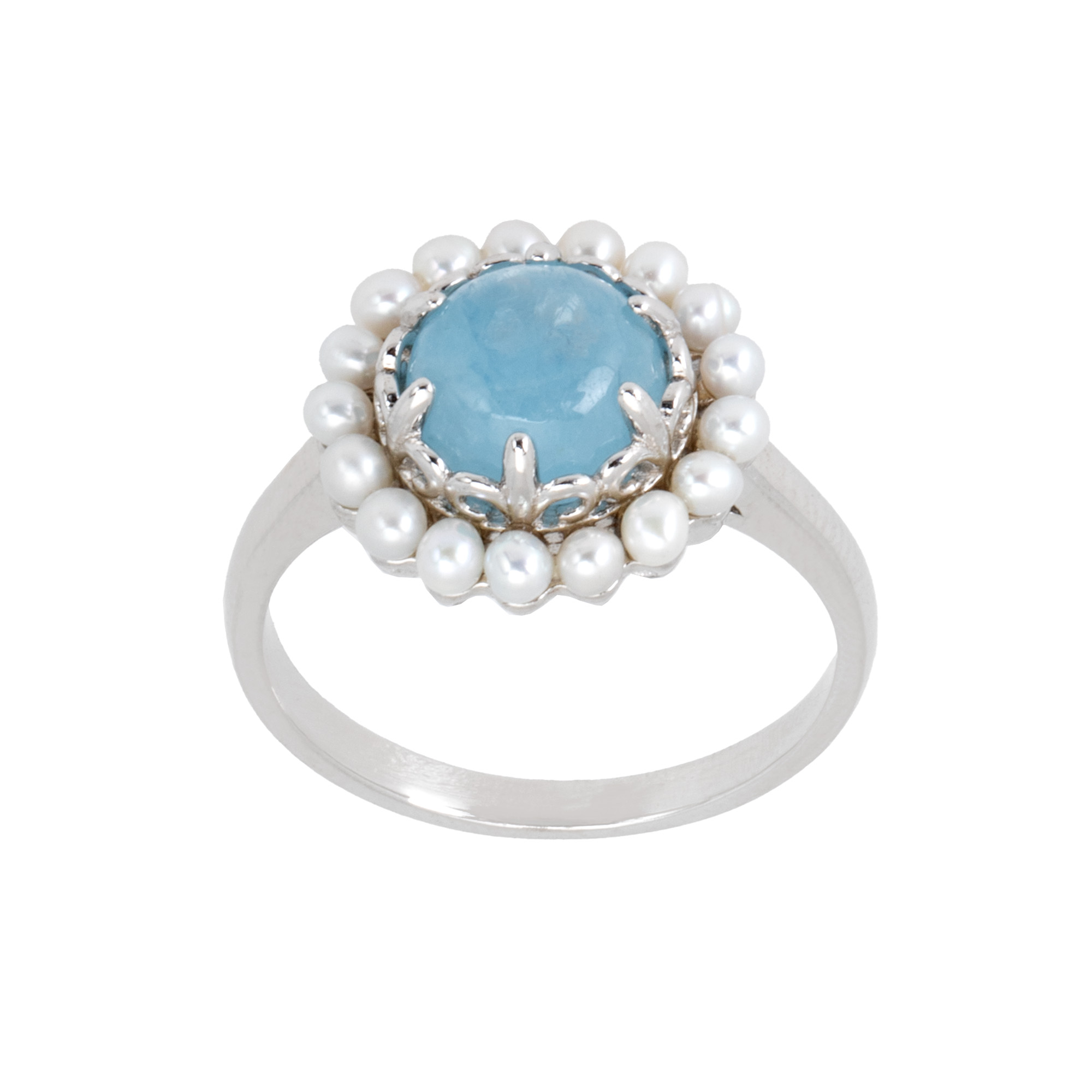 1. Inel din argint, decorat cu acvamarin caboșon și perle
