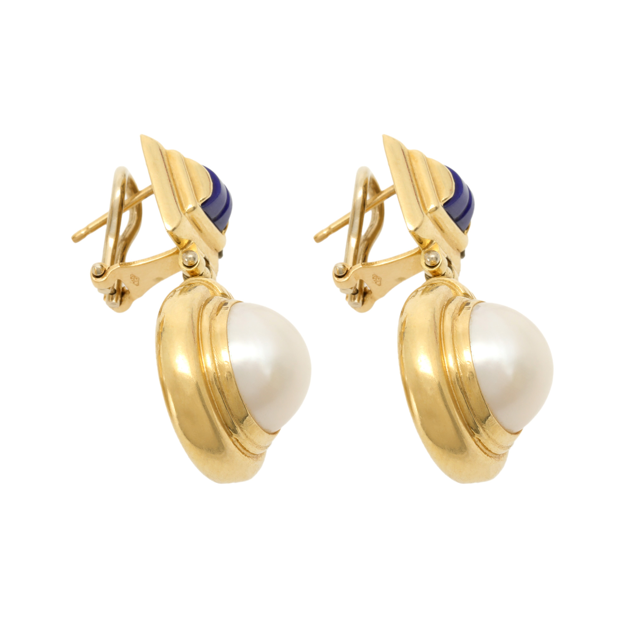 2 perle rotunde de cultură Mabe, culoare albă, cca. 11,29-11,49 mm.; lapis lazuli sculptat